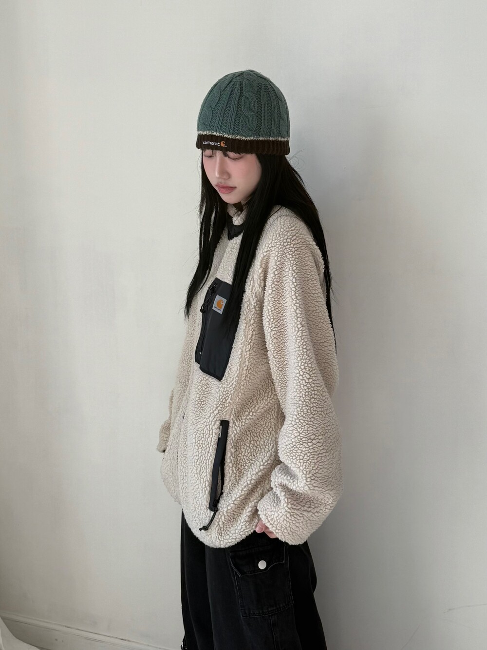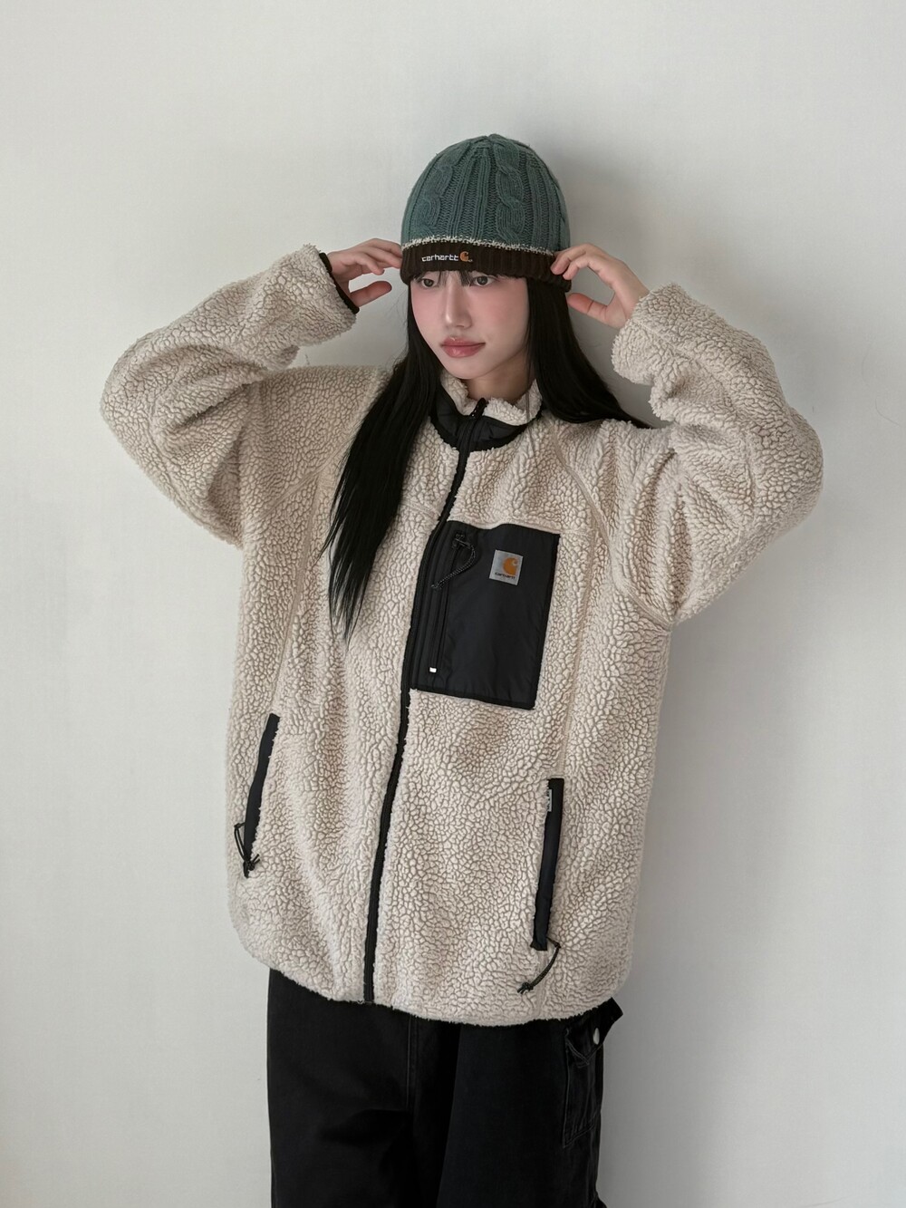 •칼하트 wip 뽀글이 자켓 이에요! 사이즈도 낭낭하니 루즈핏으로 입어주시면 되는 아이템이구, 외출할땐 패딩 안에 입어주시고 실내에서는 단독으로 툭👍🏻