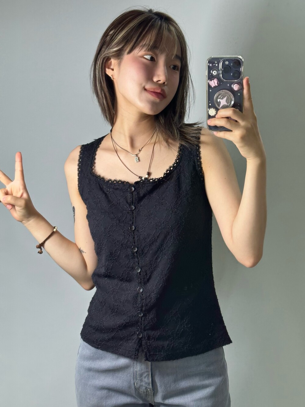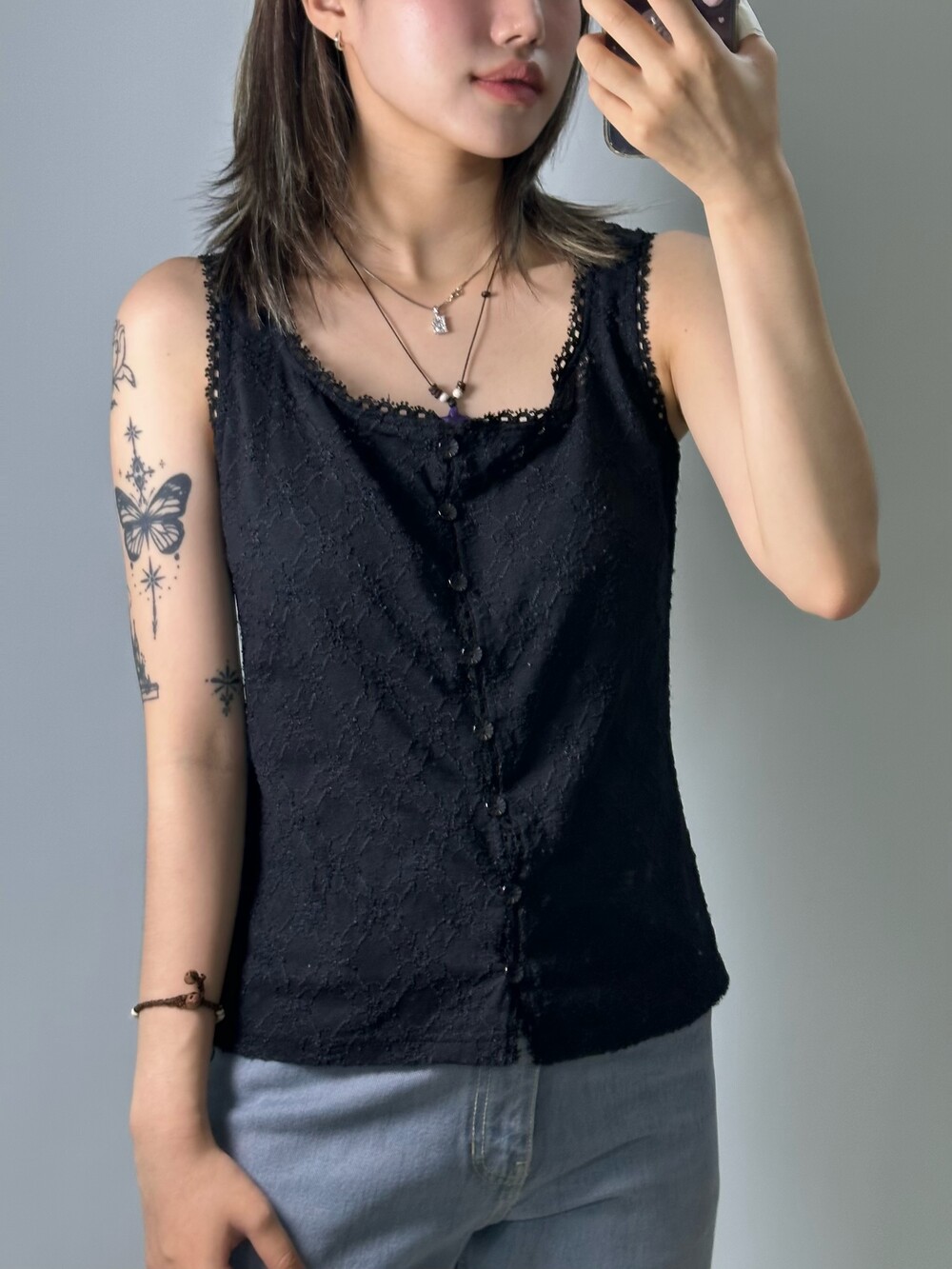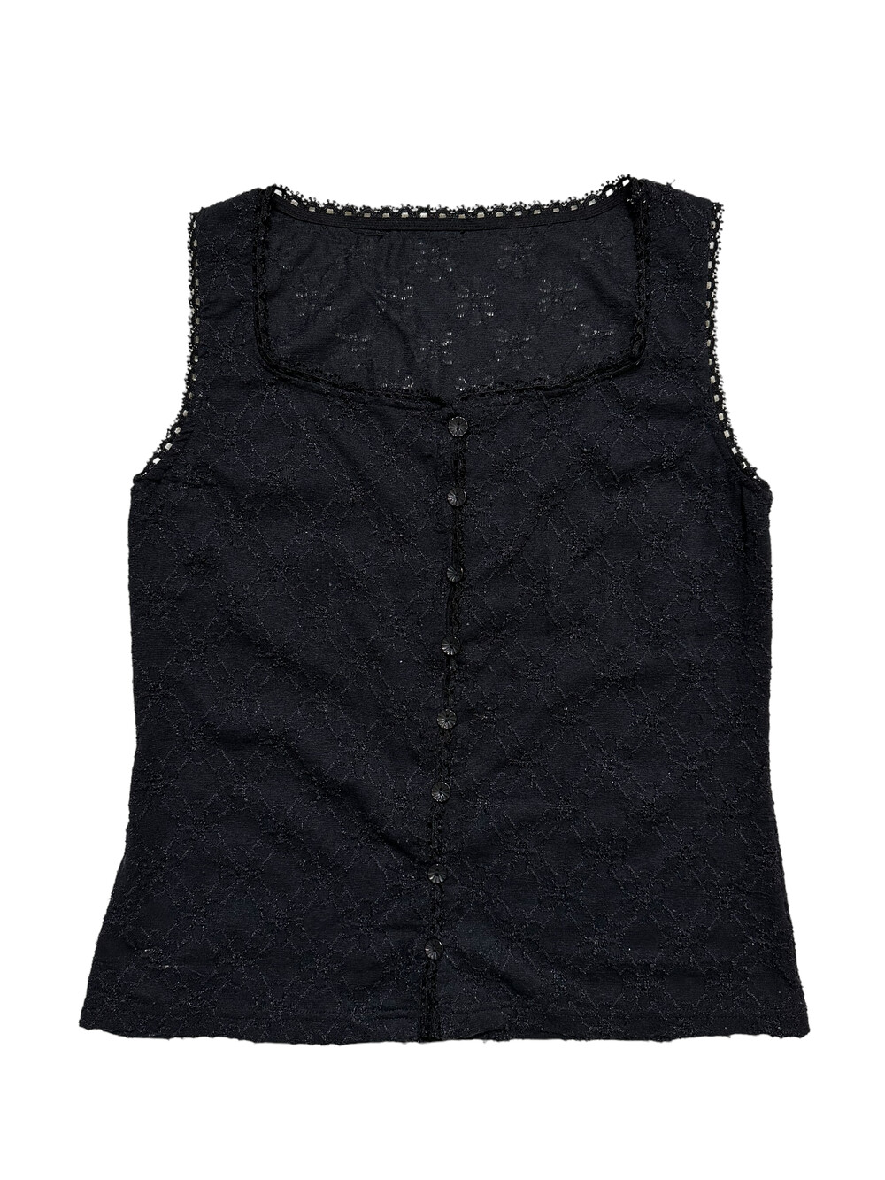 •블랙 컬러라 시크한 분위기도 연출하기 좋고 플라워 패턴으로 짜여진 제품이라 사랑스러운 분위기도 낭낭한 민소매에요! 여름에 시원하게 착용하기 너무 좋은 제품이랍니다 🖤