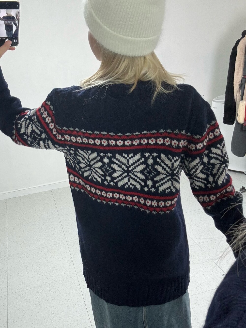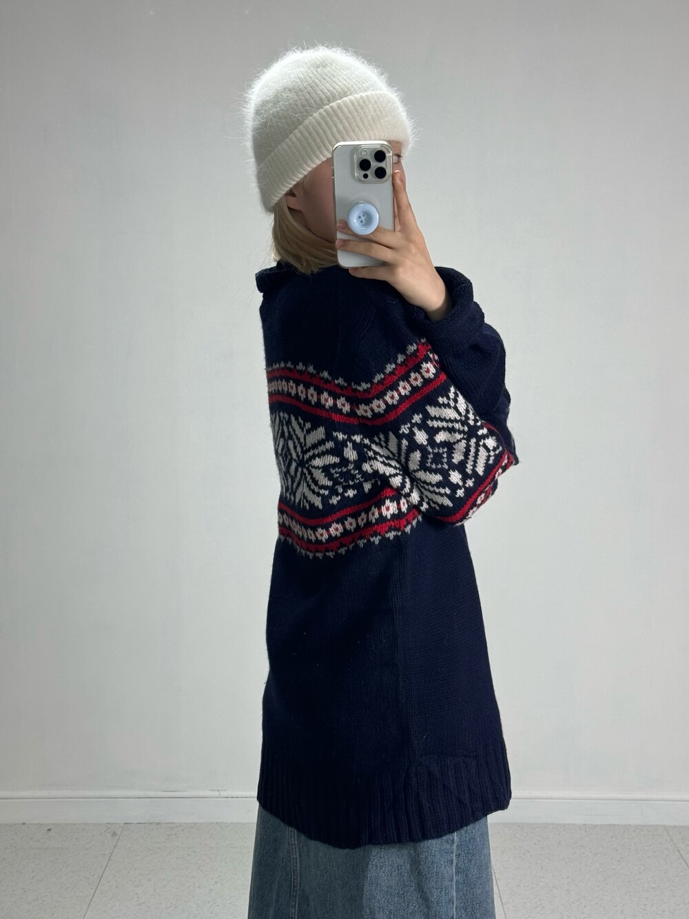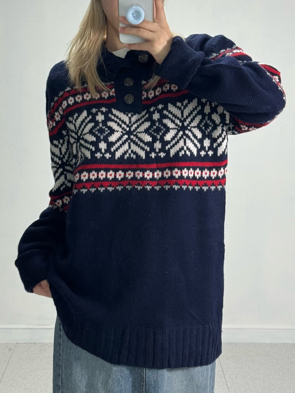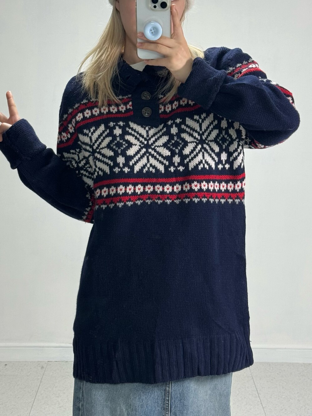 •왕눈꽃패턴 귀여운 니트에요! 소매가 길어서 전체적으로 핏이 어벙할 수 있지만 살짝 접어주시면 괜찮답니돠 히히 지금 입어주기 좋은 도톰한 원단이며 단추가 달려있어 귀여움+1