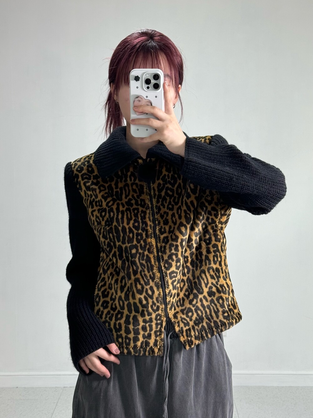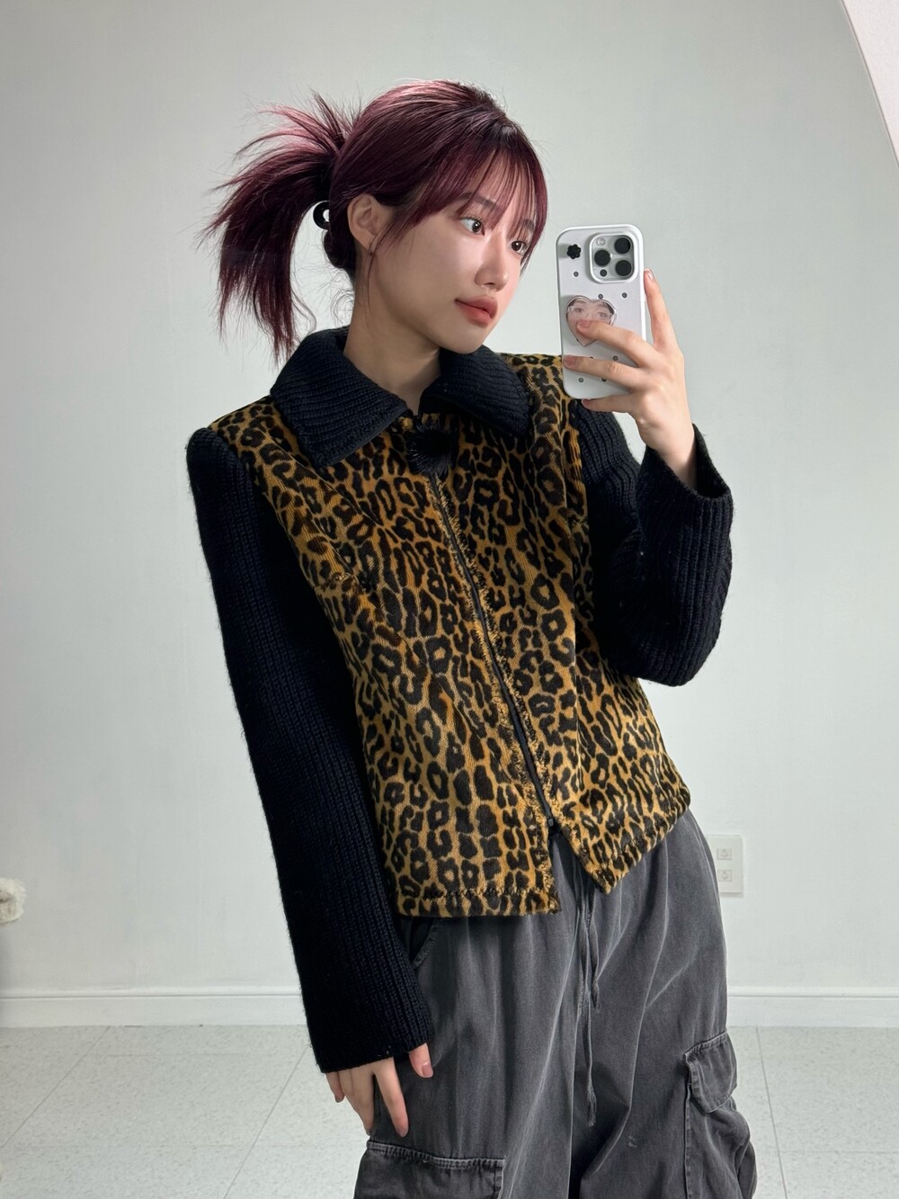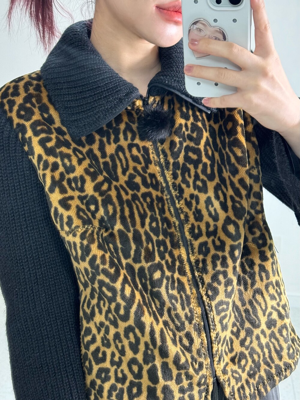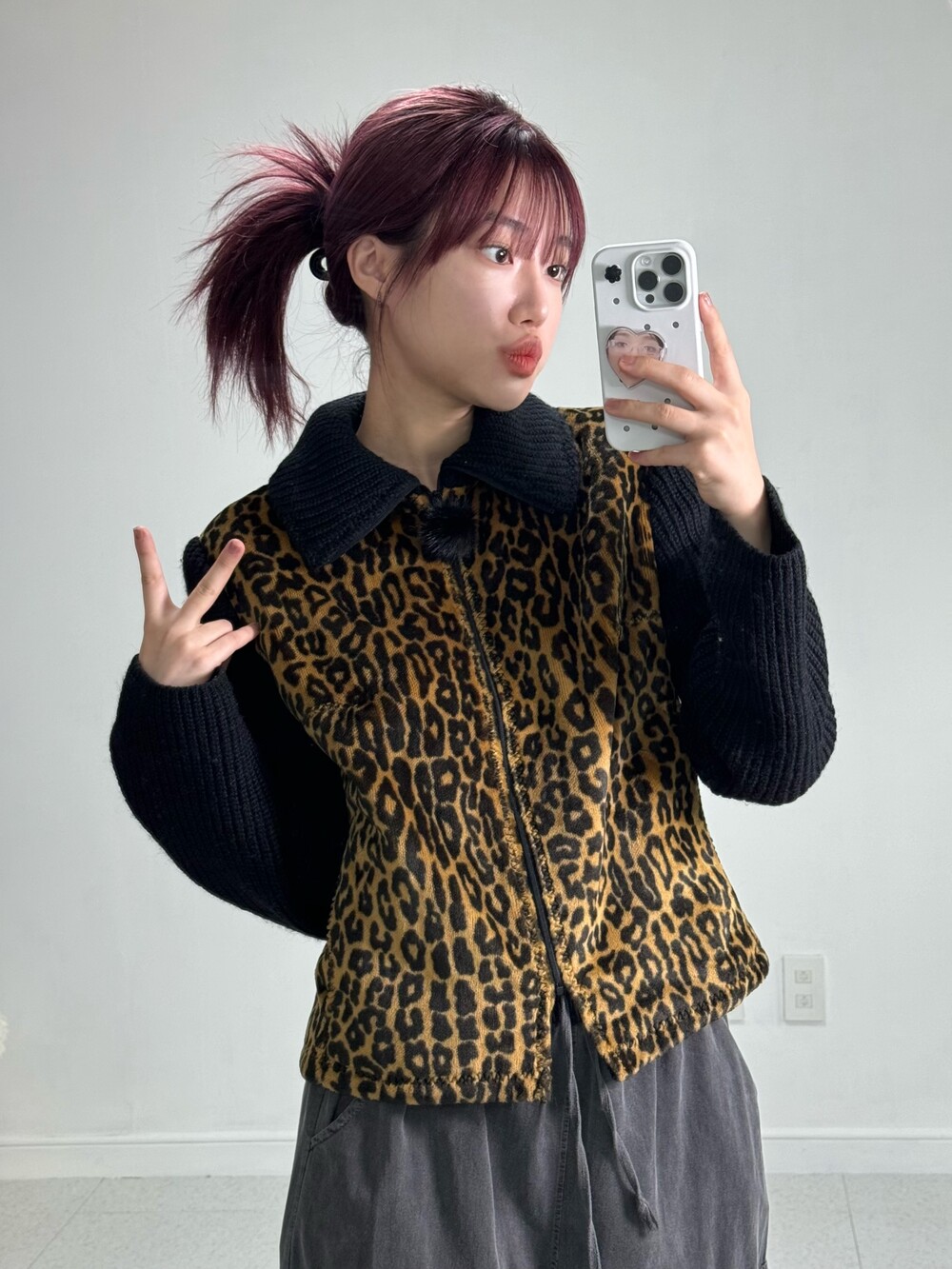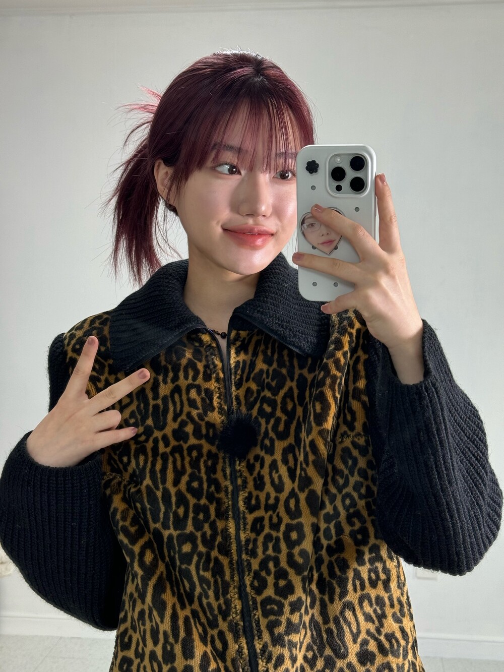 •소매부분은 블랙 니트, 호피는 짧은 에코퍼로 되어있습니다:) 지퍼에는 귀여운 폼폼퍼가 달려있어서 귀엽구, 밑단쪽이 자연스럽게 트려있는 디자인이라 착용했을때 어색함 없이 밑단 단추를 하나 풀어준듯한 루즈함을 연출하실 수 있는 아이에요 ㅎㅎ🖤
