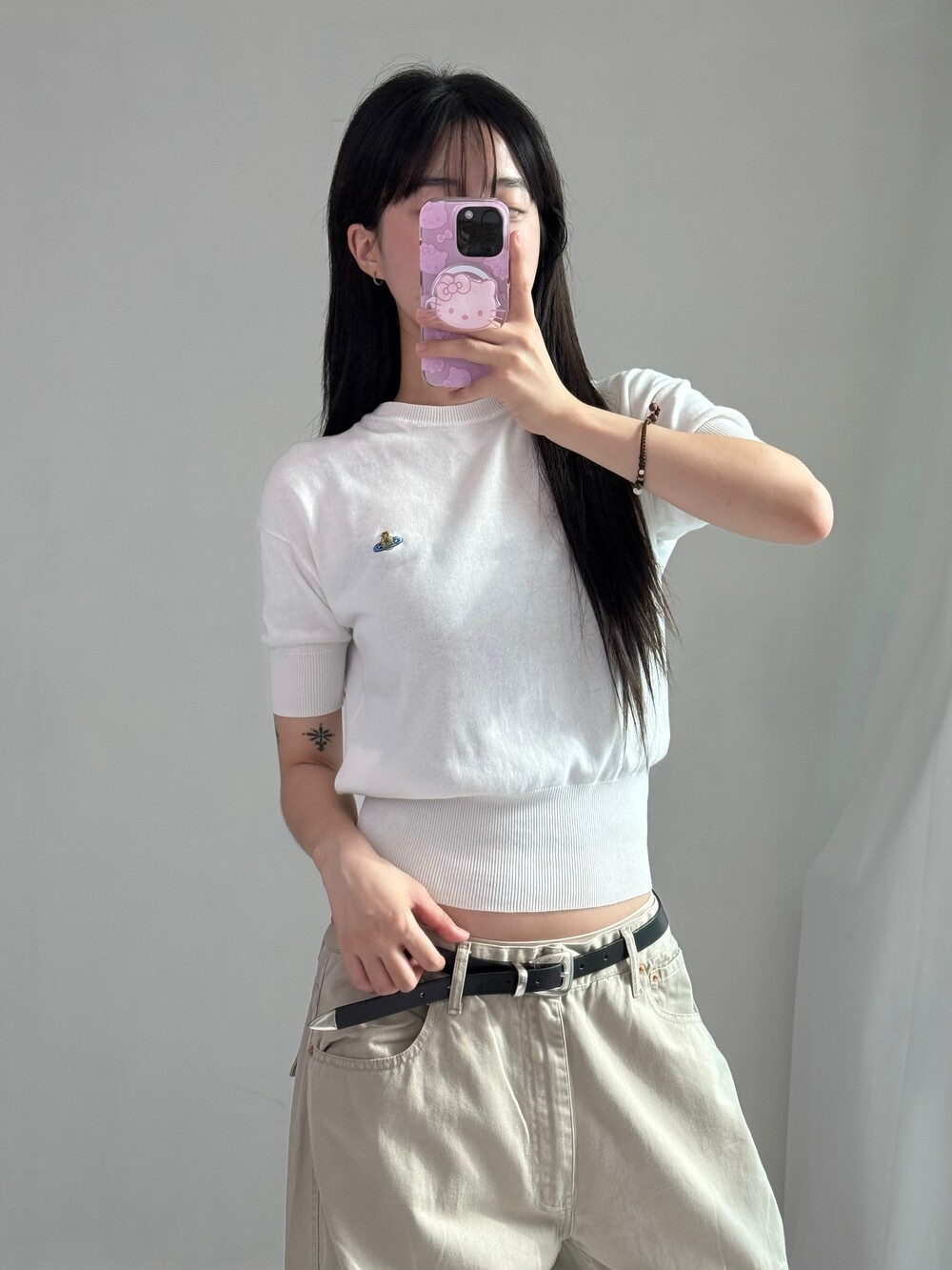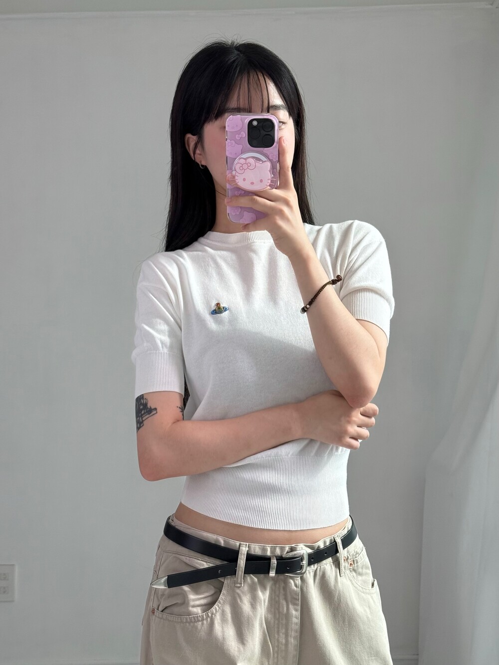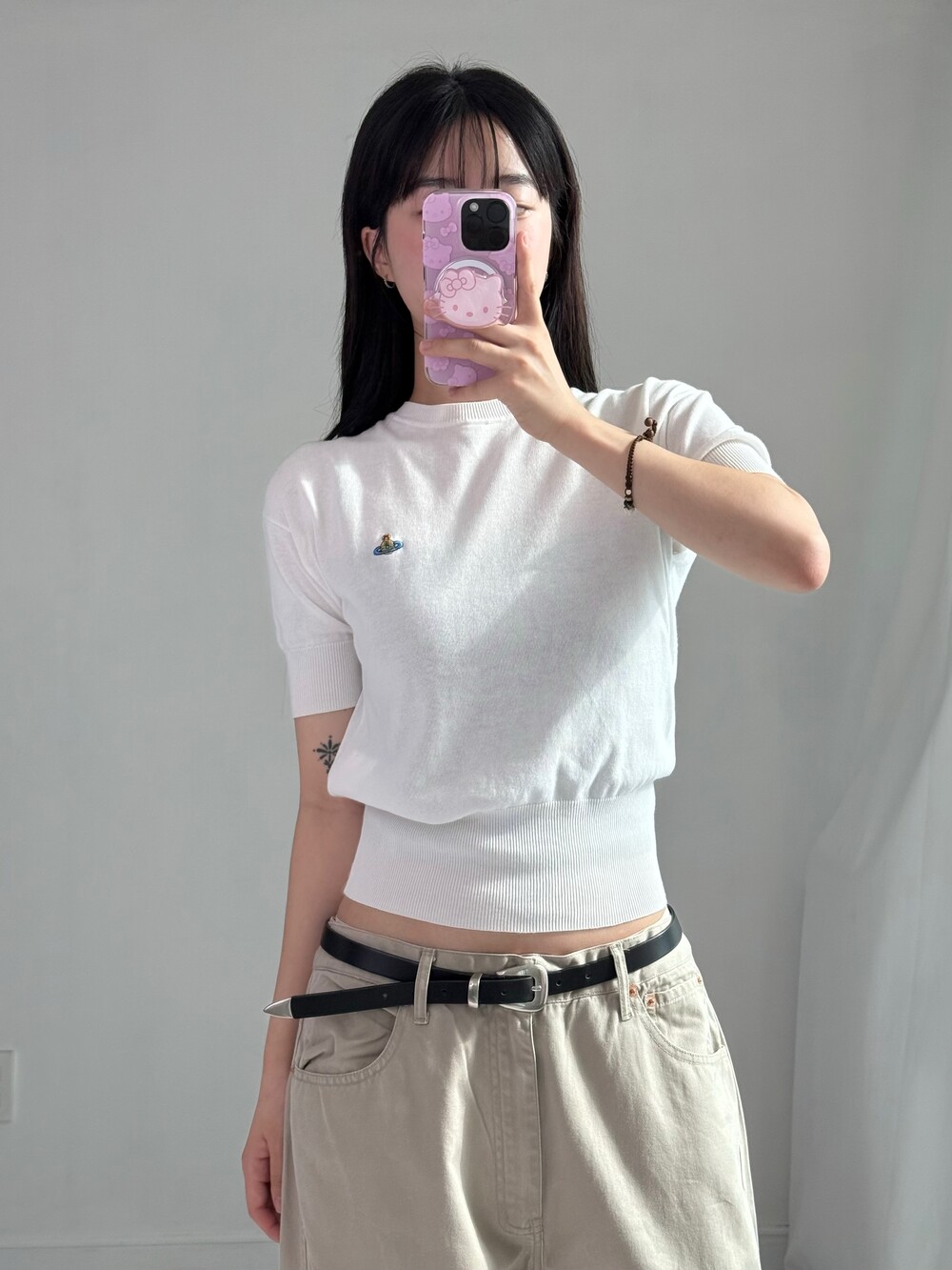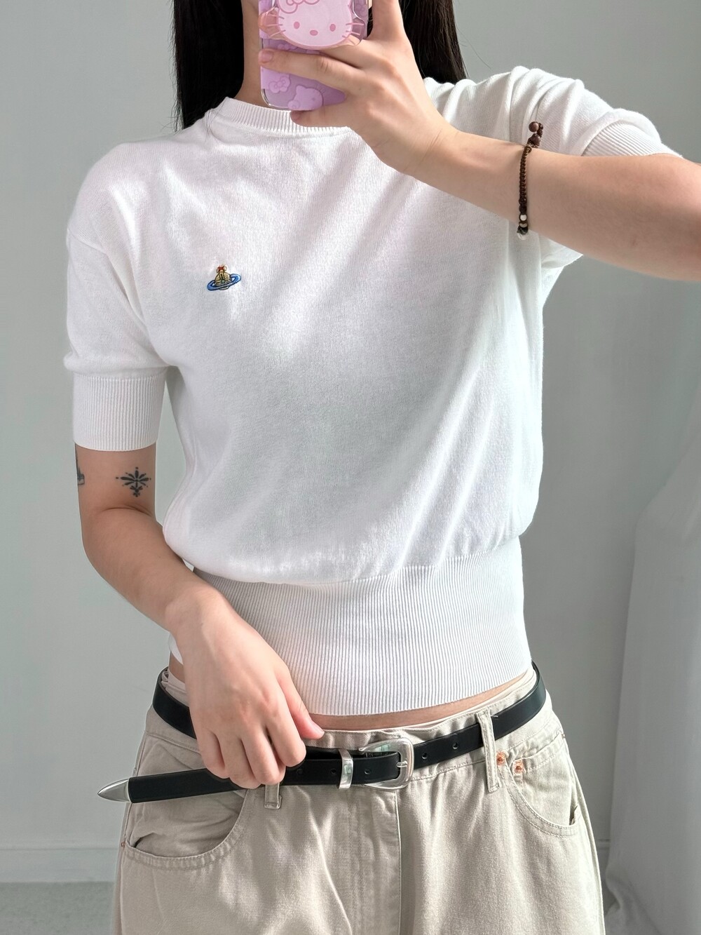 •비비안웨스트우드 정품 반팔 니트에요! 소매,밑단 시보리가 어느정도 팔뚝과 허리를 잡아줘서 말라걸로 만들어준답니다.. 여름에는 단독으로 나머지 계절은 가디건,아우터와 함께 입어주셔요!!