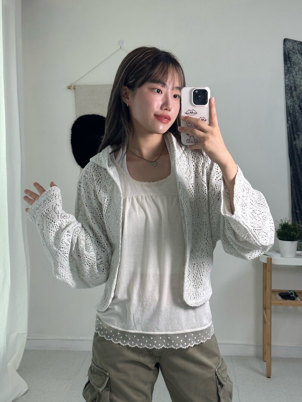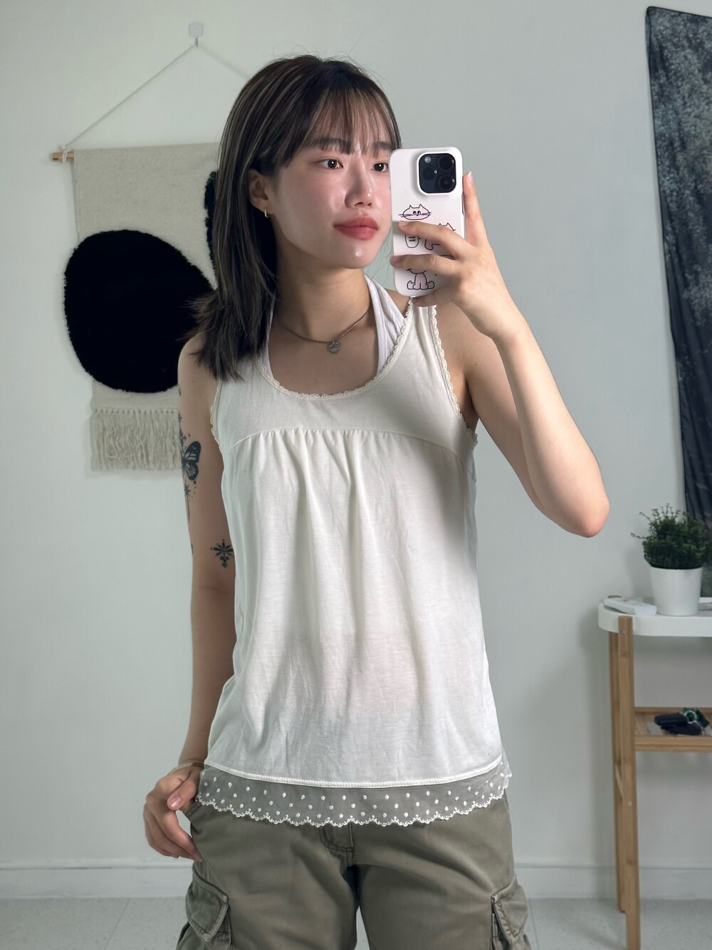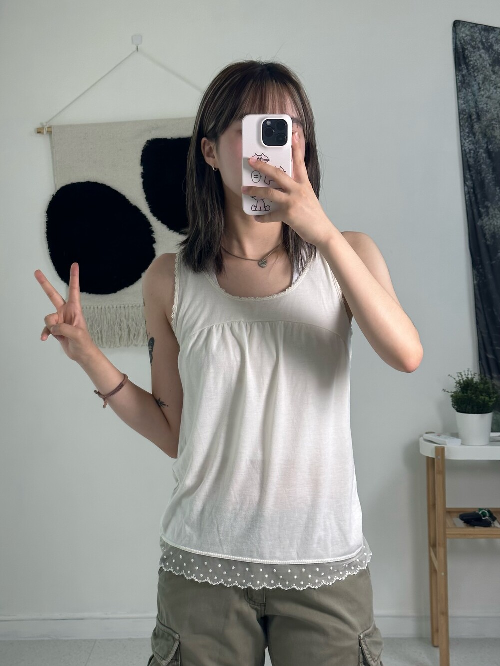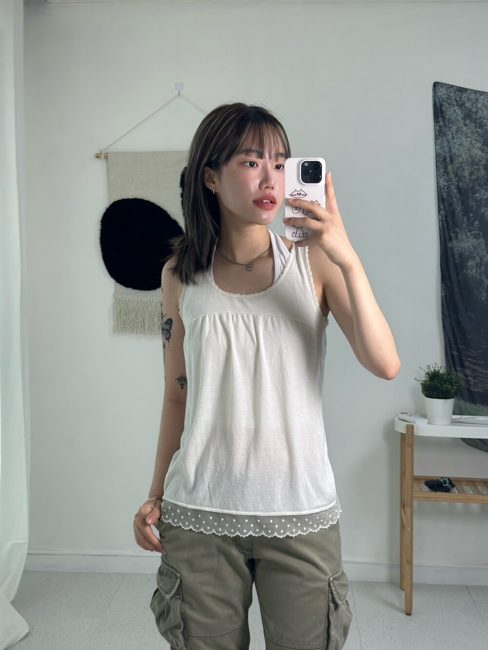 •레이스 달린 디자인이 사랑스러운 민소매에요! 단독으로 착용해주면 러블리하고 레이어드로 착용하면 에스닉한 분위기까지 연출하기 좋아요!