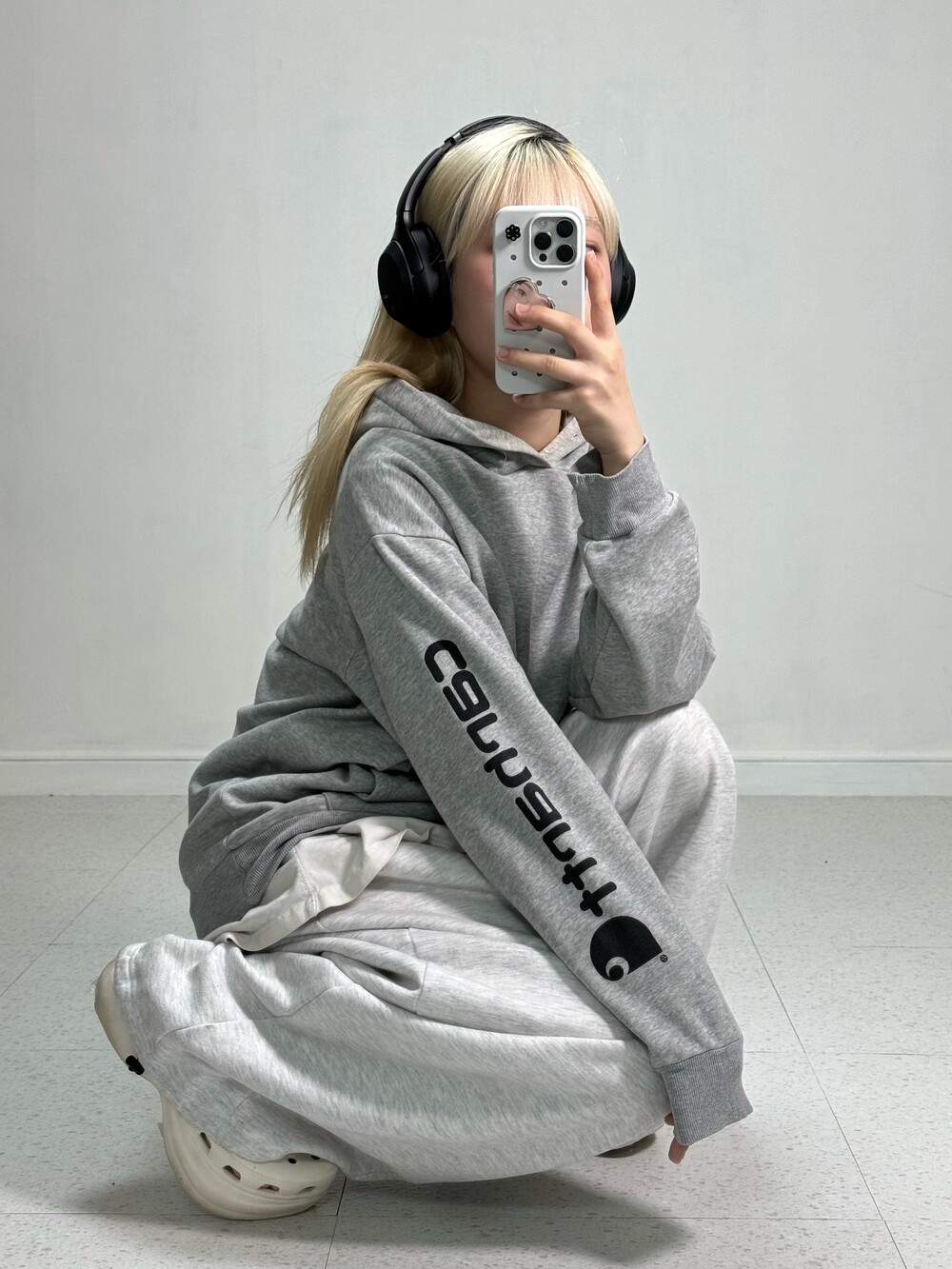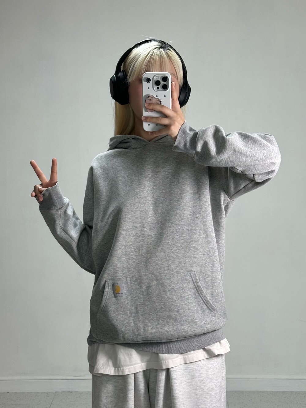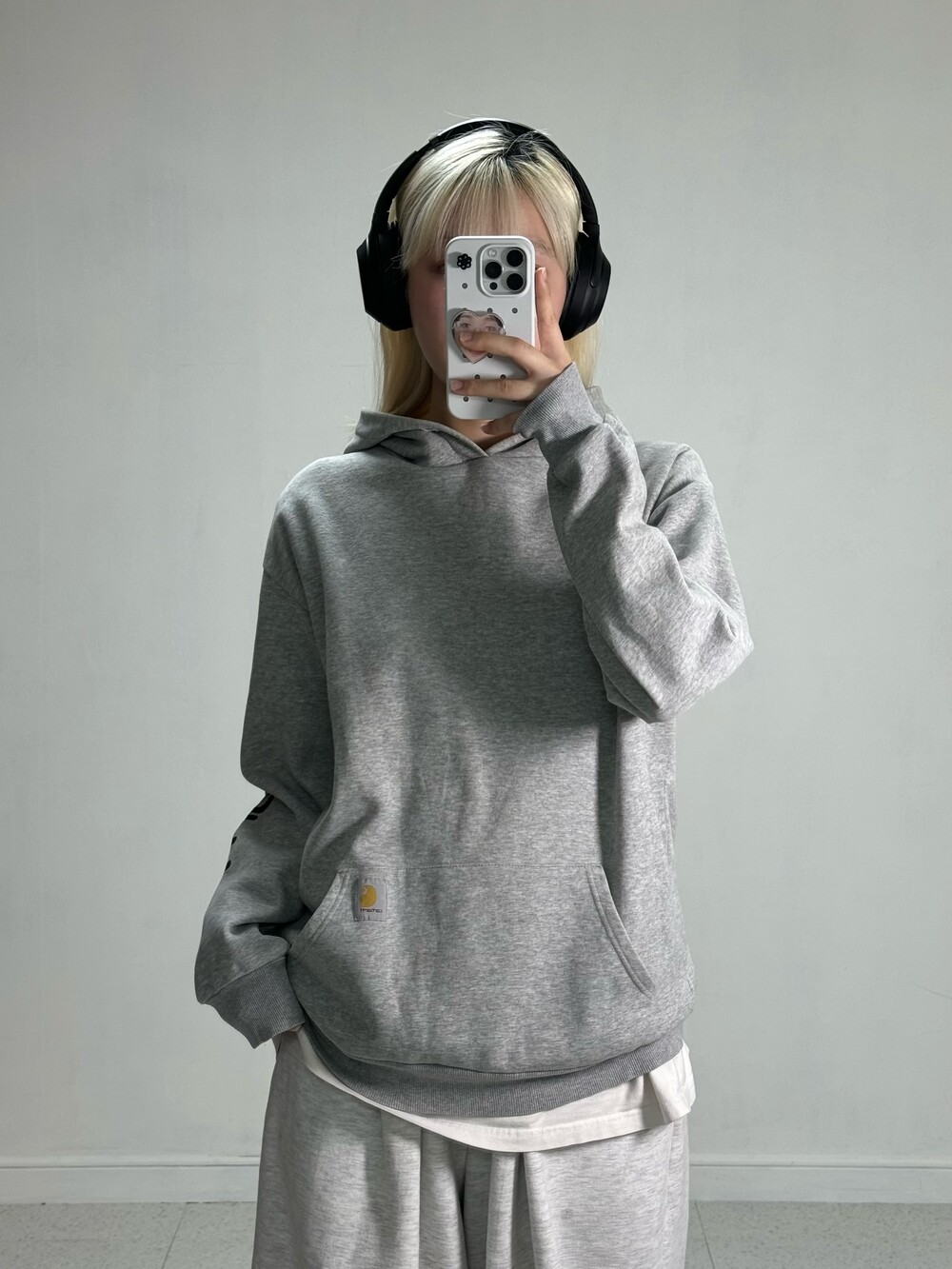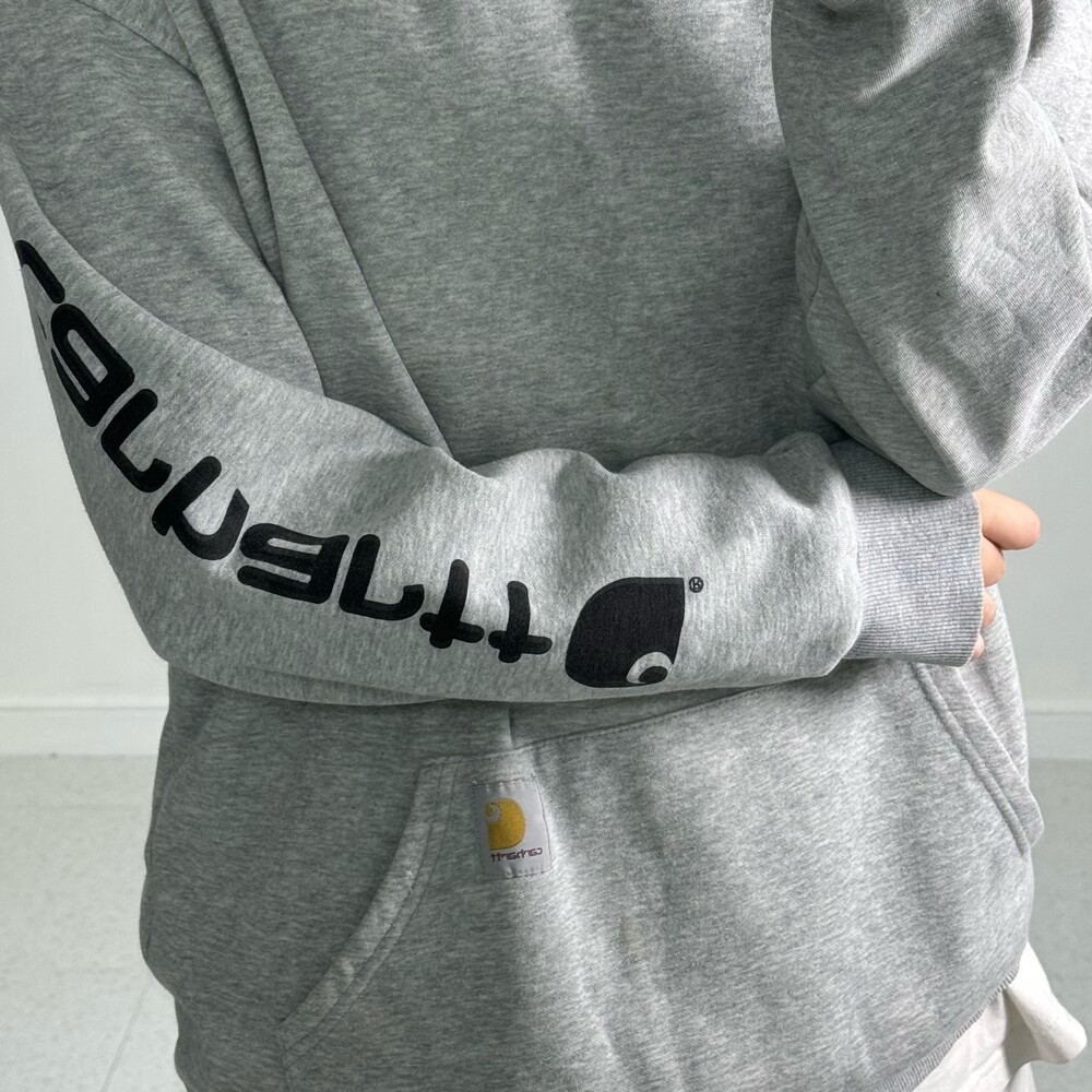 •그레이 컬러 칼하트 후디에요 ㅎㅎ 적당한 두께감과 아방루즈핏감, 소매에 프린팅이 멋스러운 아이템이랍니다 👍🏻