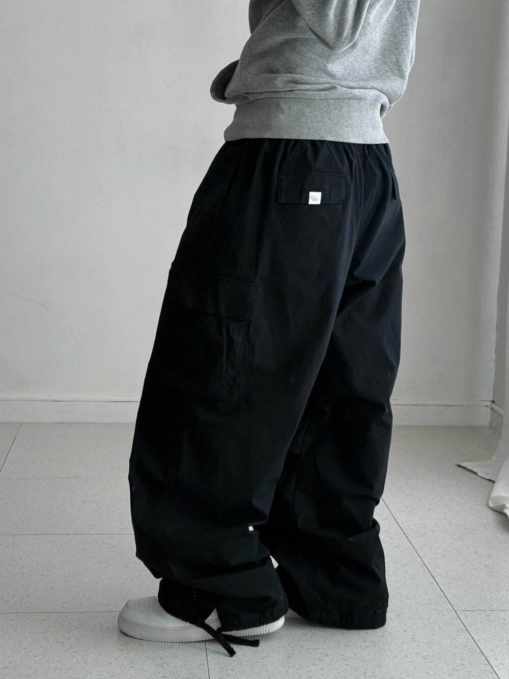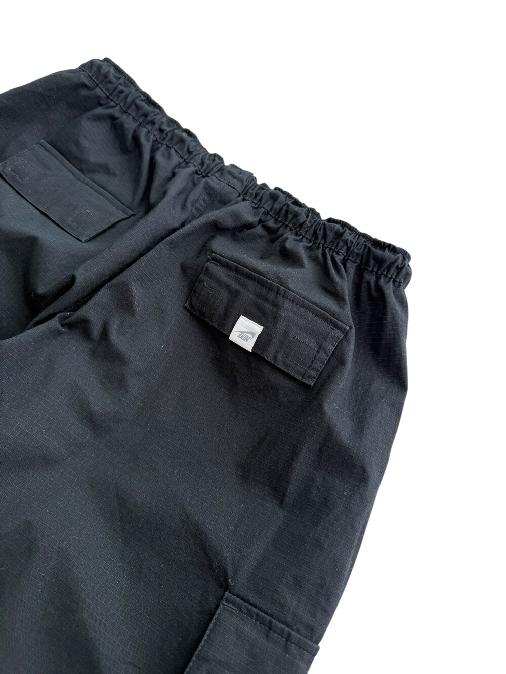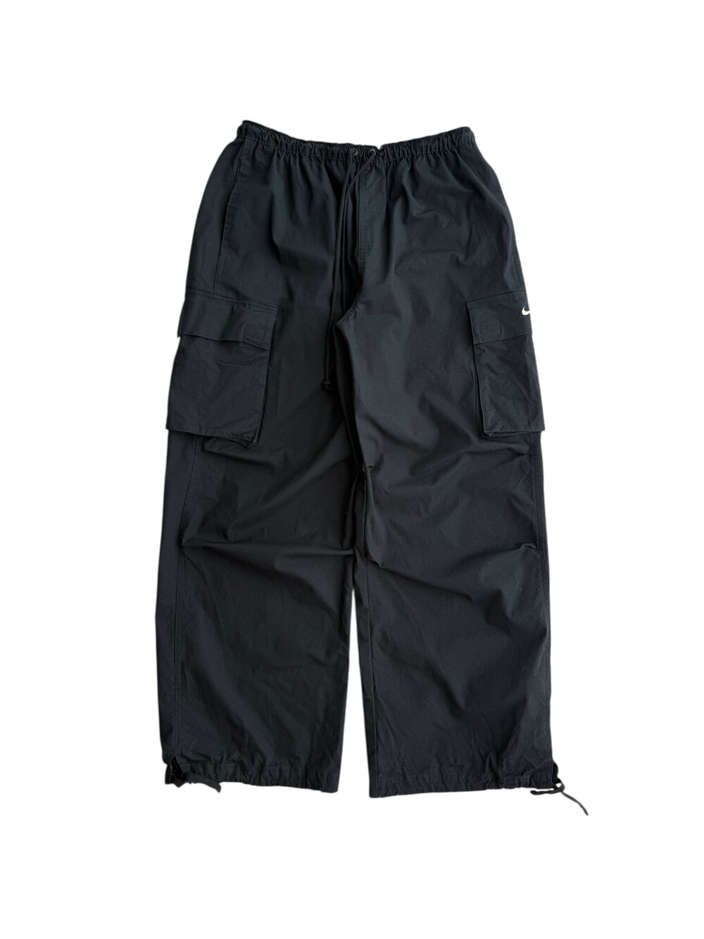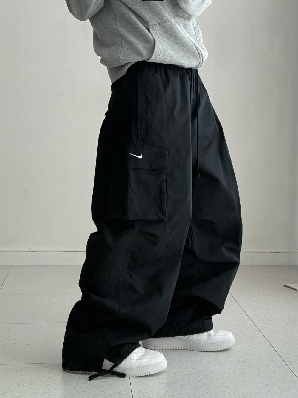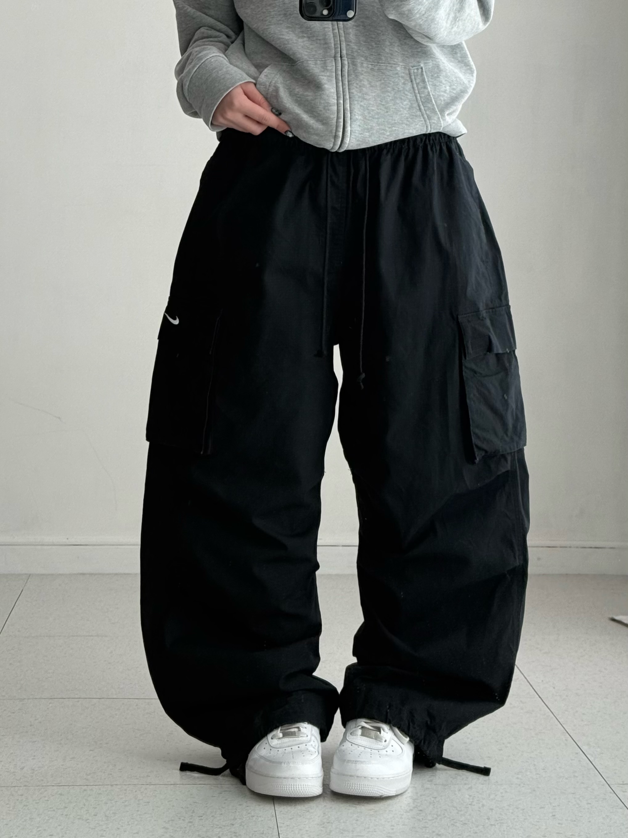 •나이키 블랙 카고팬츠 입니다! 화이트 스우시가 깔끔하게 들어가있는 요물템이에요ㅎㅎ 무릎쪽 핀턱이 들어가있어 알아서 핏이 예쁘게 잡힌답니다🖤