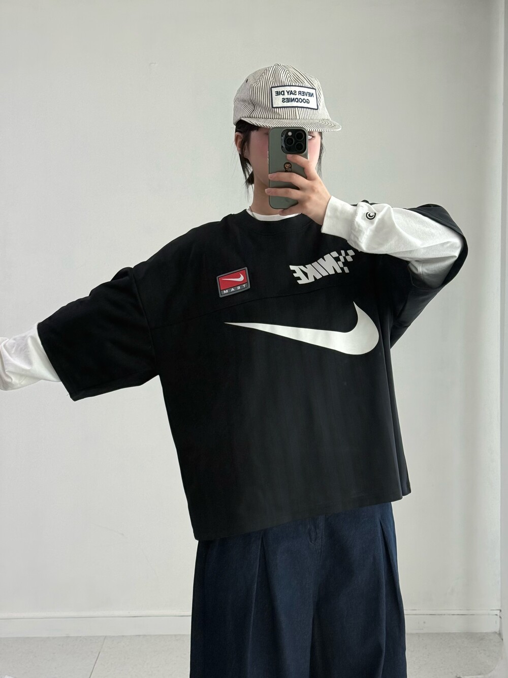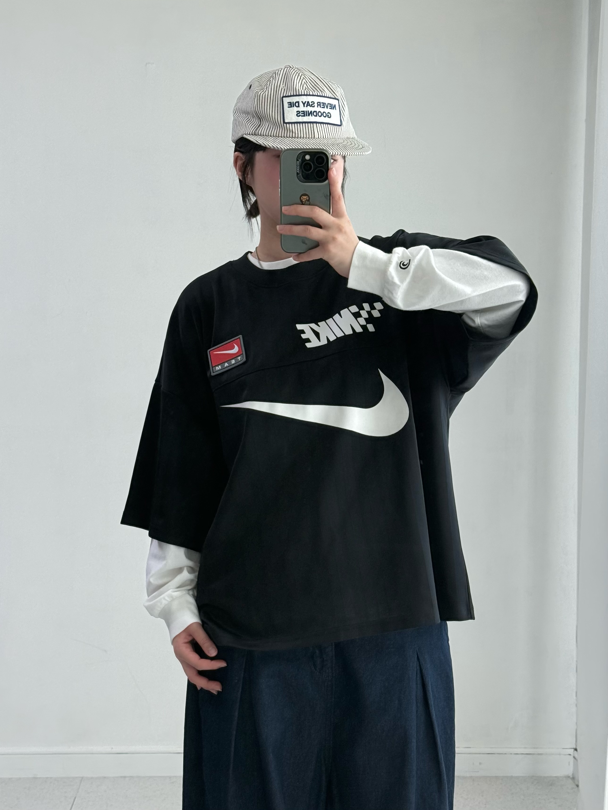 •나이키 NSW 트렌드 티셔츠 입니다. 져지 원단이라 편안하게 착용해주시기 좋고 오버핏에 가단이 넓은 편이라 힙한 무드로 연출해주시기 굿 !