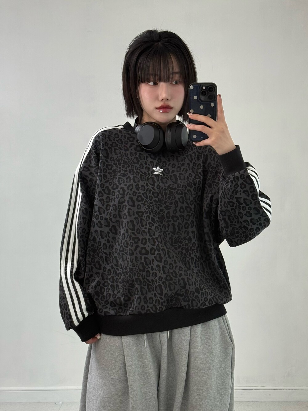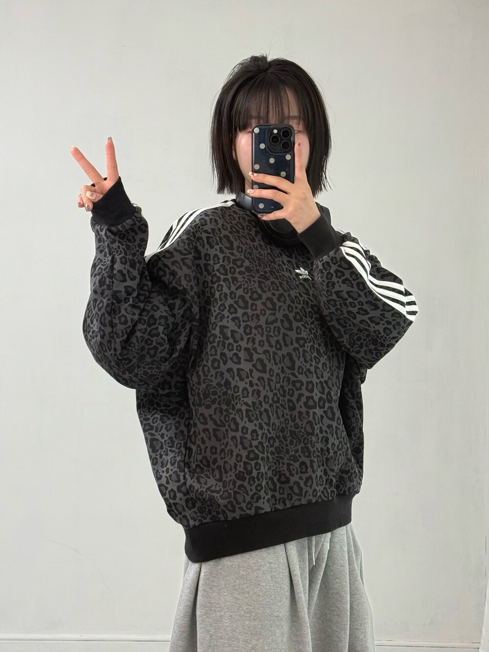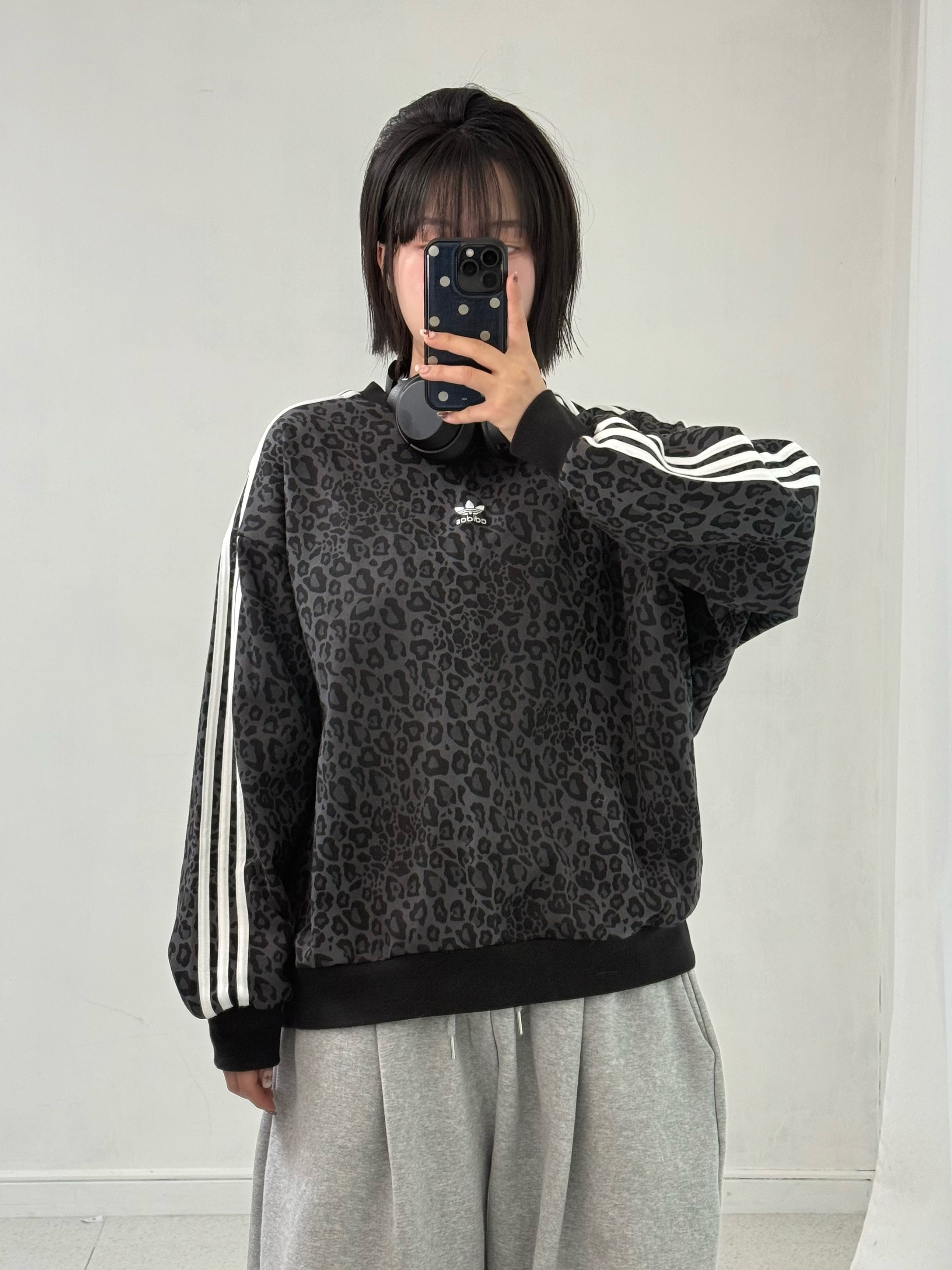 •아디다스 레오파드 맨투맨 입니다. 오버사이즈 핏으로 묵직하게 떨어지는 실루엣이 예쁜 아이템이에요!