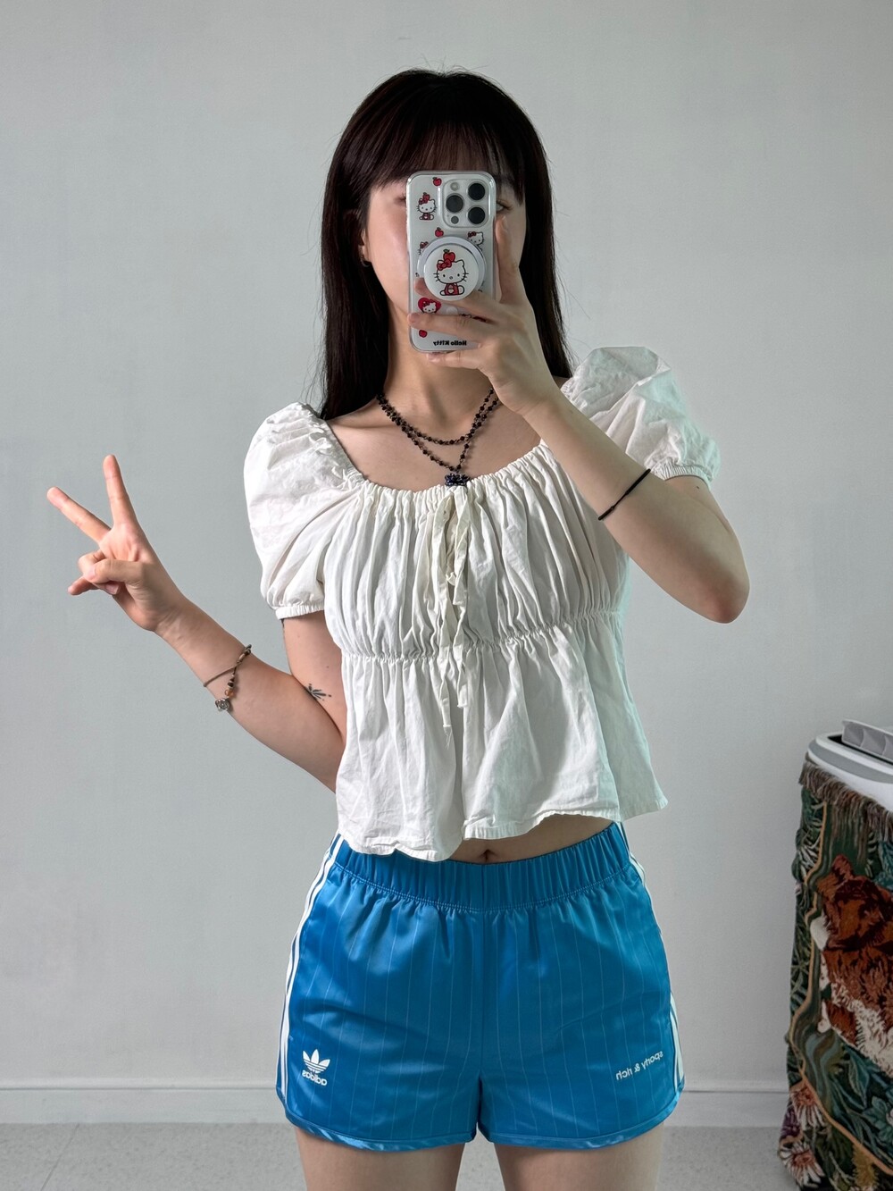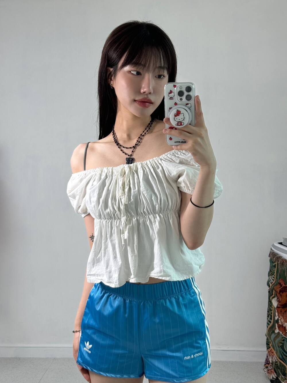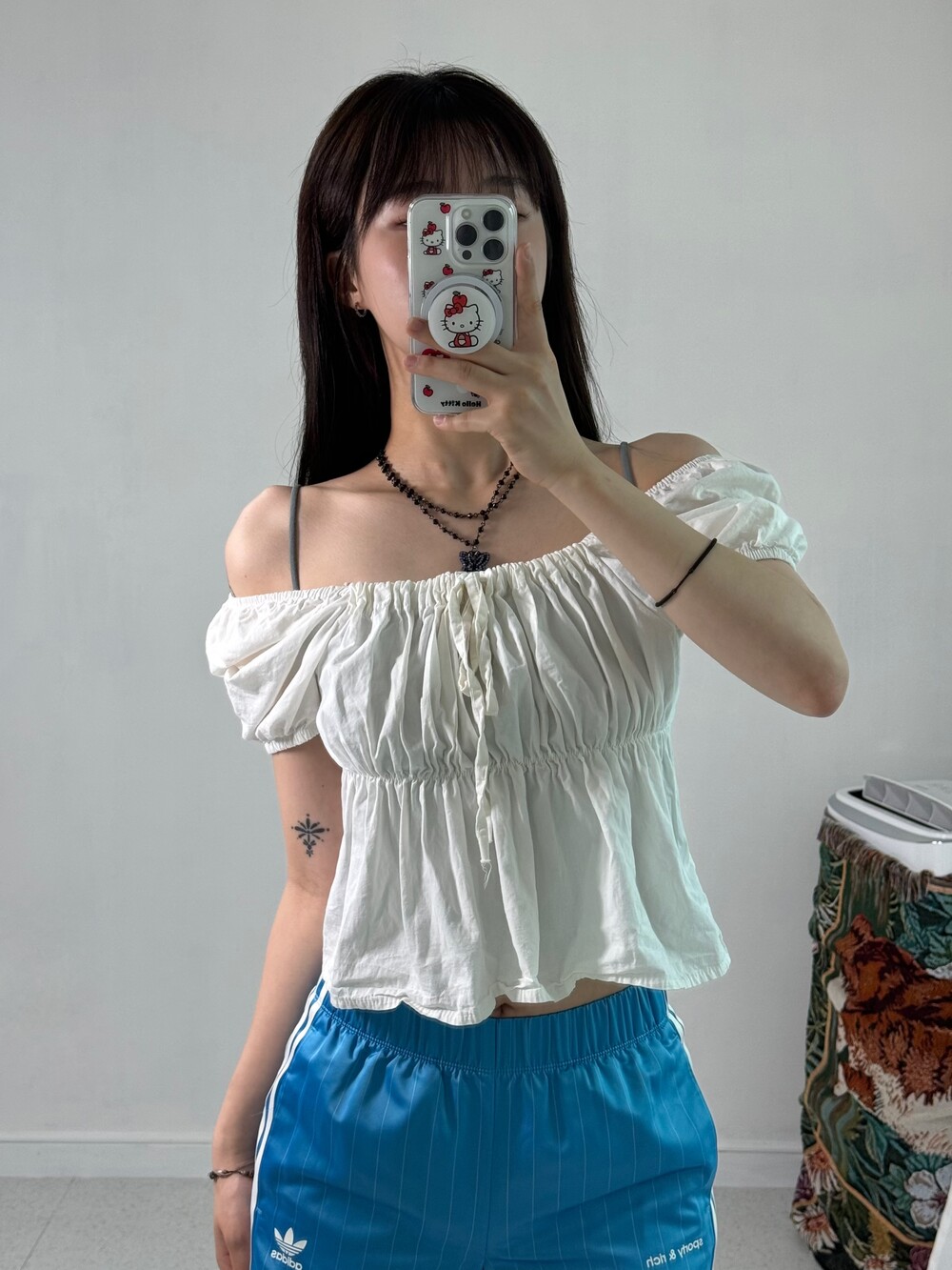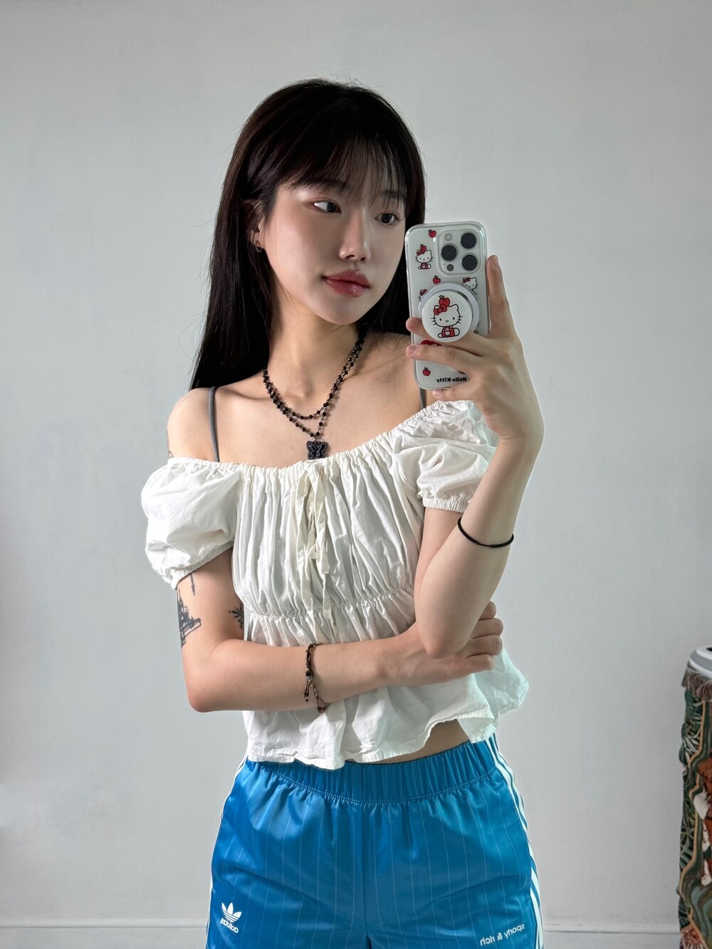 •오프숄더도 가능하고 어깨를 스윽 가리고 입어줘도 예쁜 크롭기장 블라우스에요! 잘늘어나는 밴딩이라 44-55반 까지 추천드릴게요🖤 스커트나 아디 팬츠랑도 넘 잘어울립니다😎