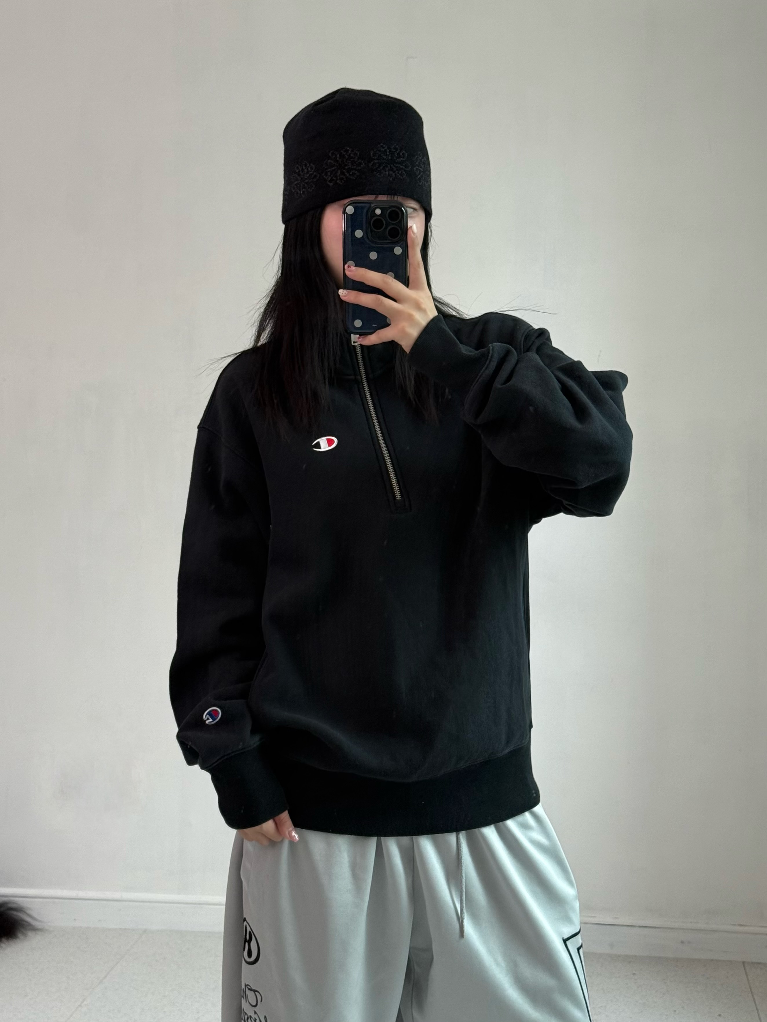 •챔피온 블랙 반집업 입니다. 깔끔한 디자인+오버핏에 안감 기모인 제품이에요!