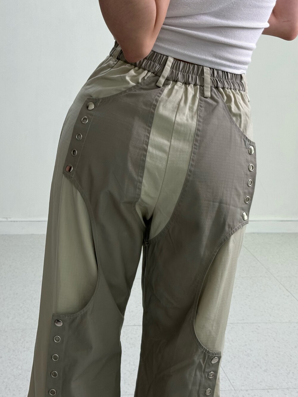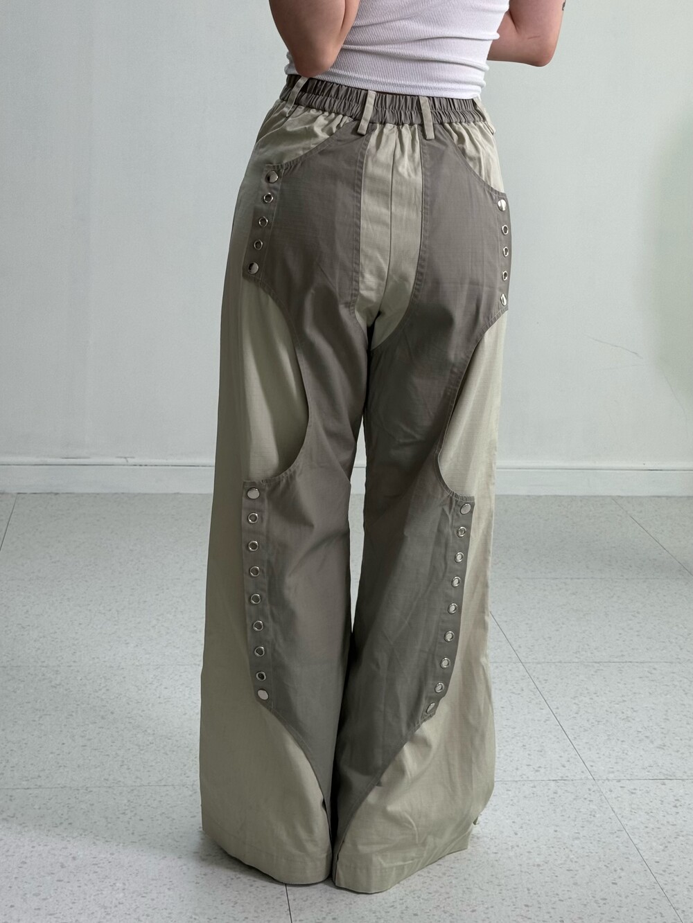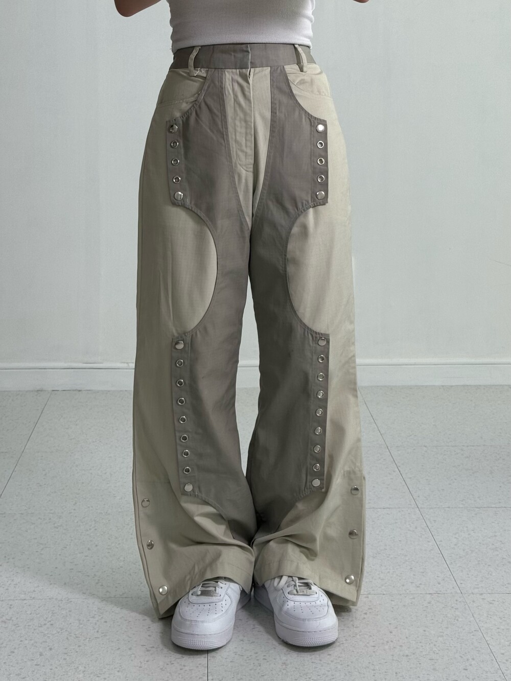 •보자마자 헉! 했던 디자인이에요! 아일렛펀칭이 들어가 더욱 멋스럽고 배색 패치 디자인이 들어가 독특한 디자인의 팬츠 니다:) 심지어 사이드 버튼 디테일도 들어가있고 하이웨스트로 착용해주시는 제품입니다. 허리가 밴딩이라 더욱 편안하게 착용하실 수 있습니다.