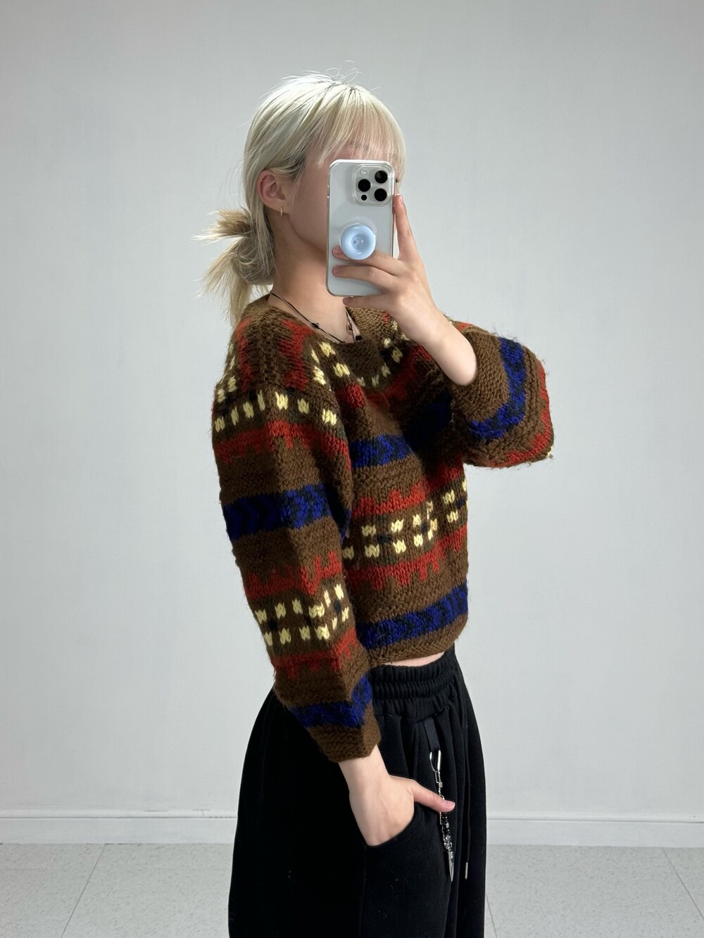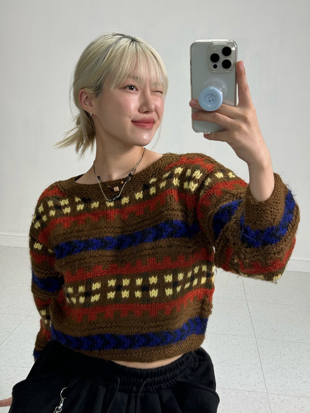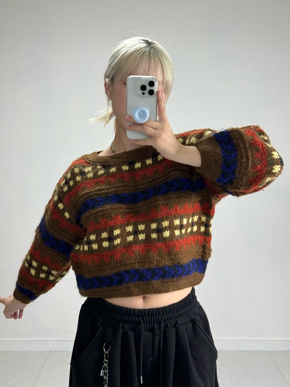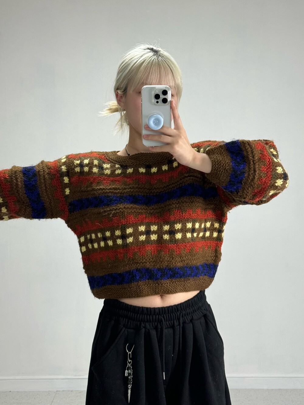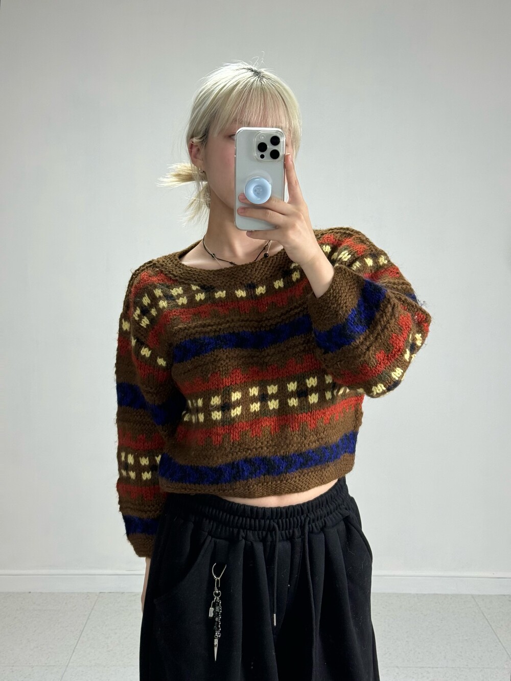 •도톰한 원단의 크롭 니트랍니다- 브라운 컬러를 바탕으로 알록달록 귀여운 디자인이에요ㅎㅎ