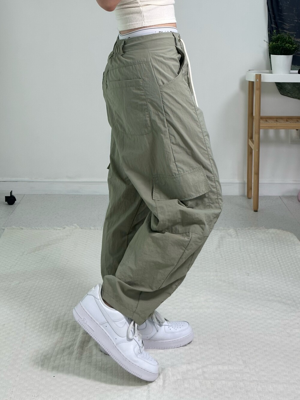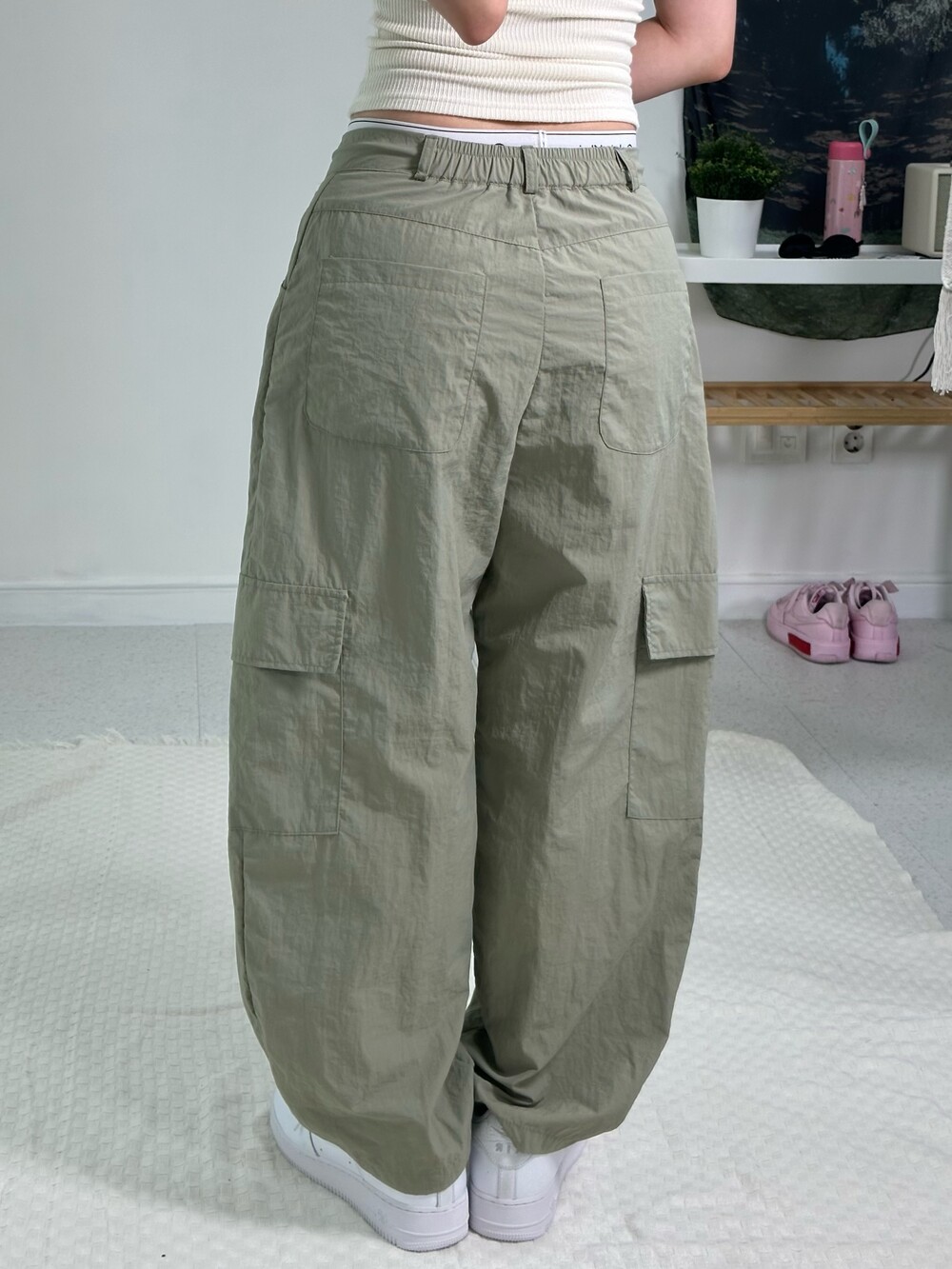 •바스락원단의 카고팬츠에요! 기장이 짧아서 160 이하 이신 분들께 추천드리고 싶어요! 딥한 카키가 아니라 라이트한 느낌이라 무거운 느낌 보다 산뜻한 느낌이 나고 스트랩으로 허리조절도 할 수 있어서 엄청 편하답니다!