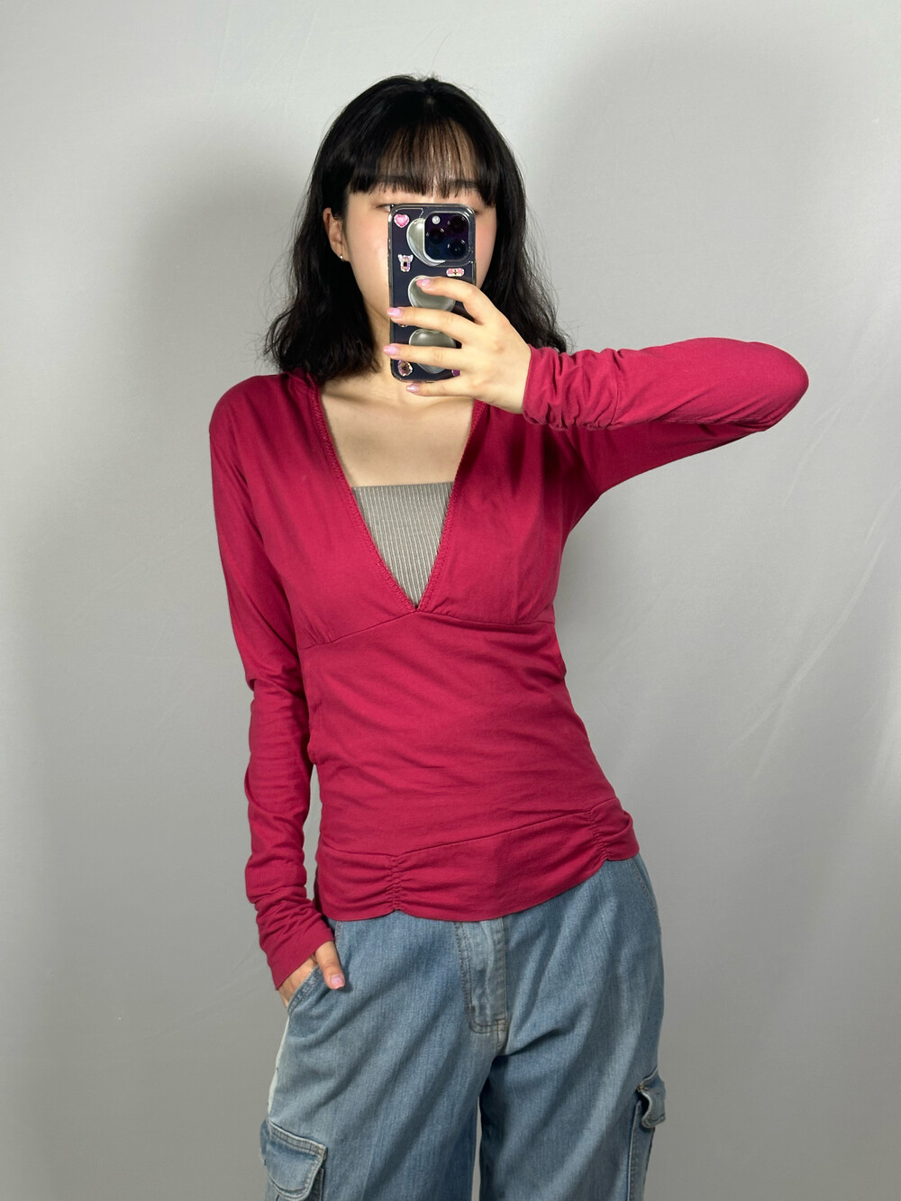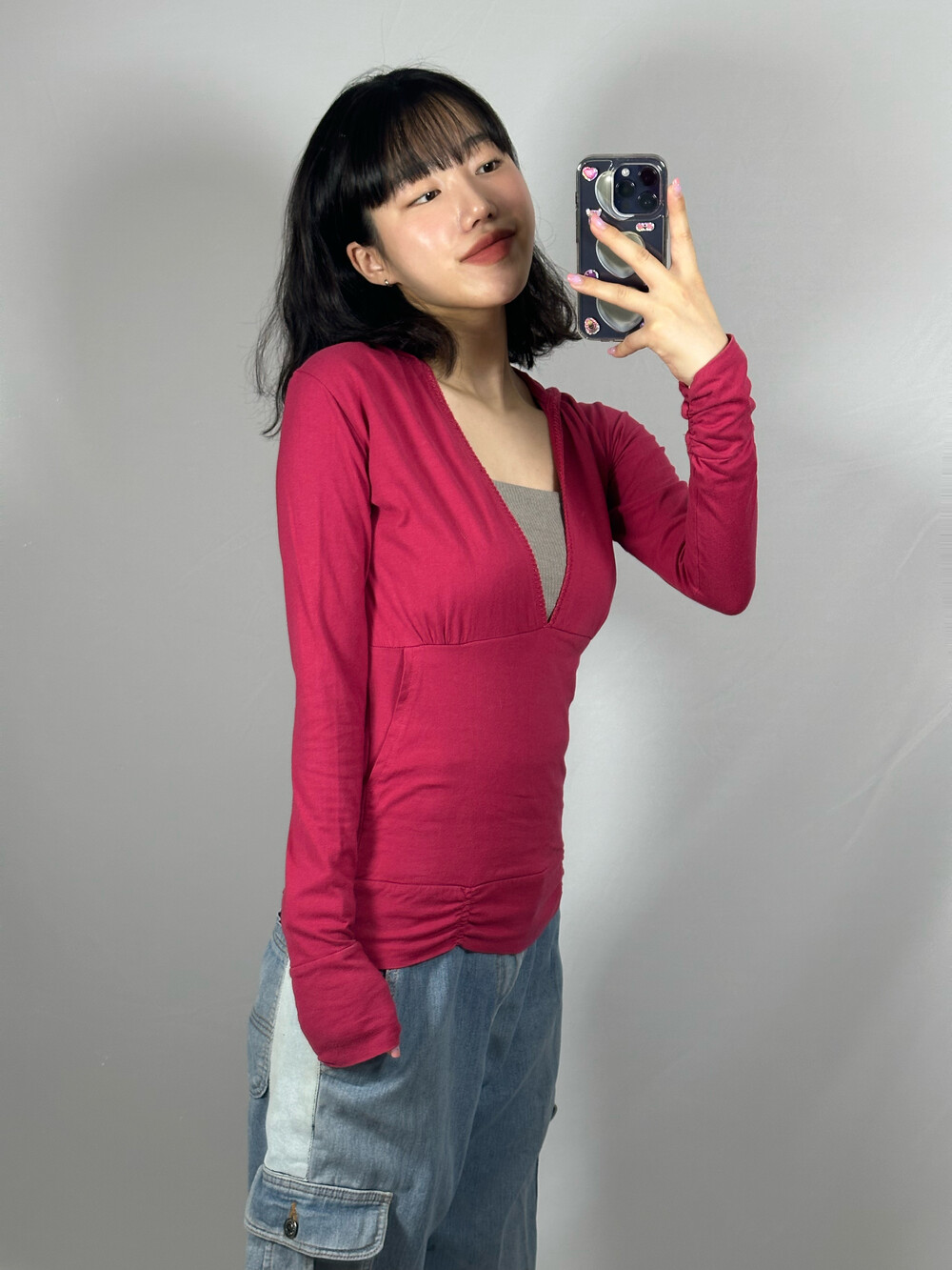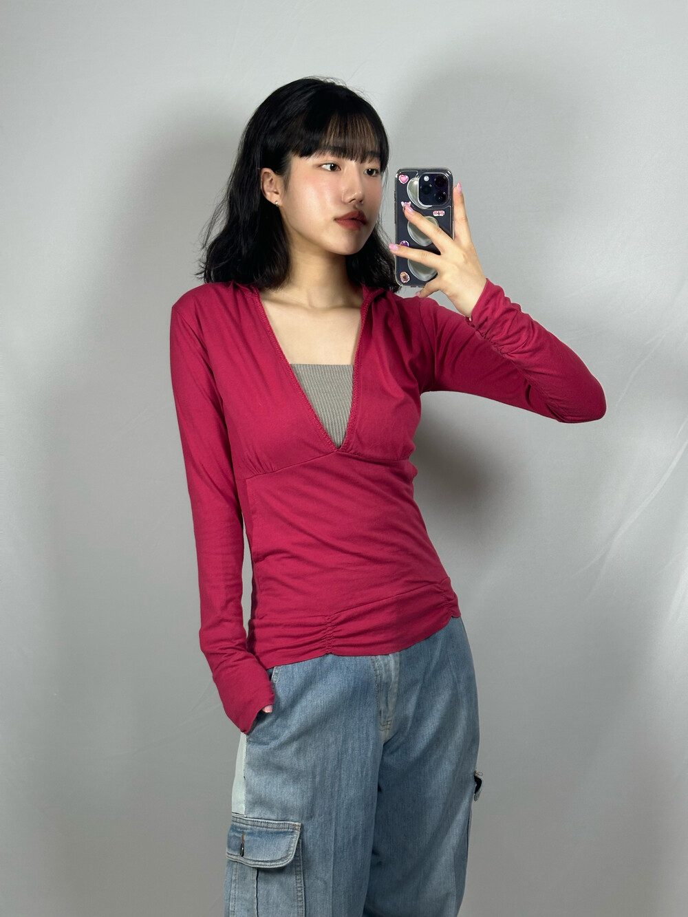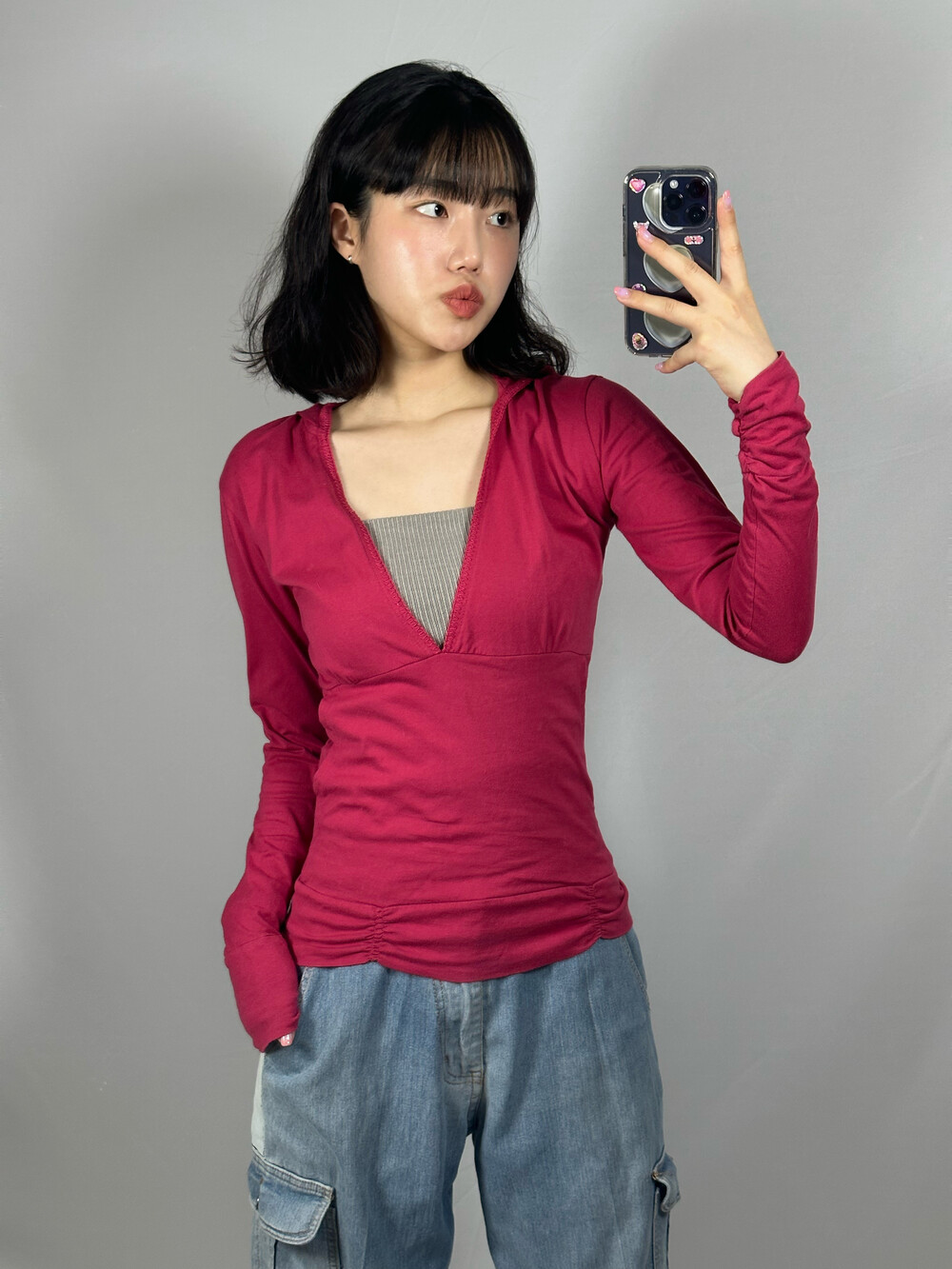 얇은 원단과 깊은 브이넥 라인이라 안에 탑으로