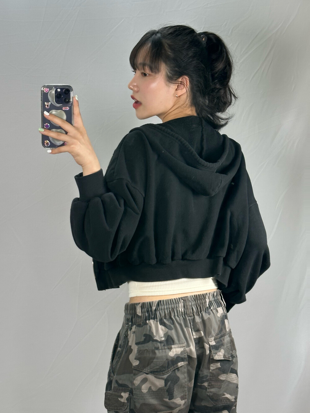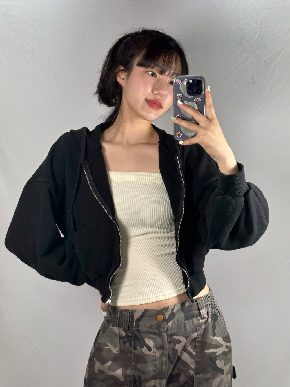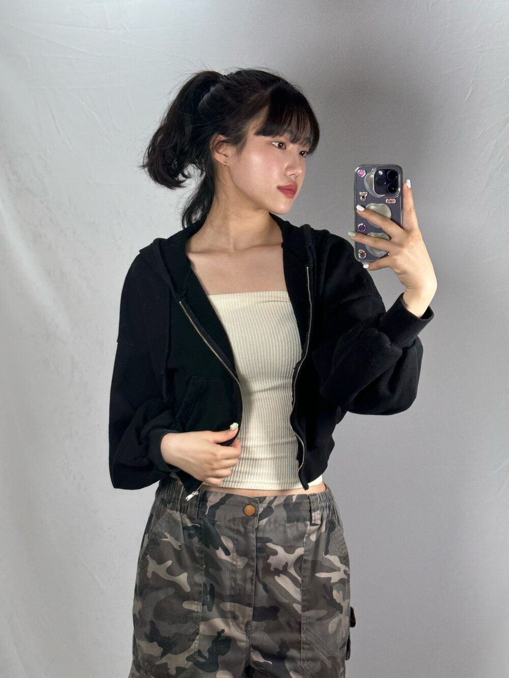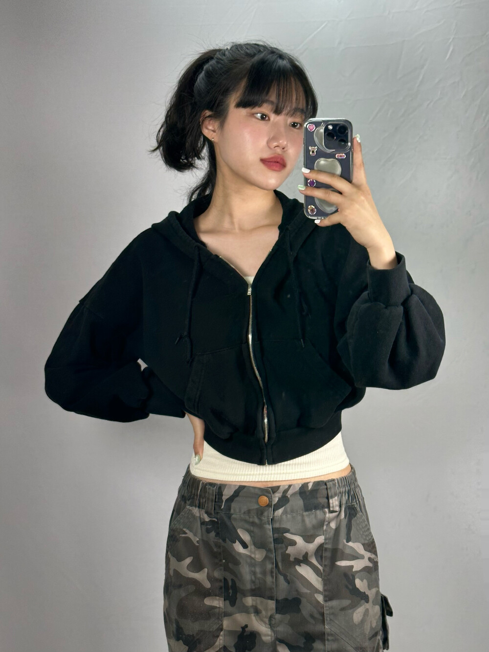 무난한 디자인과 하나쯤은 있으면 좋은데 은근 내 옷장에는 없는 그런 제품이라서 한번 보여드리고 싶었어요! 여름에는 루즈한핏의 후드집업을 입게되면 더워보이기도 하고 여름느낌은 아니여서 완전 크롭한 기장의 후드집업을 보여드리고 싶었어요! 팔부분은 봉긋하게 유니크한 핏으로 떨어지고 허리 중간까지 오는 기장감이 허리를 더 얇아보이게 만들어주더라구요! 빈티지 제품으로 조금 저렴하게 예쁜 후드집업 보여드리고 싶었던 제 마음,, 가득 담아 봅니다.
