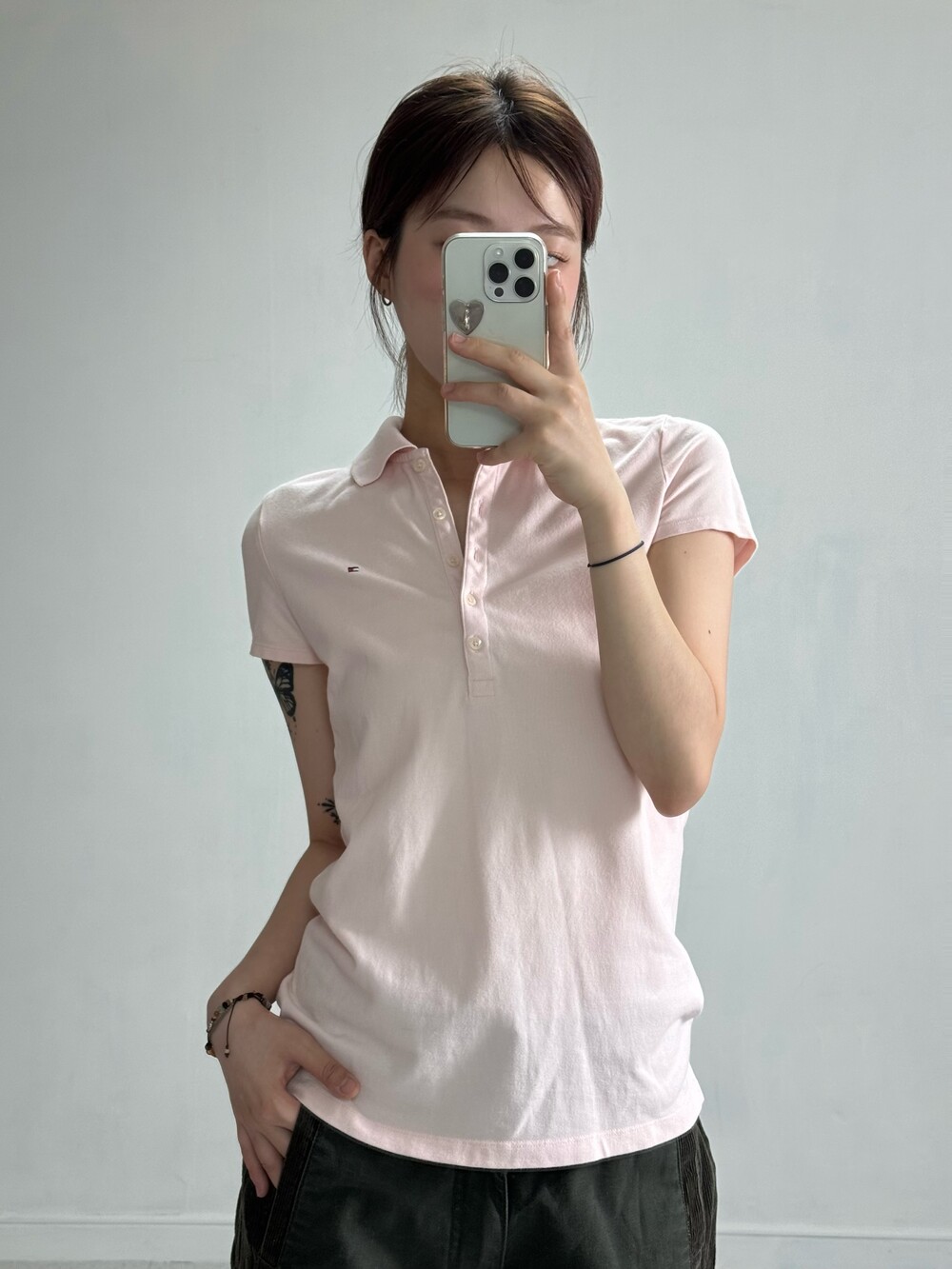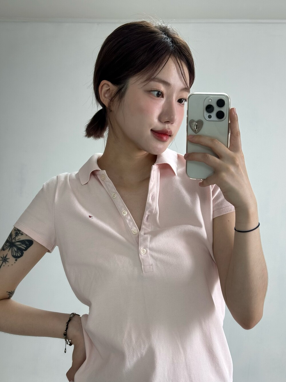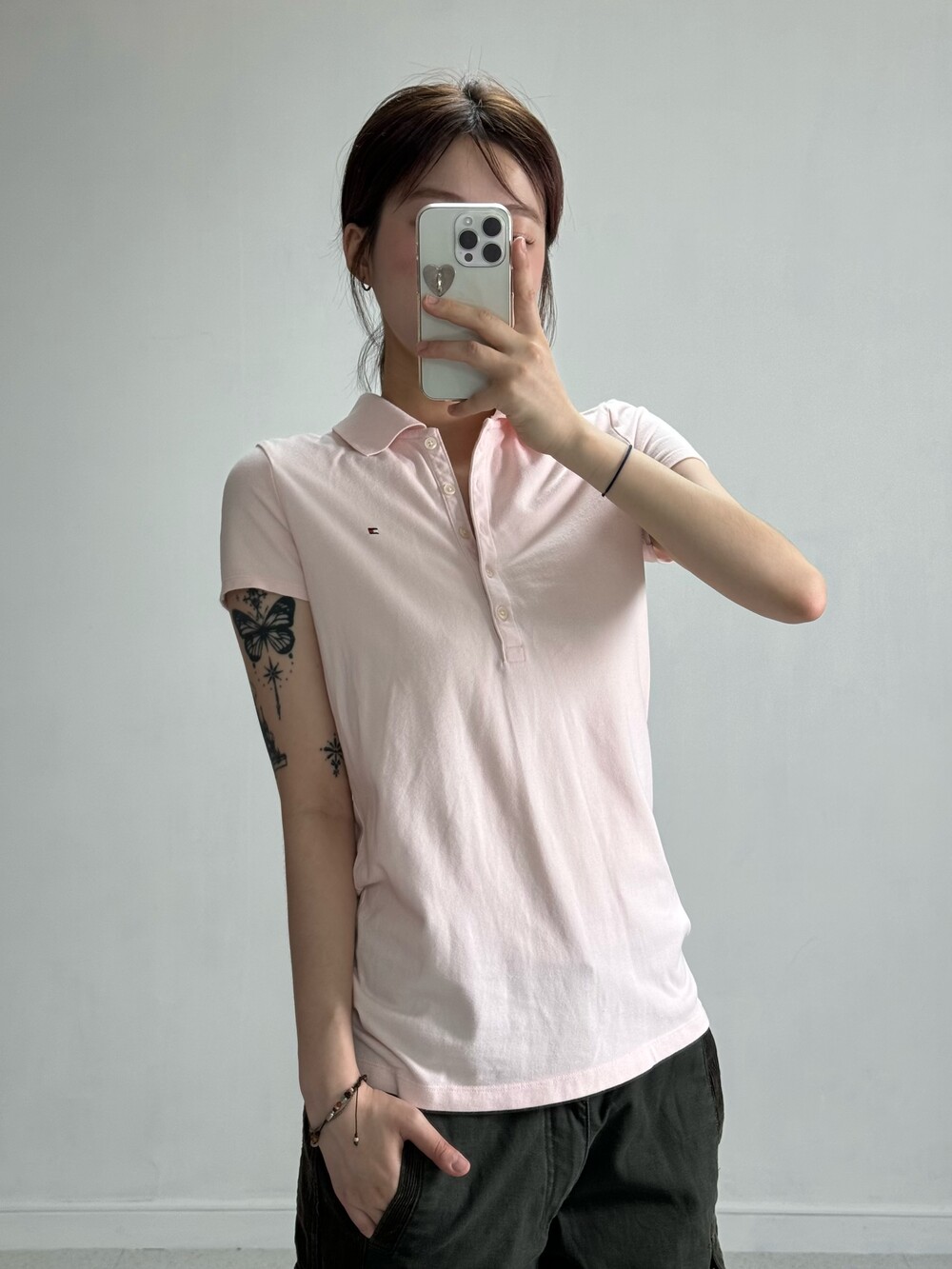 •연한 베이비핑크 타미힐피거 반팔 입니다! 살짝 슬림하게 떨어지는 핏이라 상체를 말라보이게 만들어주더라구요!