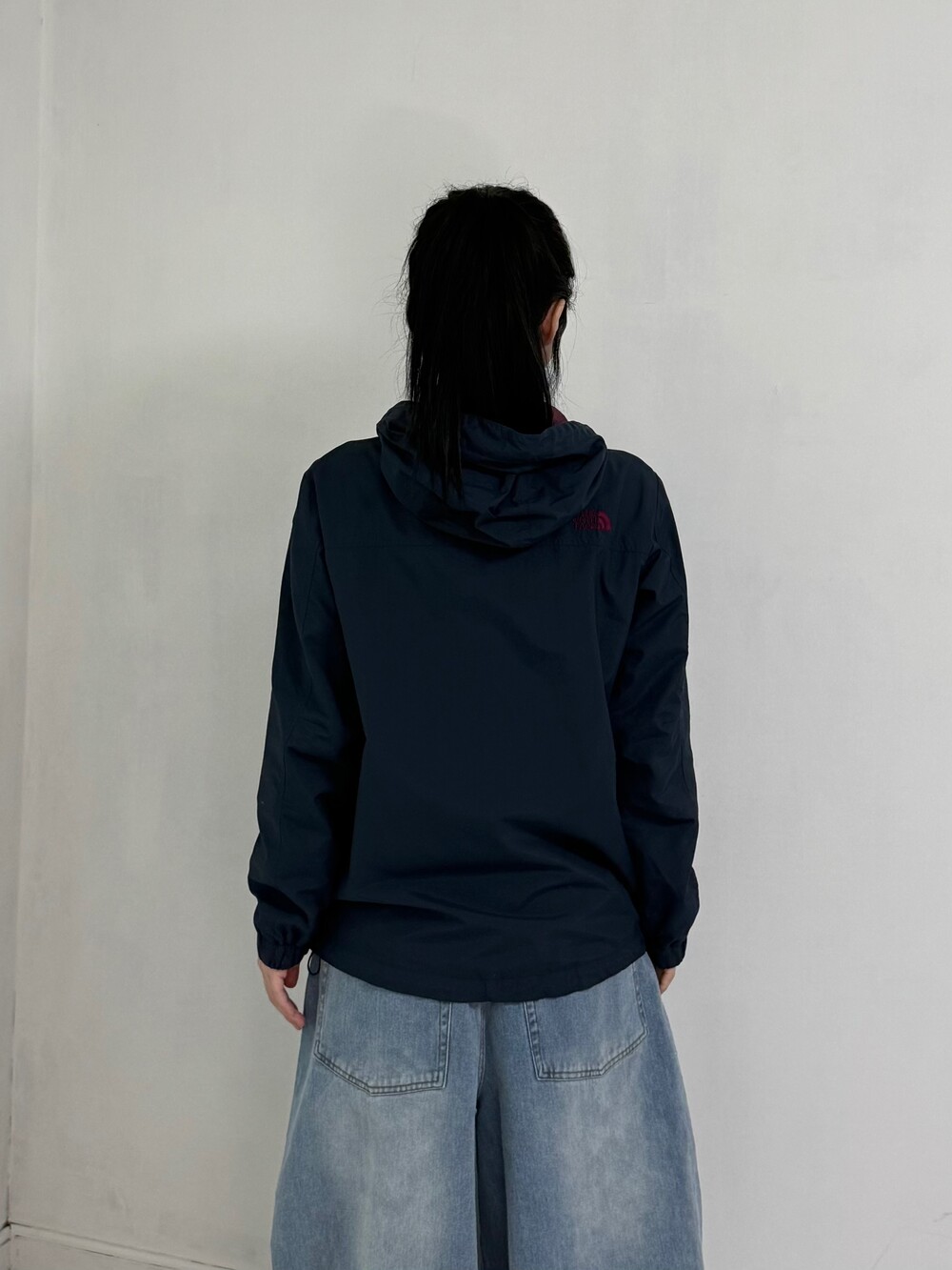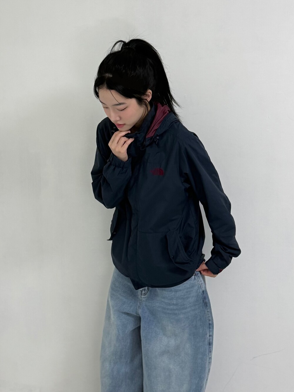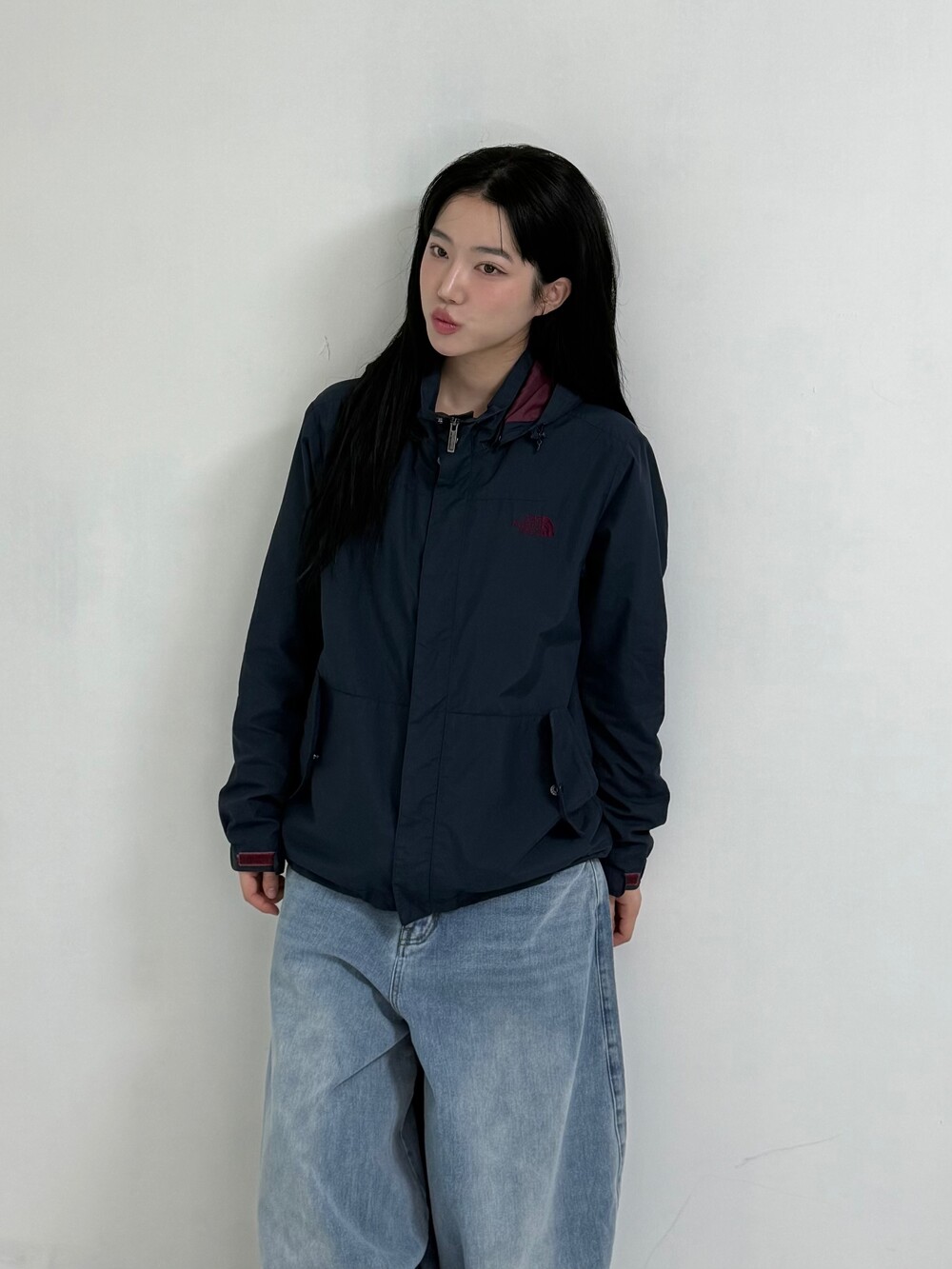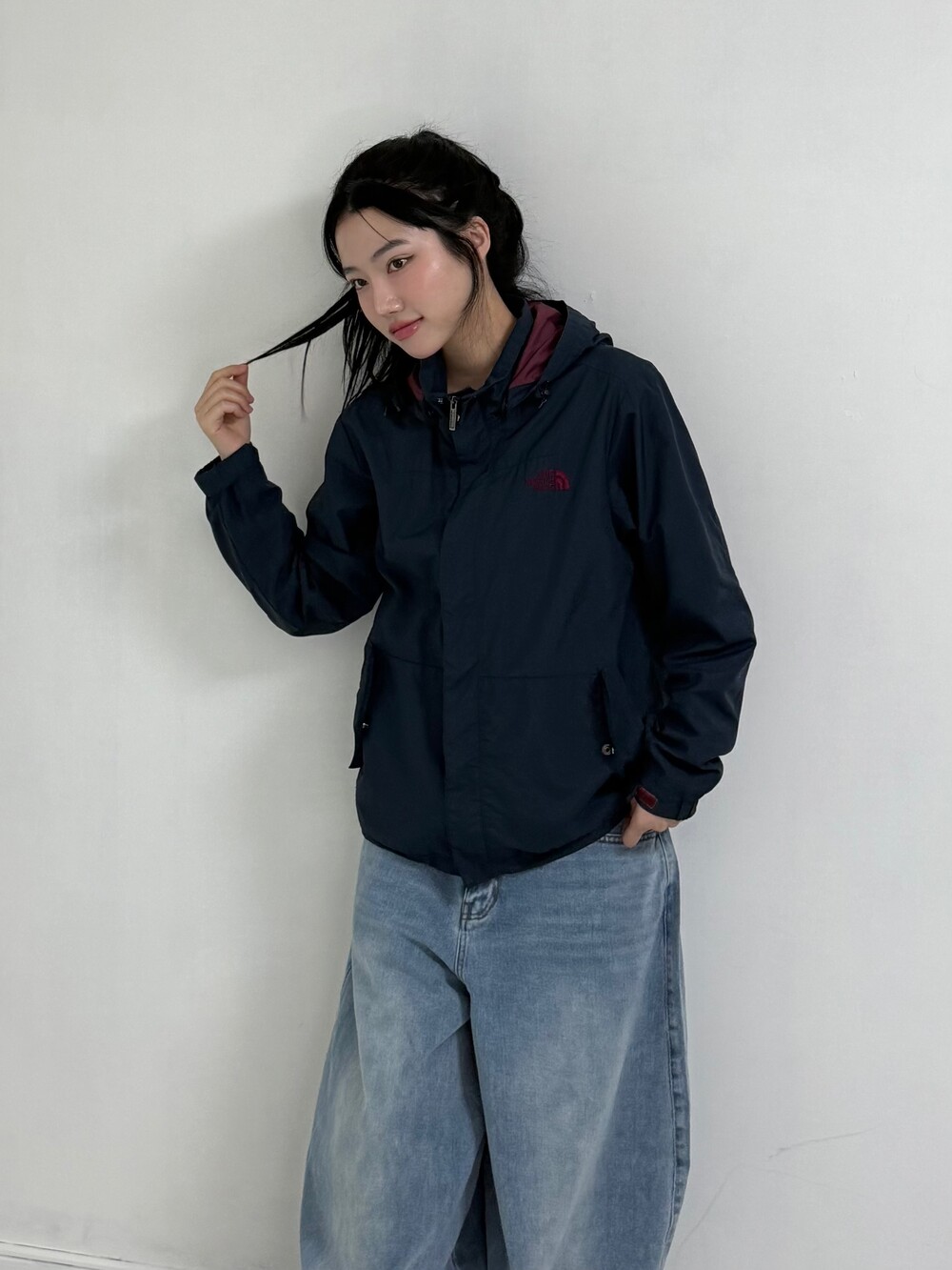 •노스페이스 네이비+버건디~ 밑단에 쭈리가 있어서 원하시는 기장감대로 연출하실 수 있습니다! 가볍게 아우터로 입어주시기 좋아요 ㅎㅎ 후드도 달려있구 주머니 디자인도 귀여버용