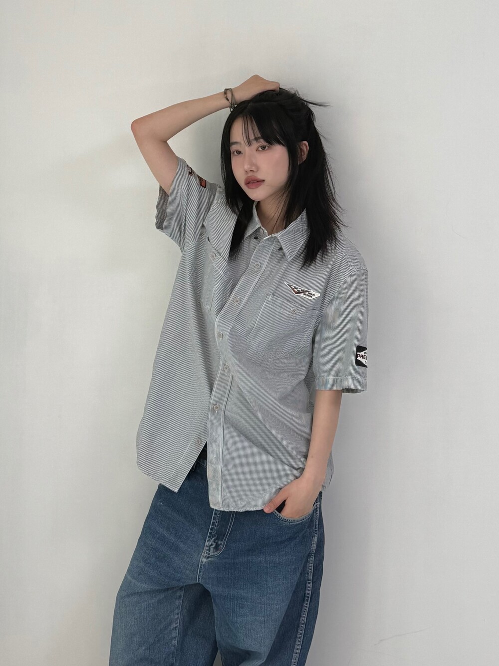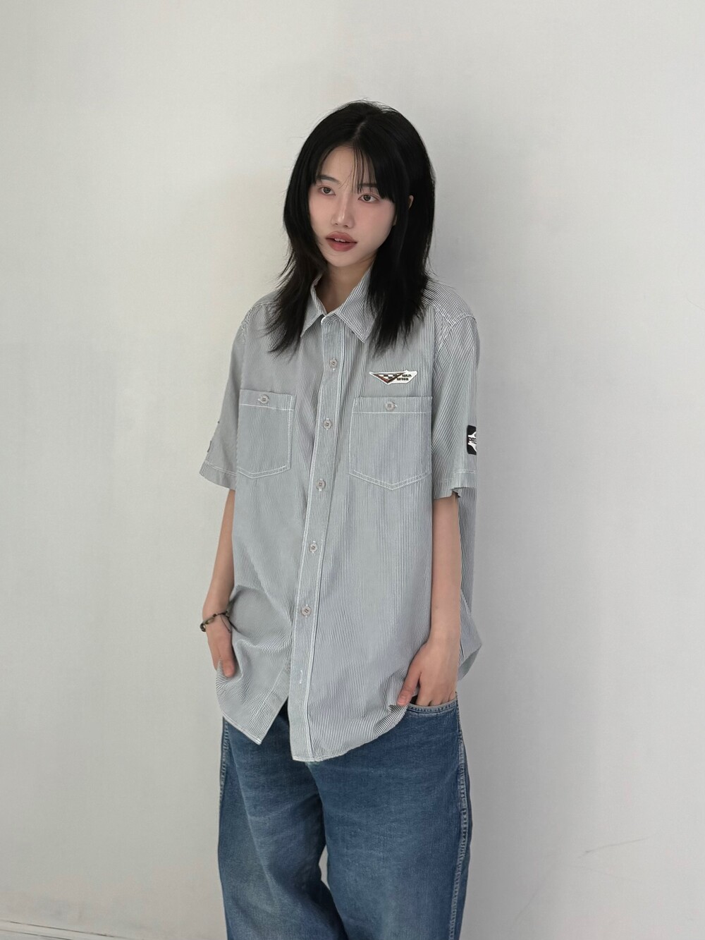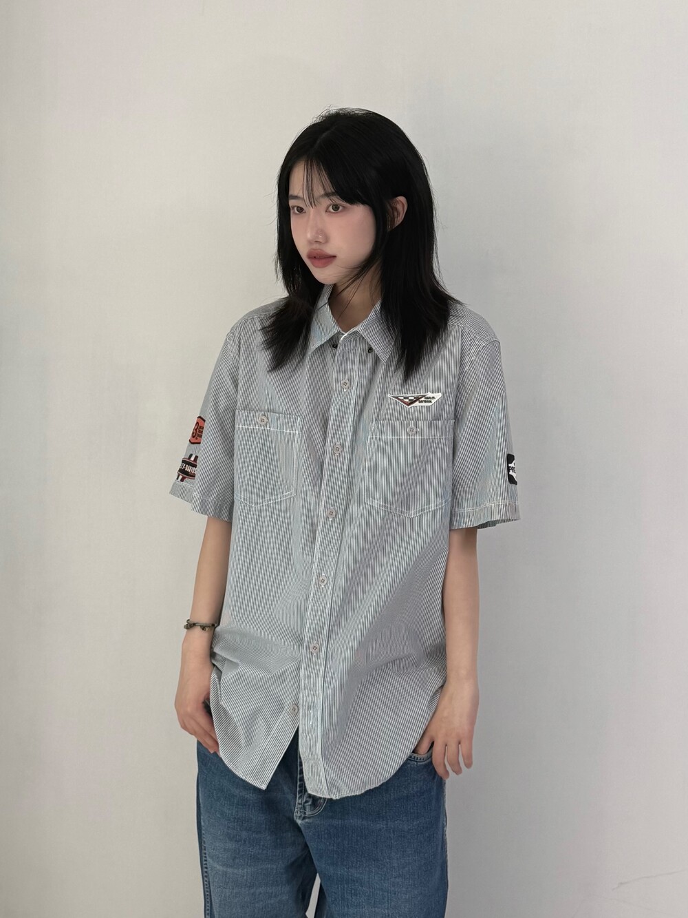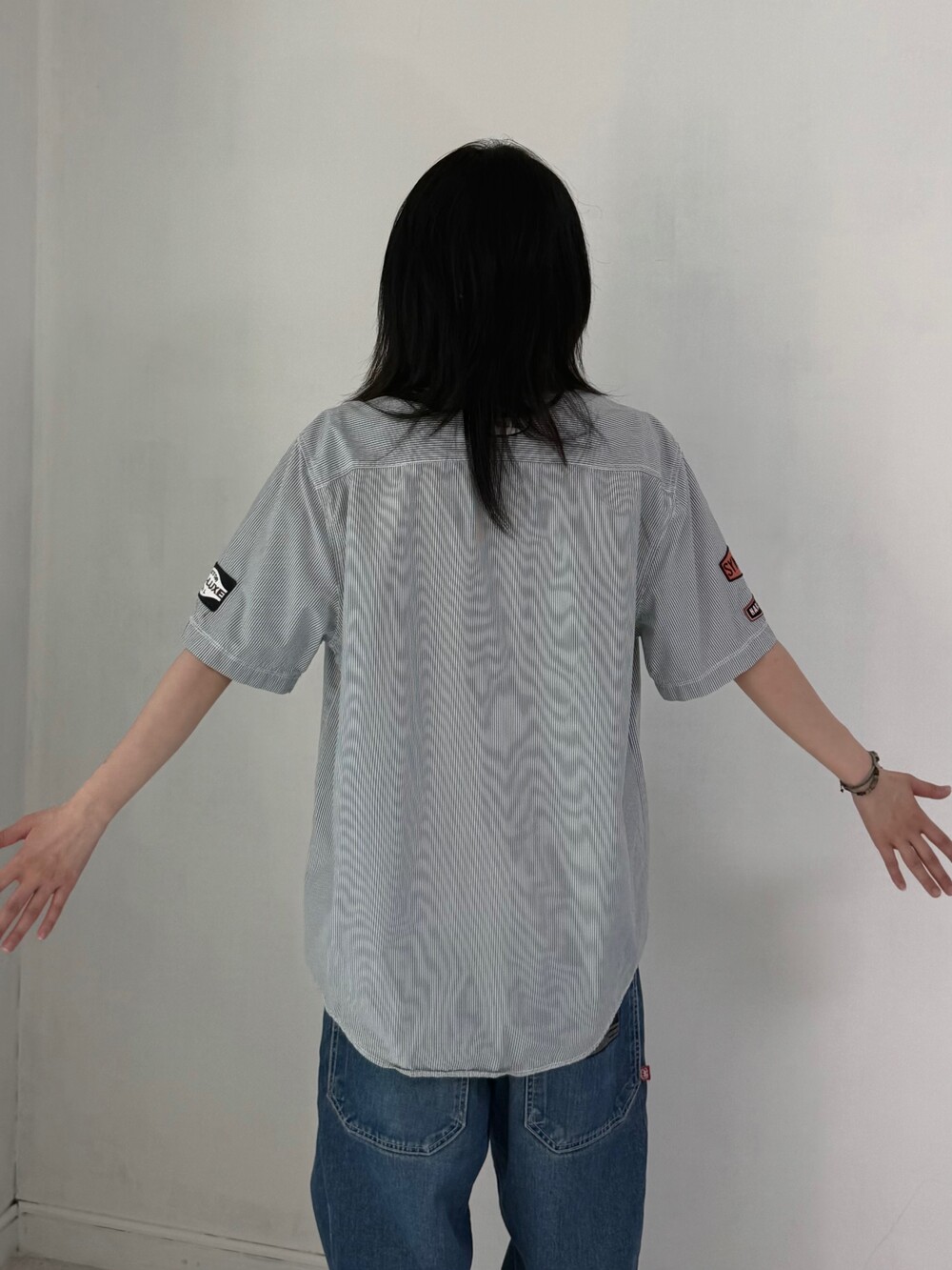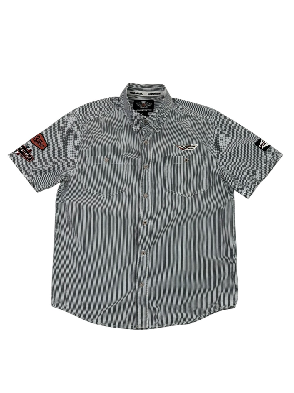 •할리데이비슨 스트라이프 반팔 셔츠 입니다! 곳곳에 패치 디테일이 귀엽게 들어가있어요!