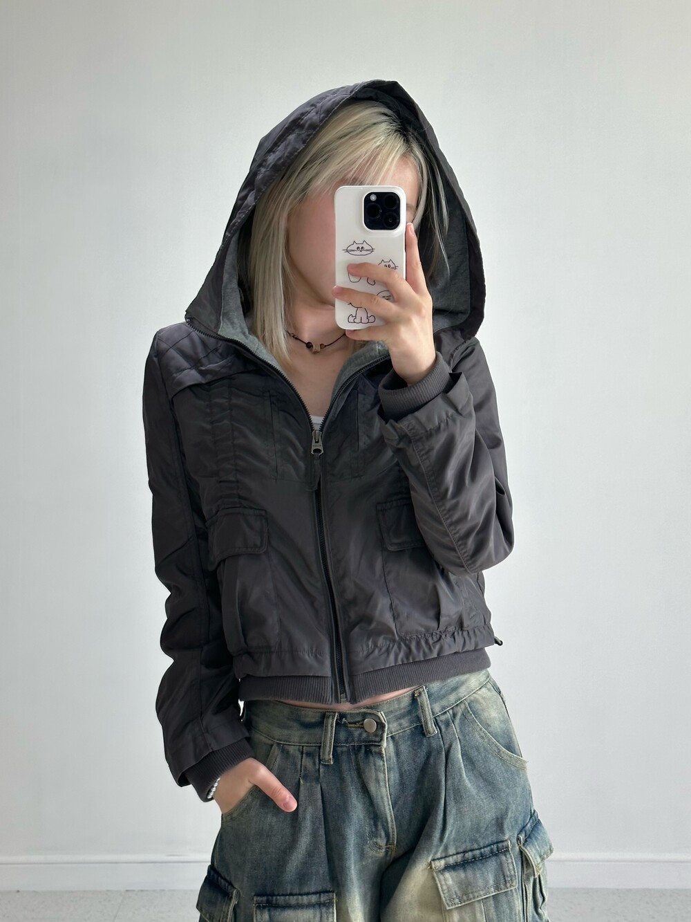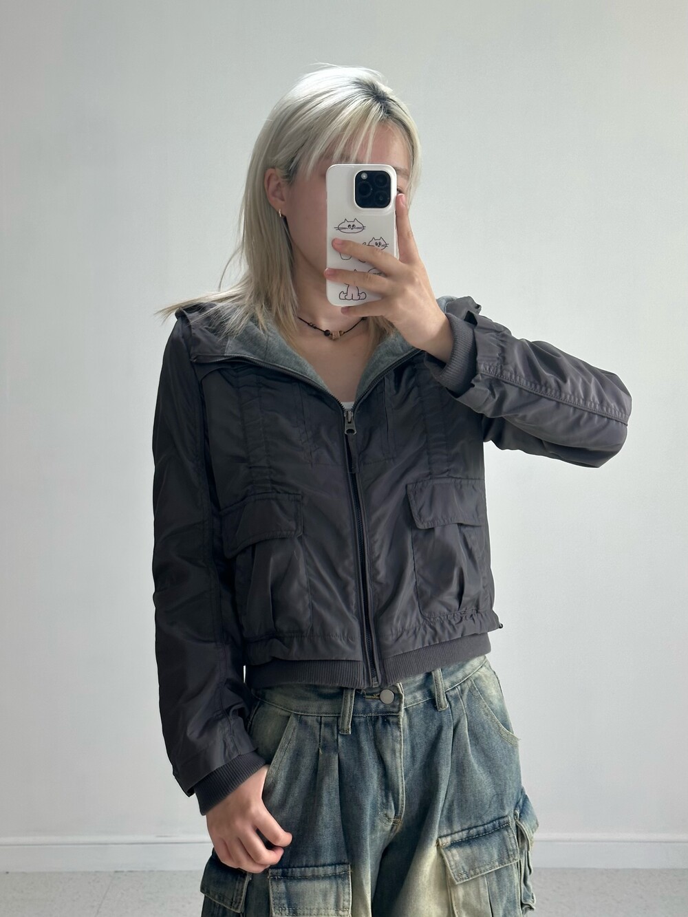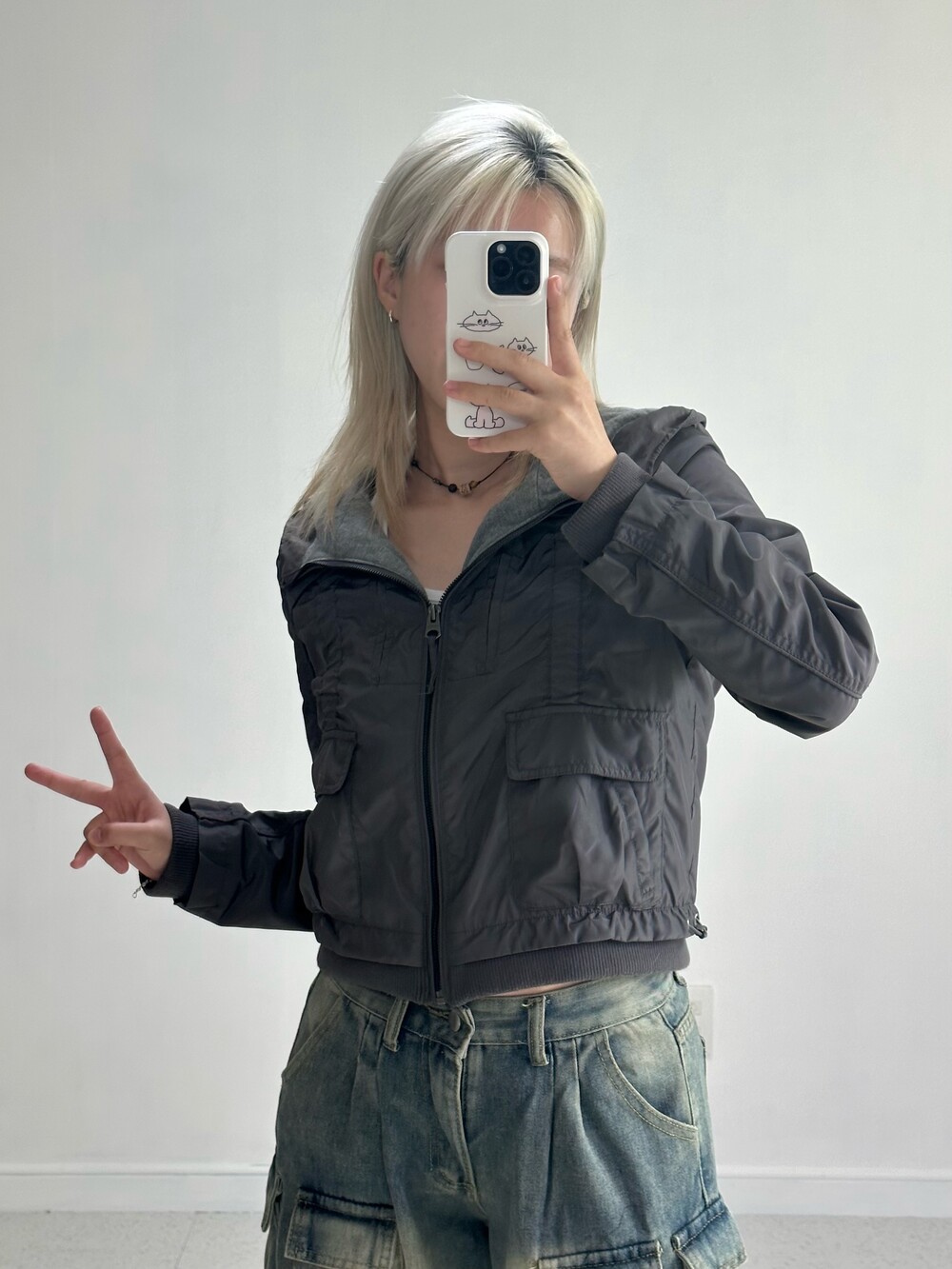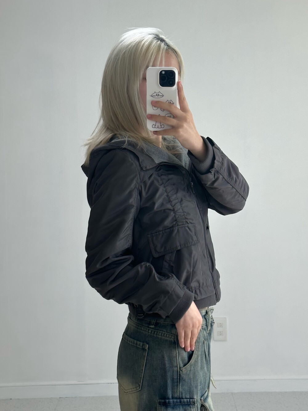 •세미크롭 기장이라 더욱 키치 스트릿한 무드의 아우터에요! 챠콜 컬러라 오묘한 느낌+후드도 엄청 커서 착용했을때 얼굴소멸st 키킼