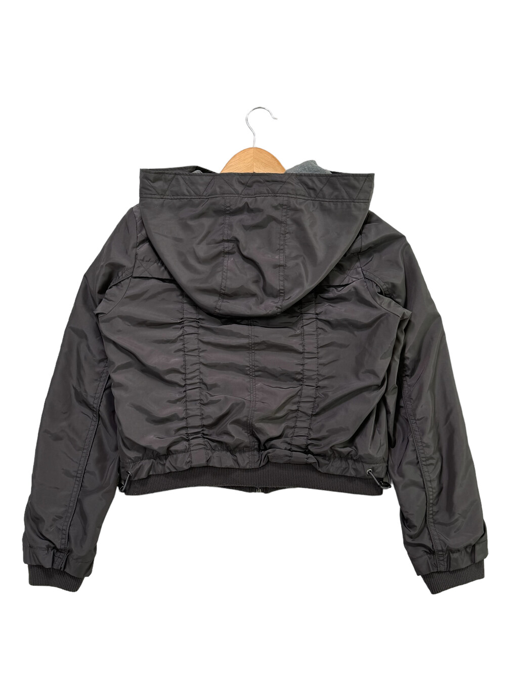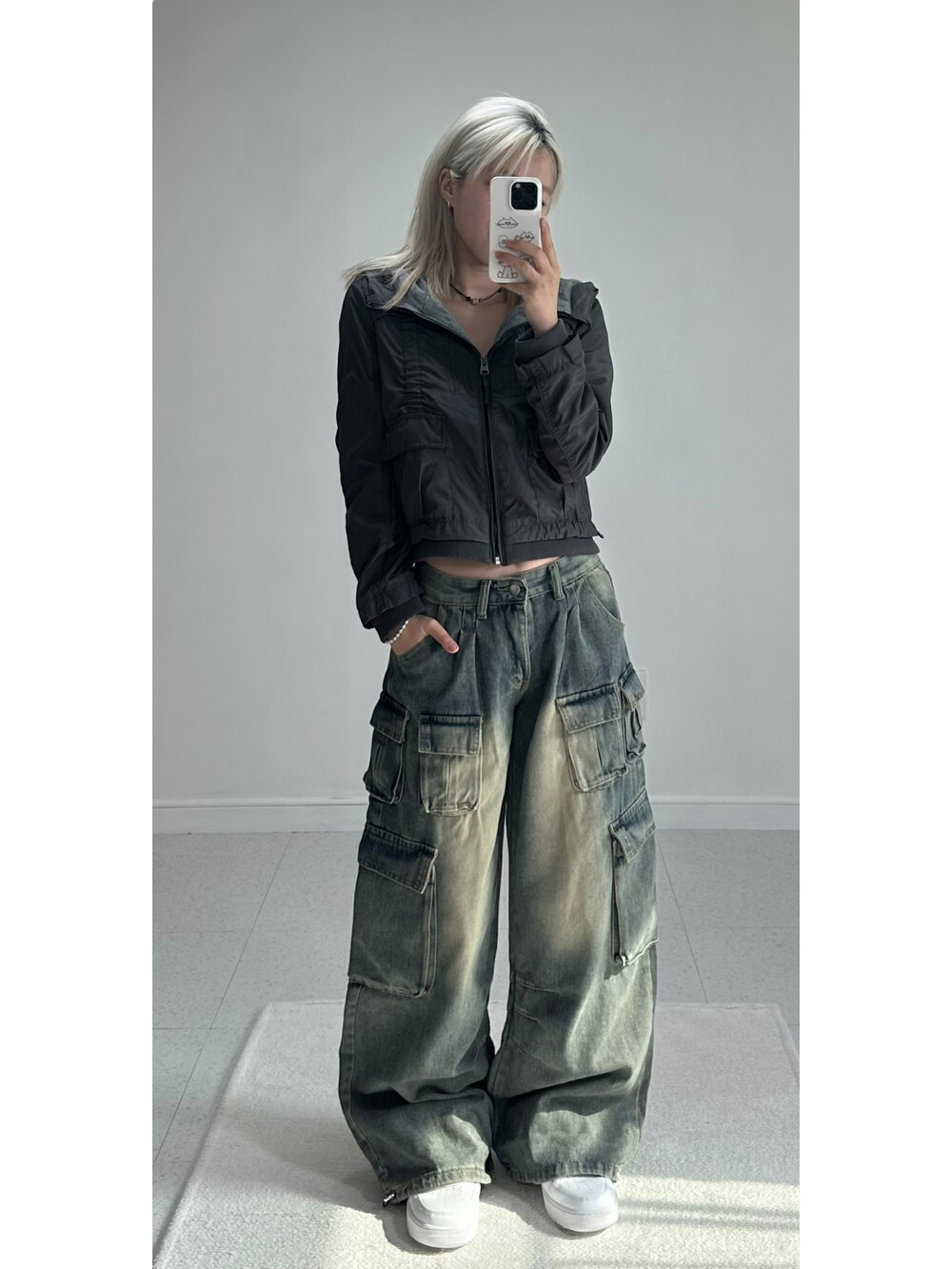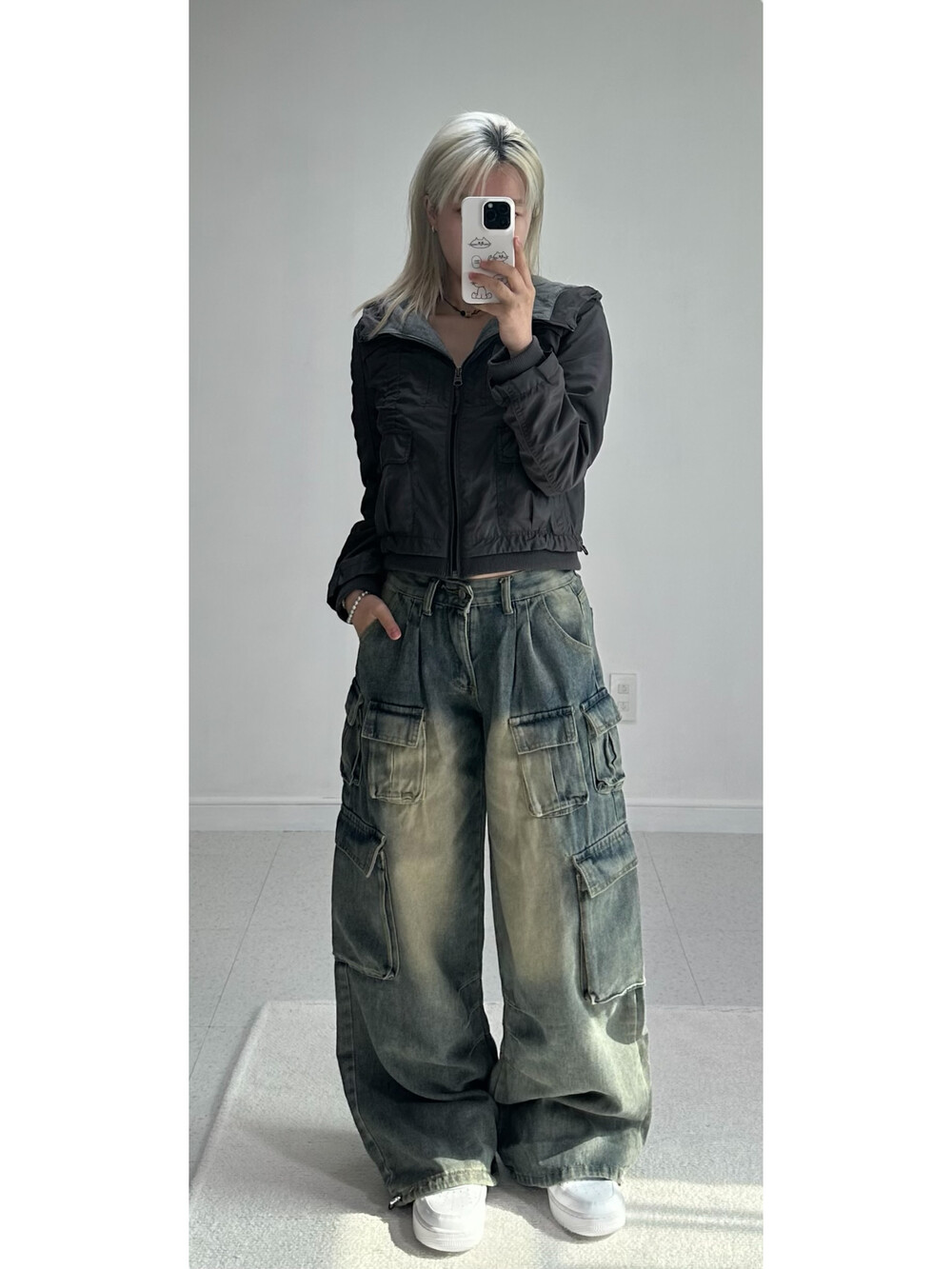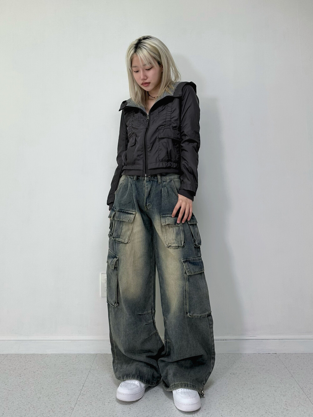 •세미크롭 기장이라 더욱 키치 스트릿한 무드의 아우터에요! 챠콜 컬러라 오묘한 느낌+후드도 엄청 커서 착용했을때 얼굴소멸st 키킼