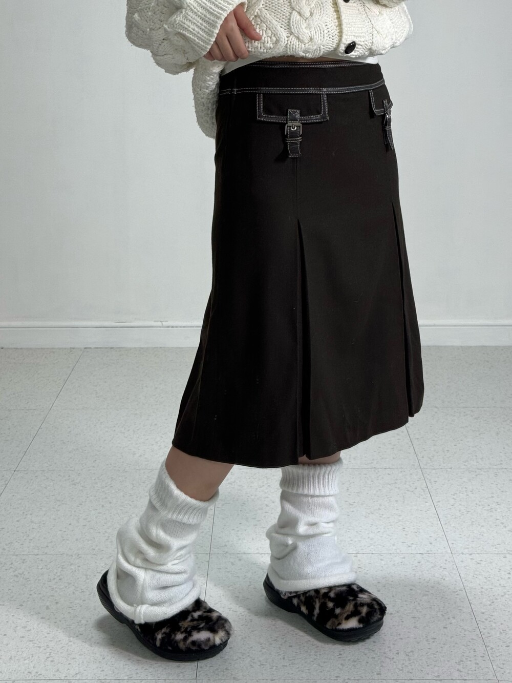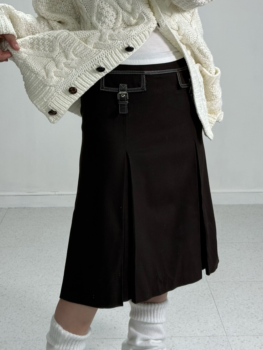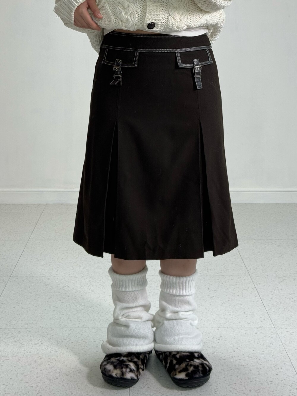 •가을 겨울에 입기 좋은 도톰한 원단의 브라운 스커트에요! 미디기장이라 더욱 엔틱하고 귀엽게 착용해주시기도 좋은 아이템이에요 ㅎㅎ 레더 스트랩 포인트까지 완벽 🖤