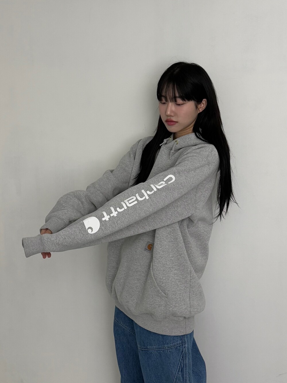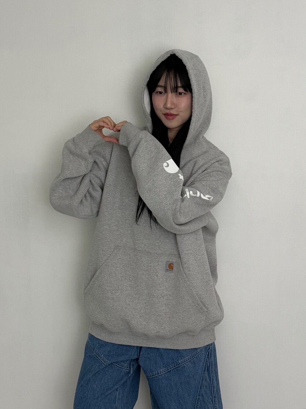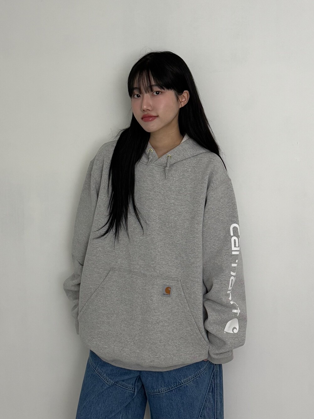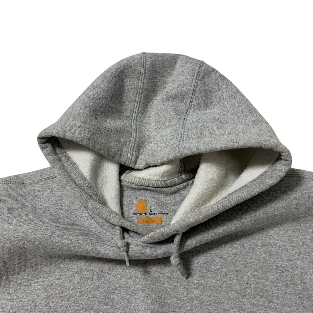 •칼하트 그레이 후디~~ 안감이 도톰한 기모로 들어가있어 굉장히 따숩습니다 히히. 소매에 칼하트 로고가 크게 들어가있어 심심하지 않게 착용하실 수 있어요! 퀄리티도 아주 굿ㅎ.ㅎ