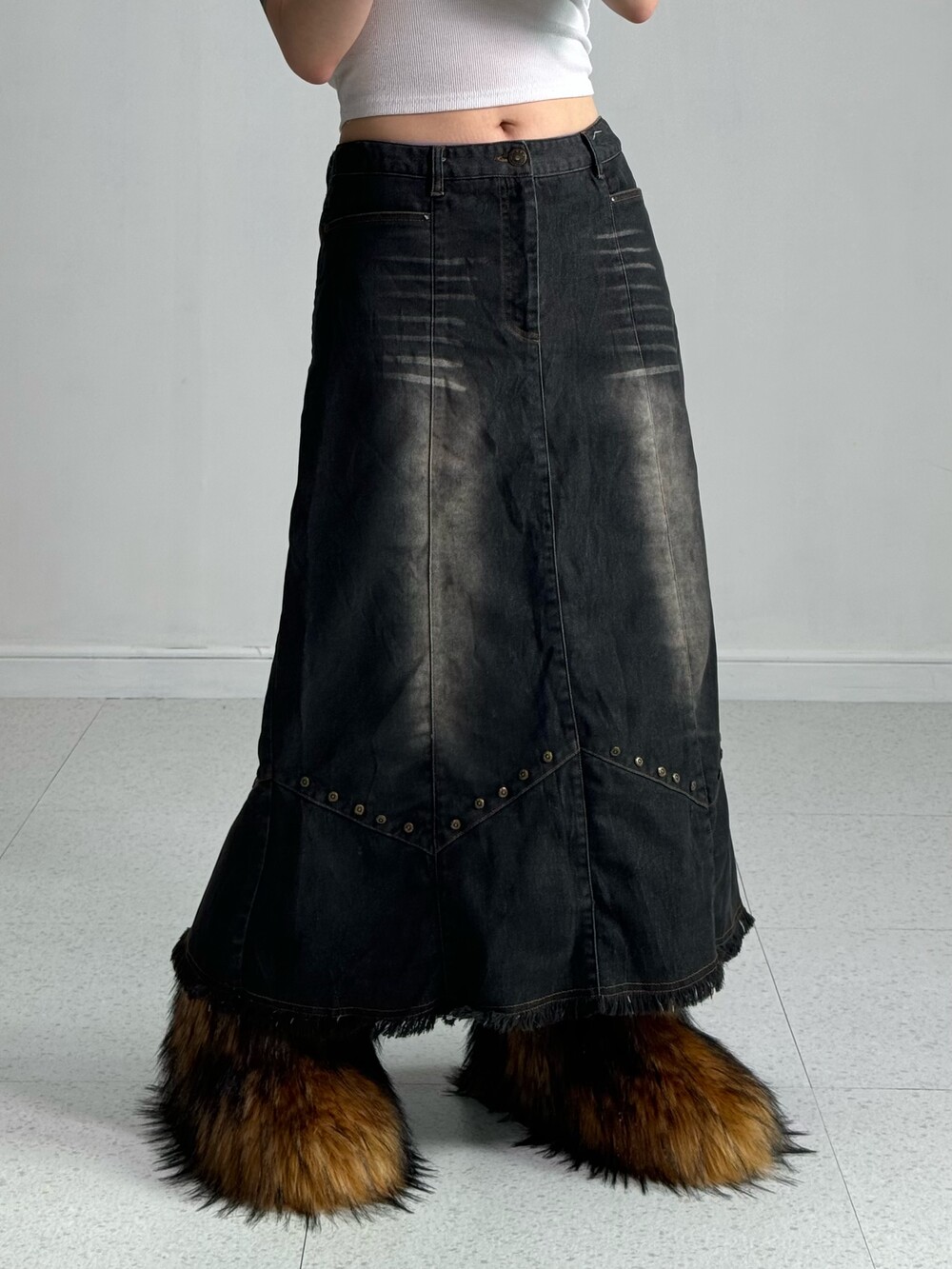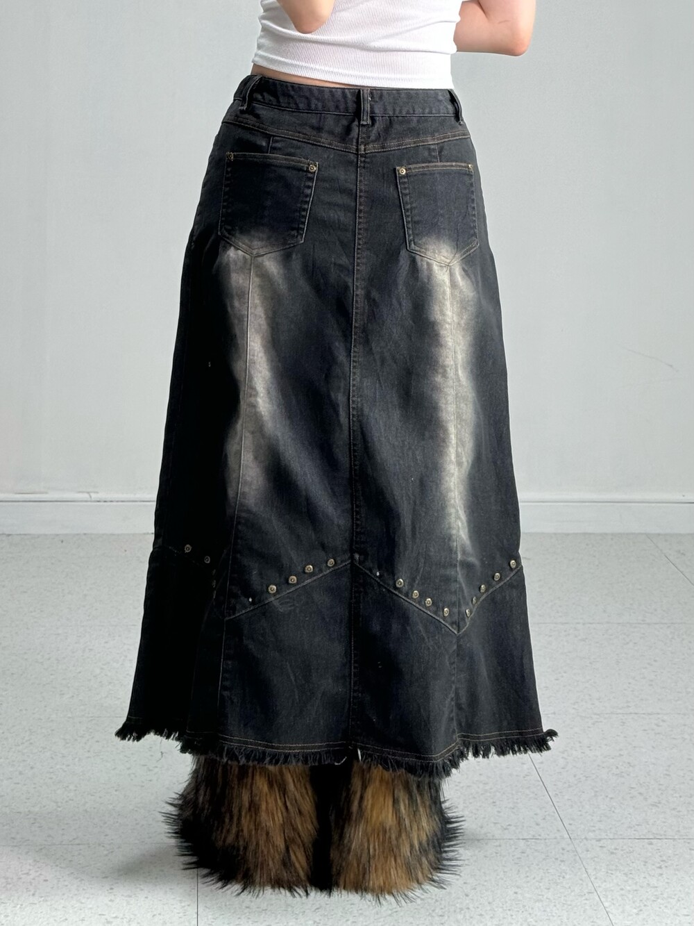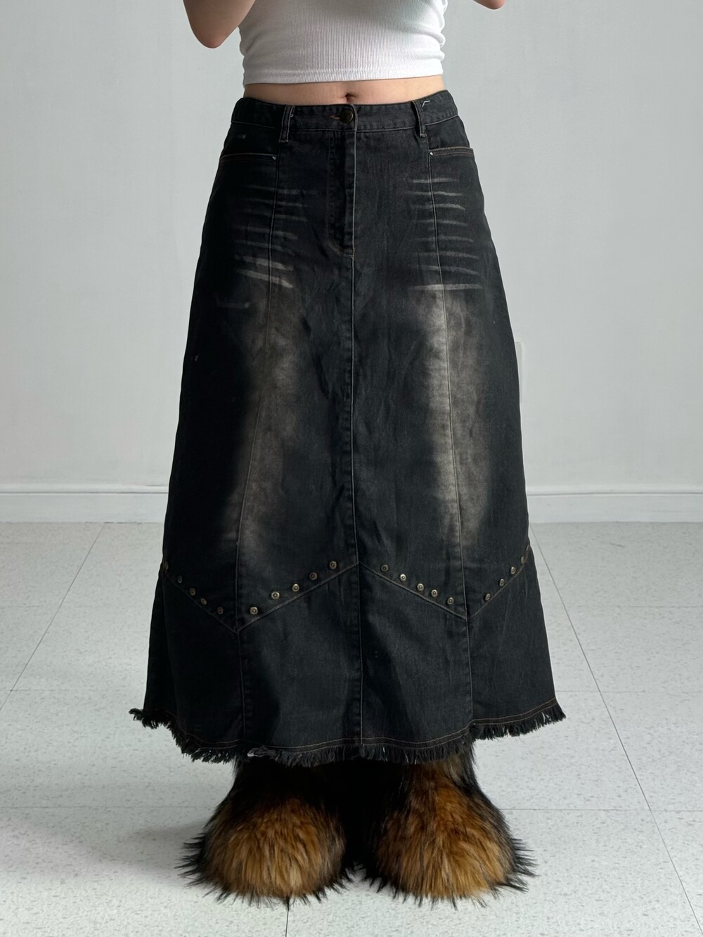 •전체적인 색감은 블랙에 워싱이 들어간 빈티지 스커트 라고 생각해주시면 됩니다! 밑단쪽에 디테일과 빈티지한 찡이 박혀있어 더욱 멋스러운 스커트에요 🖤