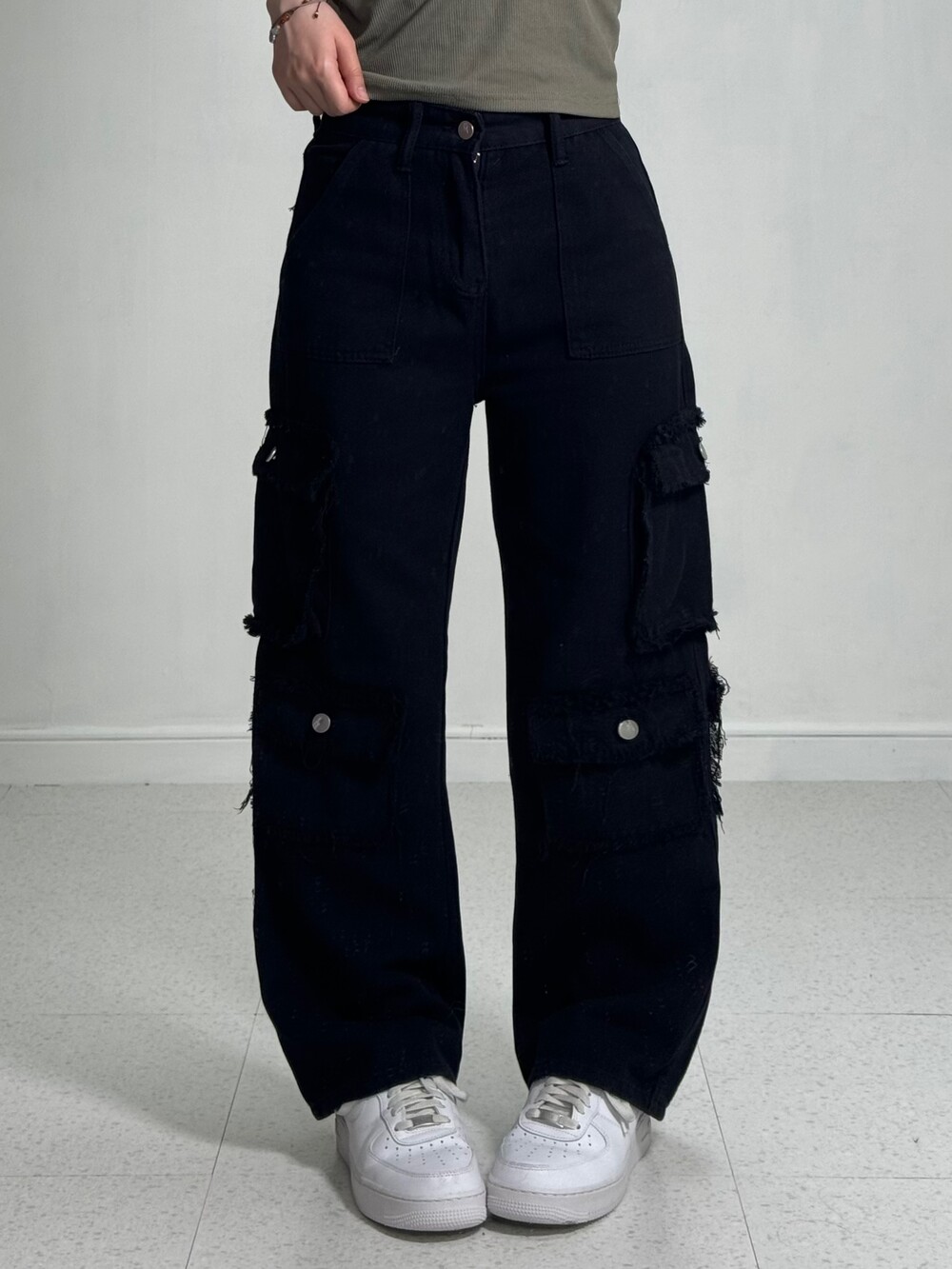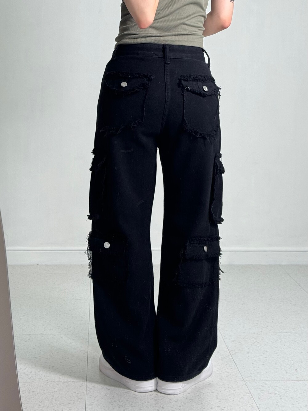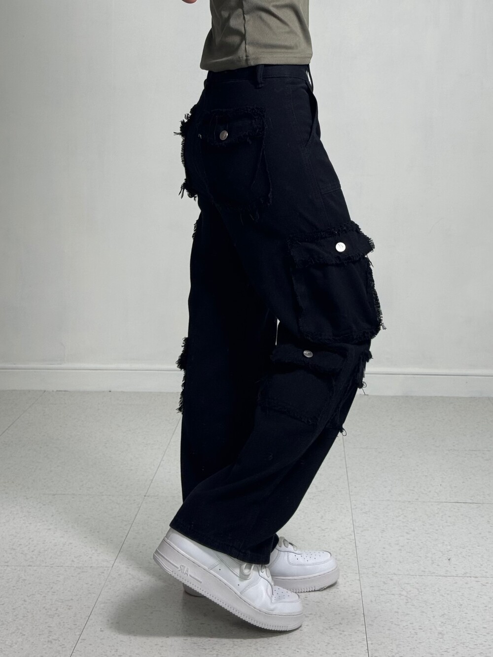•그런지한 무드의 블랙 카고팬츠 입니다! 핏 자체는 깔끔한 편이라 너무 와이드한 느낌 보단 깔끔멋쟁이룩을 즐기시는분께 추천드리고 싶은 제품이에요ㅎㅎ