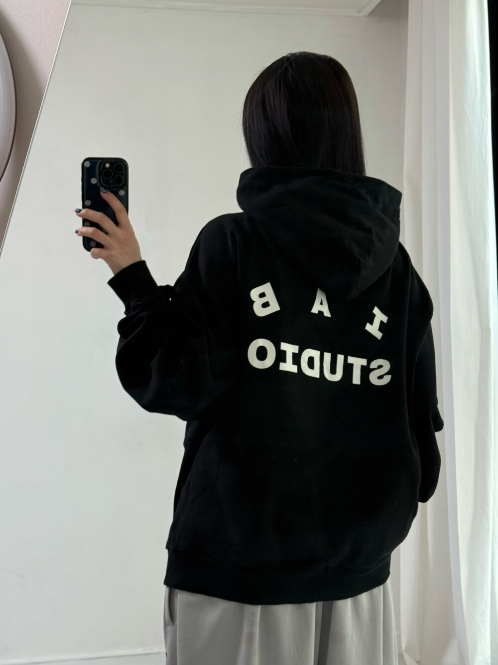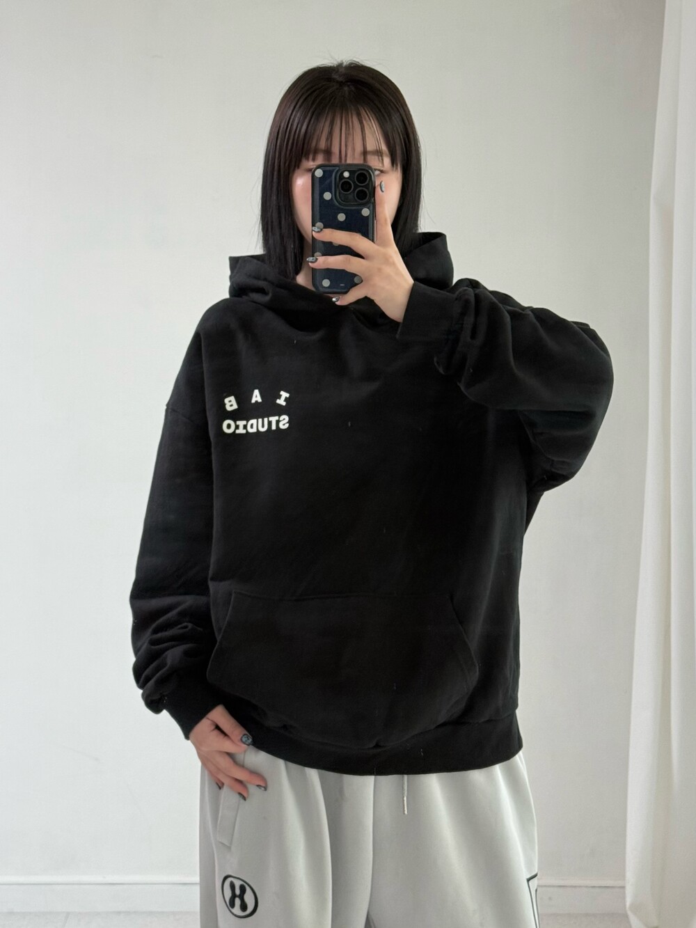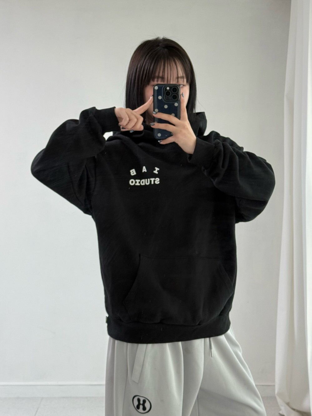•아이엡스튜디오 블랙 후디 입니다. L사이즈라 오버핏으로 입어주시기 좋은 제품이에요. 기모x