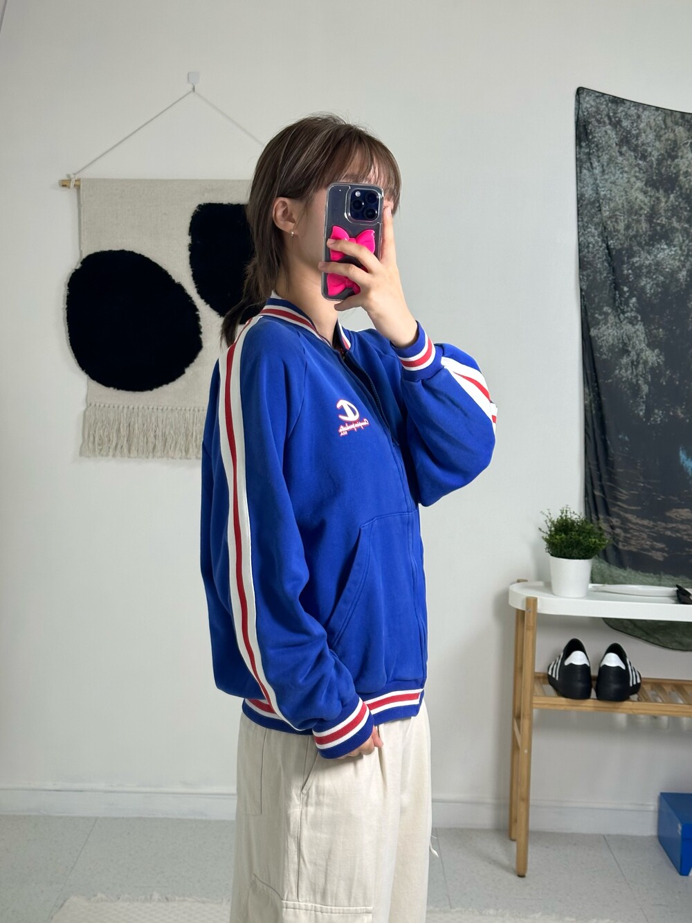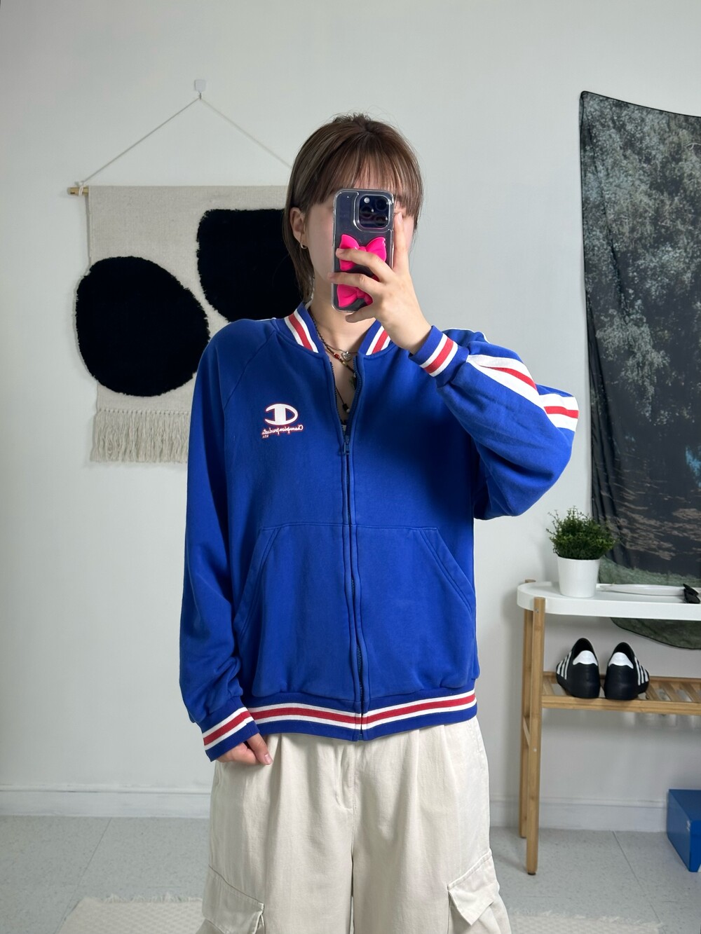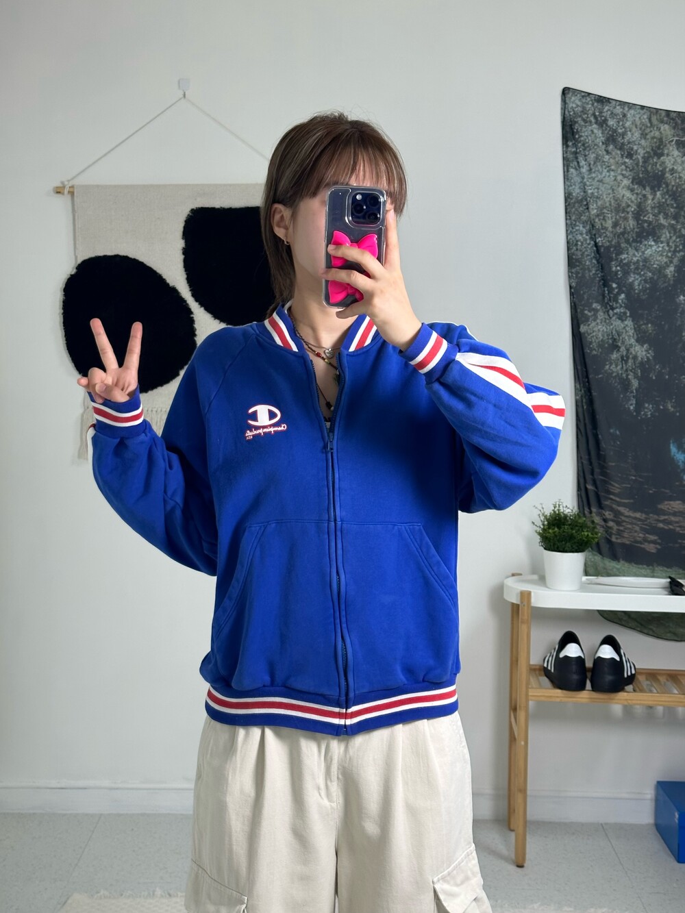 •쨍한 블루 컬러감과 올드스쿨 느낌 낭낭한 챔피온 집업이에요! 입었을때 아방폭닥한 핏으로 떨어져서 넘 사랑스럽고 마음에 든 제품이에요<3 시보리에 레드와 화이트 컬러가 더해져서 더욱 귀엽게 연출할 수 있다는 점! 힙한 느낌은 덤🖤