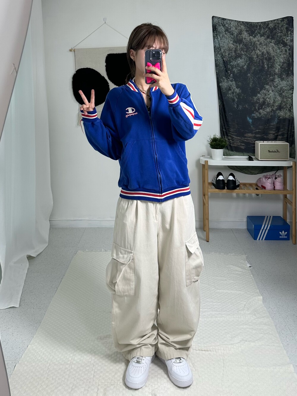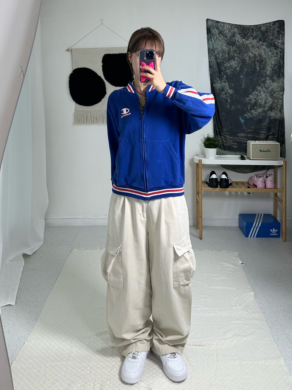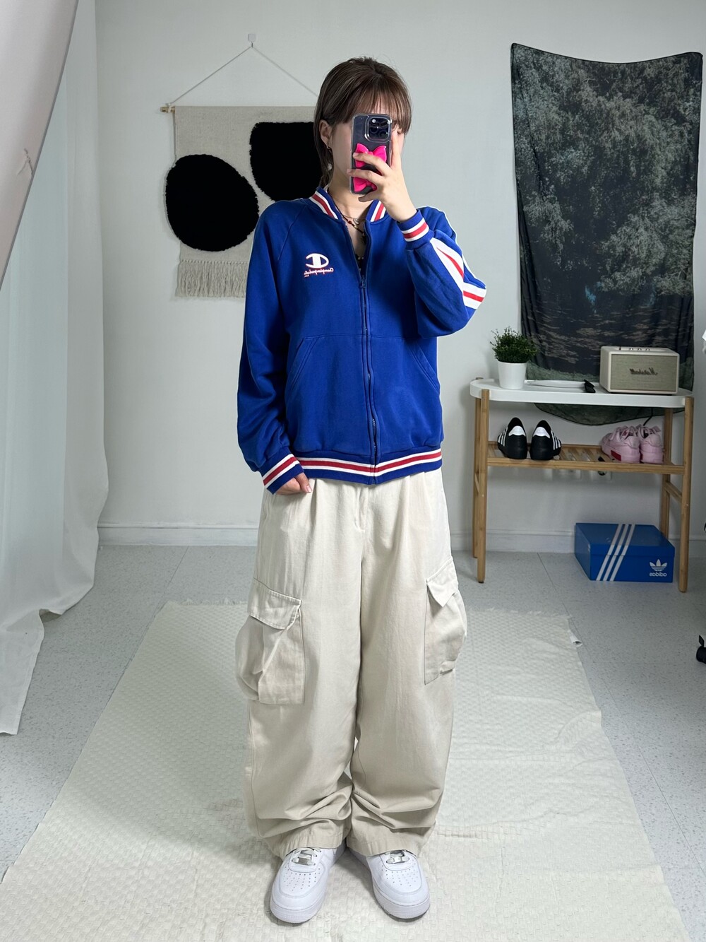 •쨍한 블루 컬러감과 올드스쿨 느낌 낭낭한 챔피온 집업이에요! 입었을때 아방폭닥한 핏으로 떨어져서 넘 사랑스럽고 마음에 든 제품이에요<3 시보리에 레드와 화이트 컬러가 더해져서 더욱 귀엽게 연출할 수 있다는 점! 힙한 느낌은 덤🖤