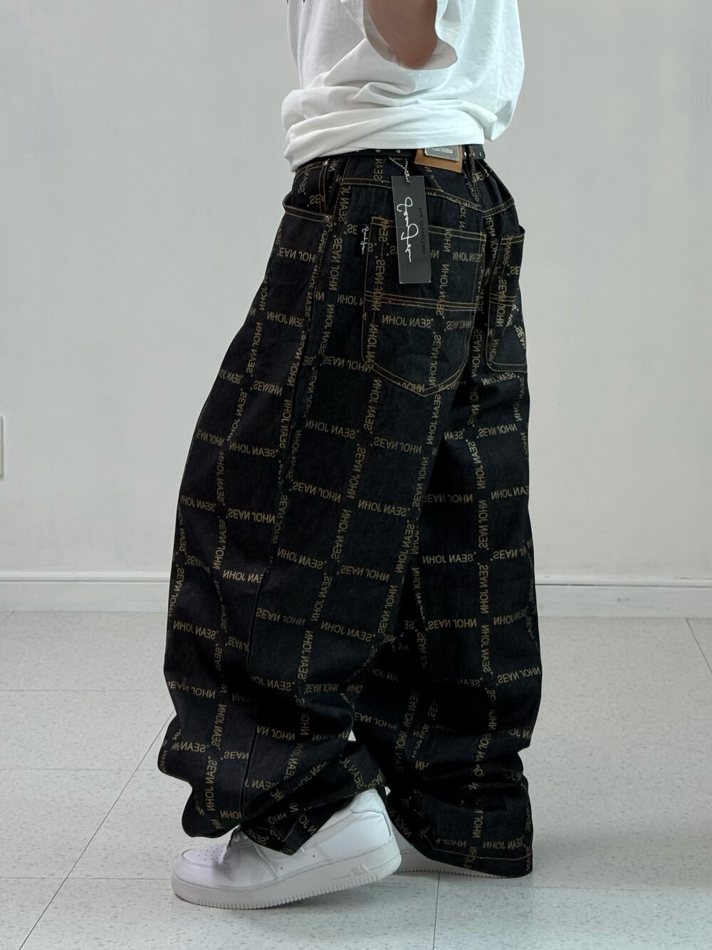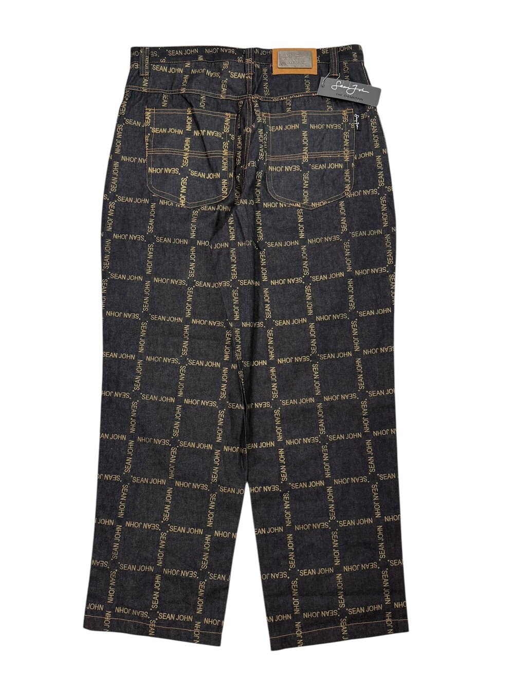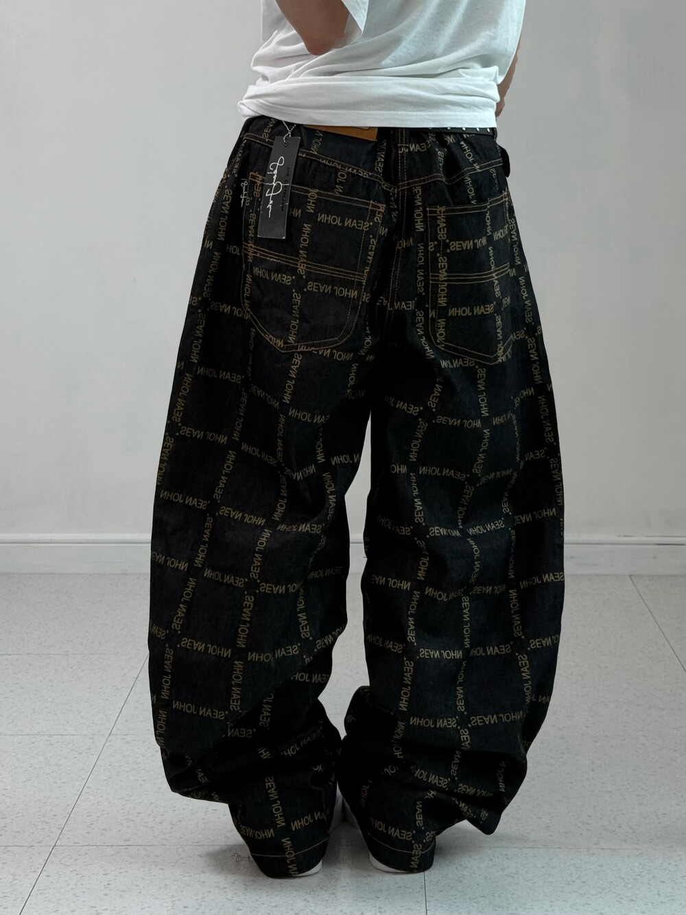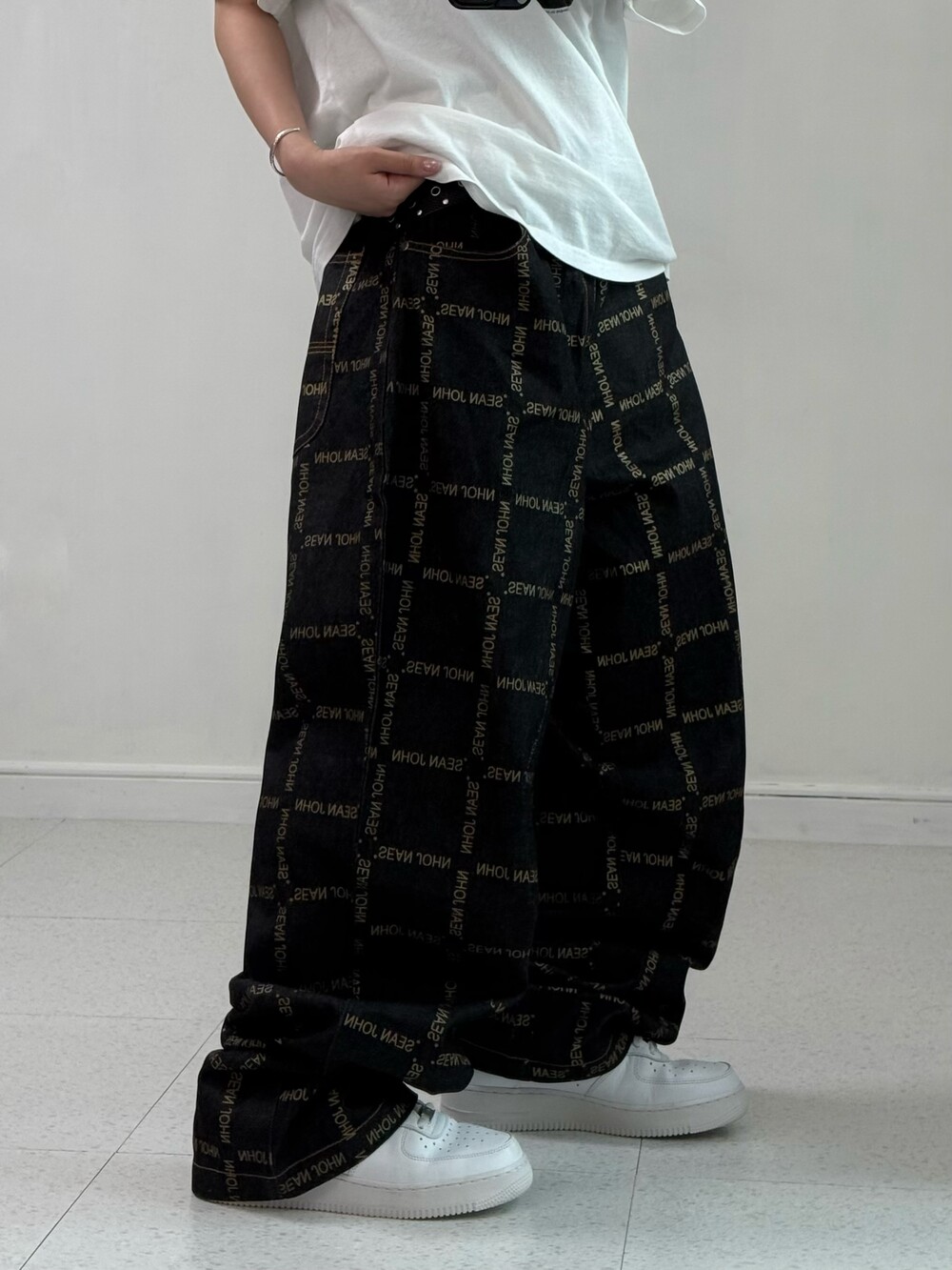 •션존 로고 패턴이 멋드러지게 들어가있는 흑청 와이드 팬츠 입니다. 흑청에 골드컬러 로고가 들어가있어 더욱 멋스럽게 착용해주시기 좋아요ㅎㅎ🖤