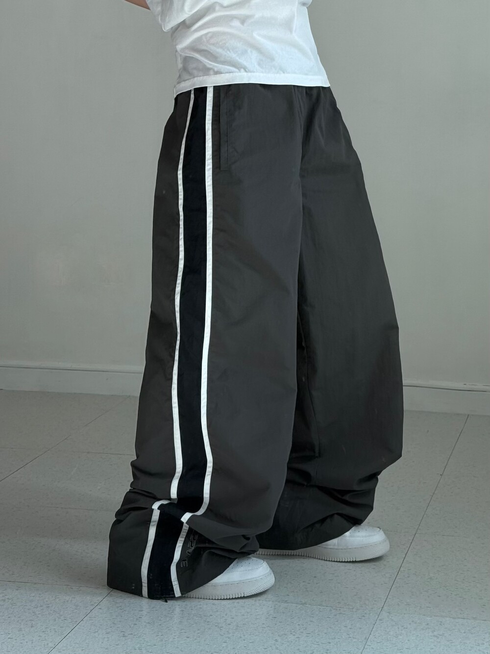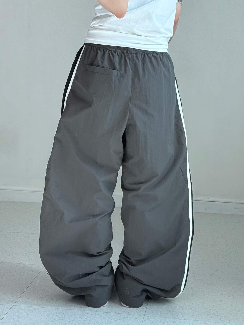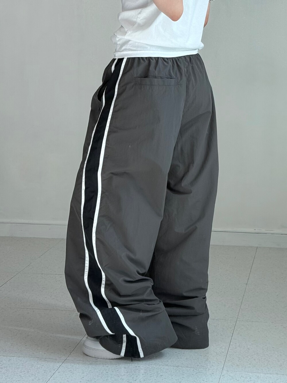 •아메스 트랙팬츠 입니다! 차콜+블랙 조합의 데일리 팬츠에 밑단 로고까지..! 와이드핏이 넘 예쁜 아이템이에요 ㅎㅎ