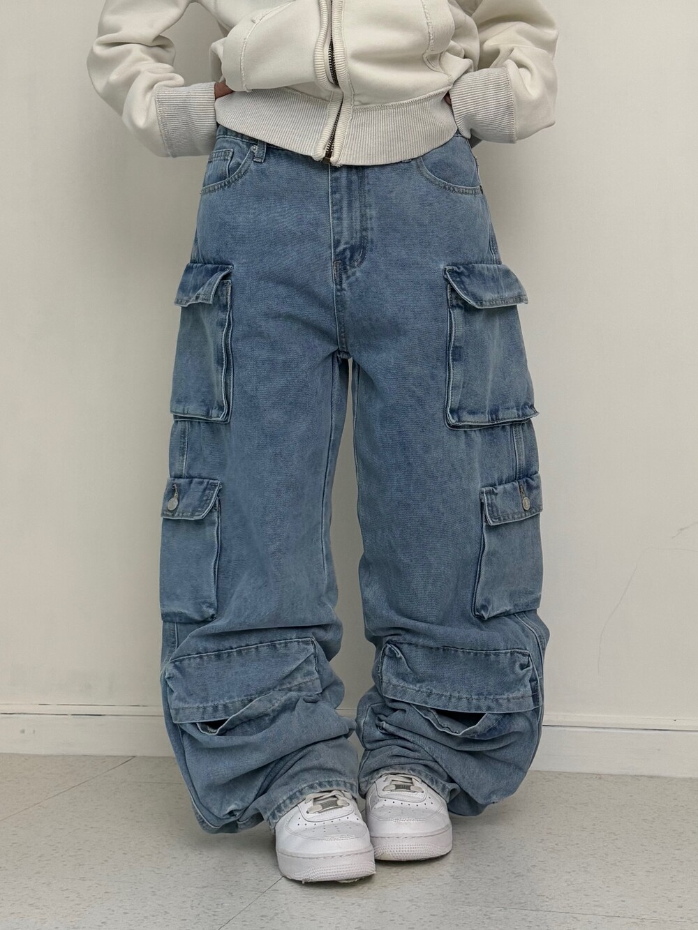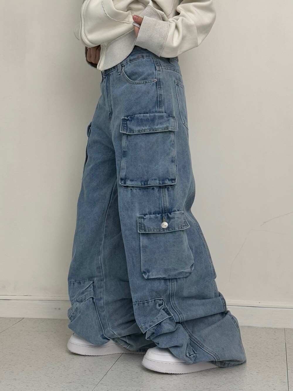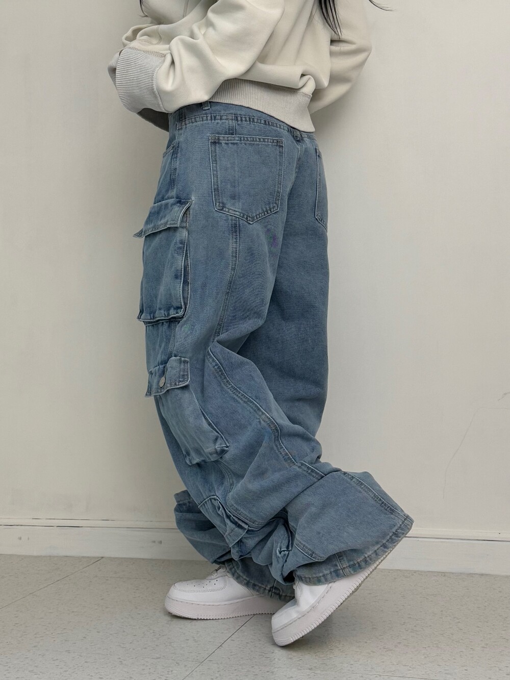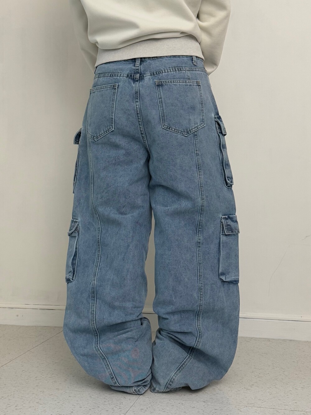 •멀티포켓 디자인의 데님 카고팬츠 입니다. 와이드하면서 묵직하게 떨어지는 핏이라 멋스럽게 포인트로 입어주시기 좋은 팬츠랍니다!