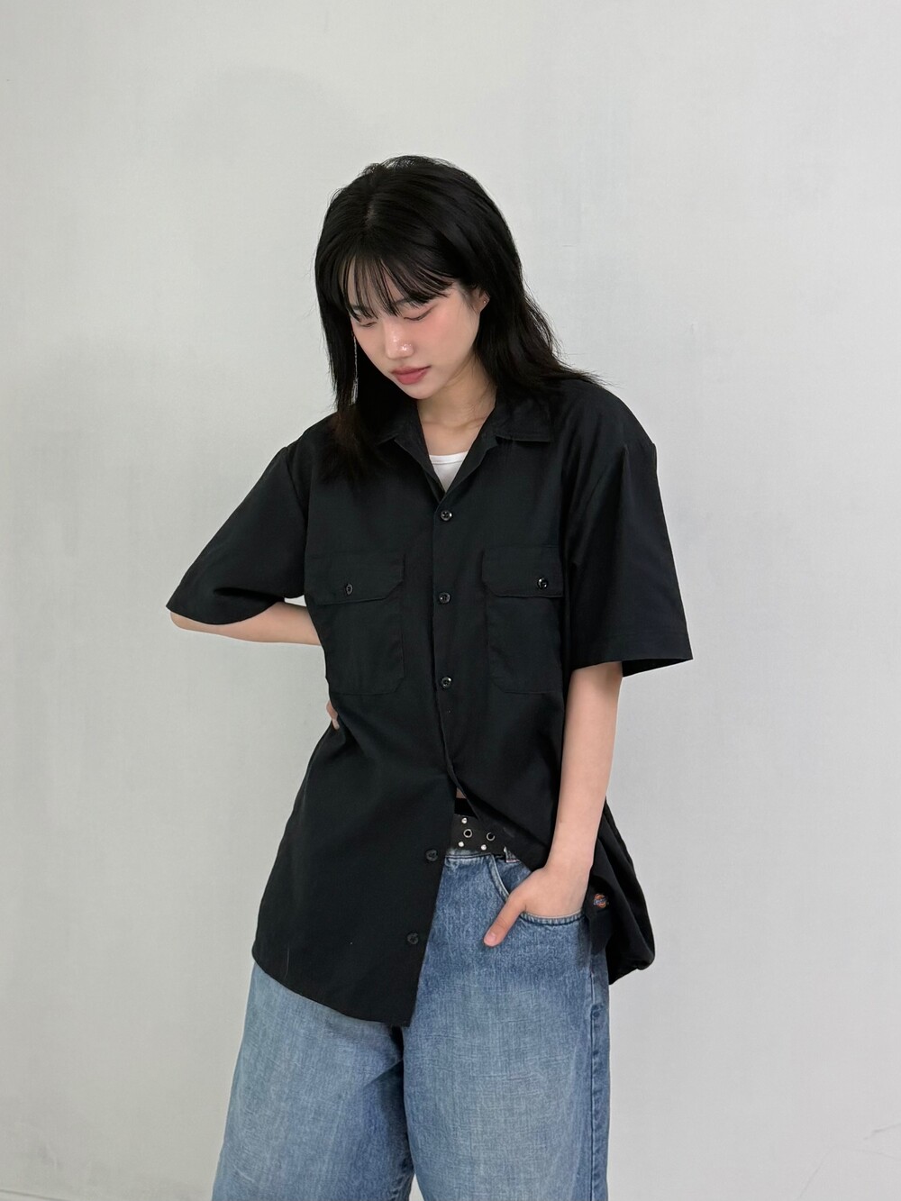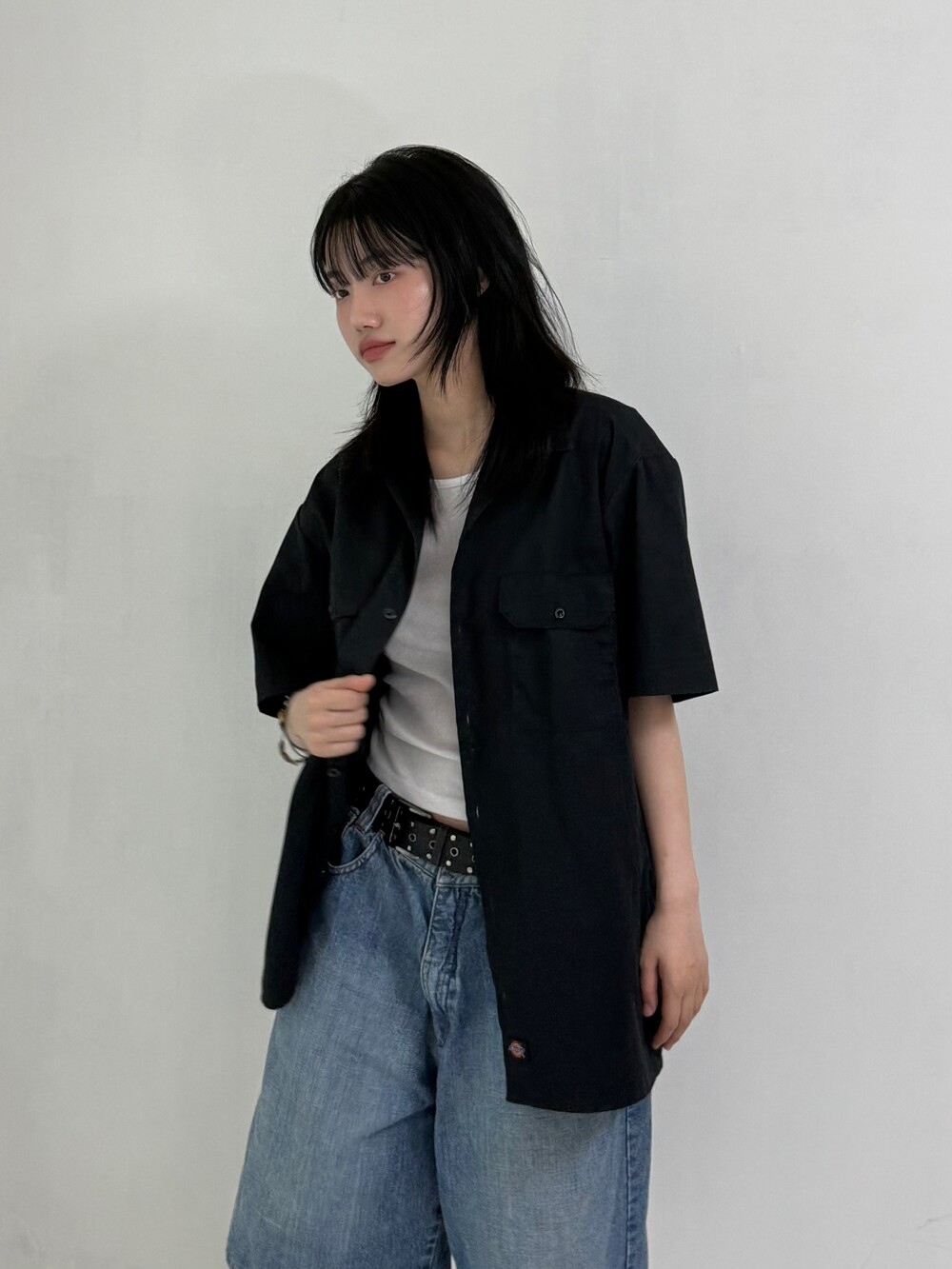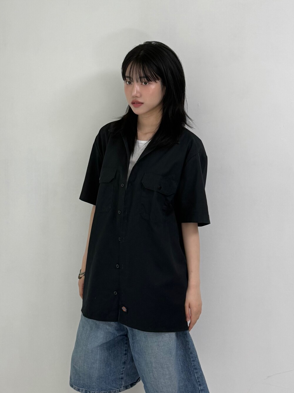 •디키즈 워크 반팔셔츠! 처음보여드리는데 심지어 블랙 이라니- 휘뚤마뚤 코디하기 쉬운 제품이라 데님 버뮤다랑만 매치해주셔도 좋습니다ㅎ.ㅎ