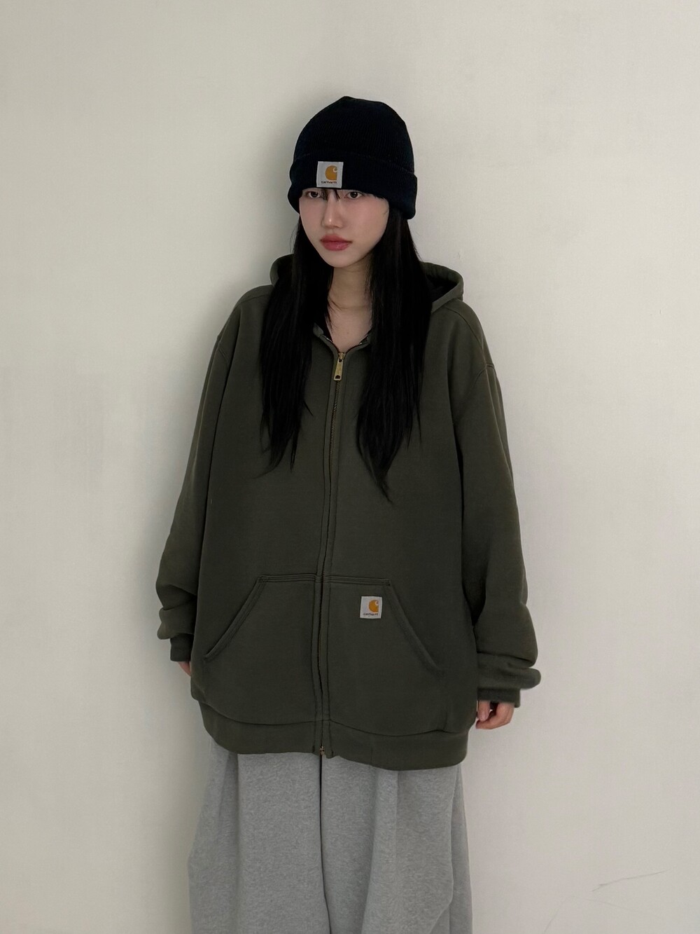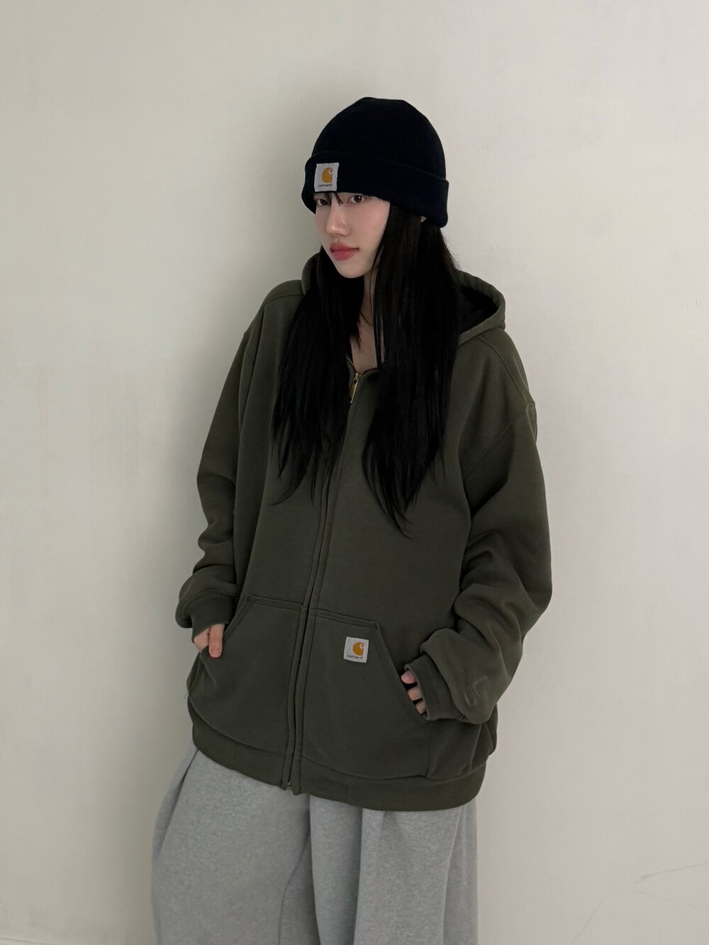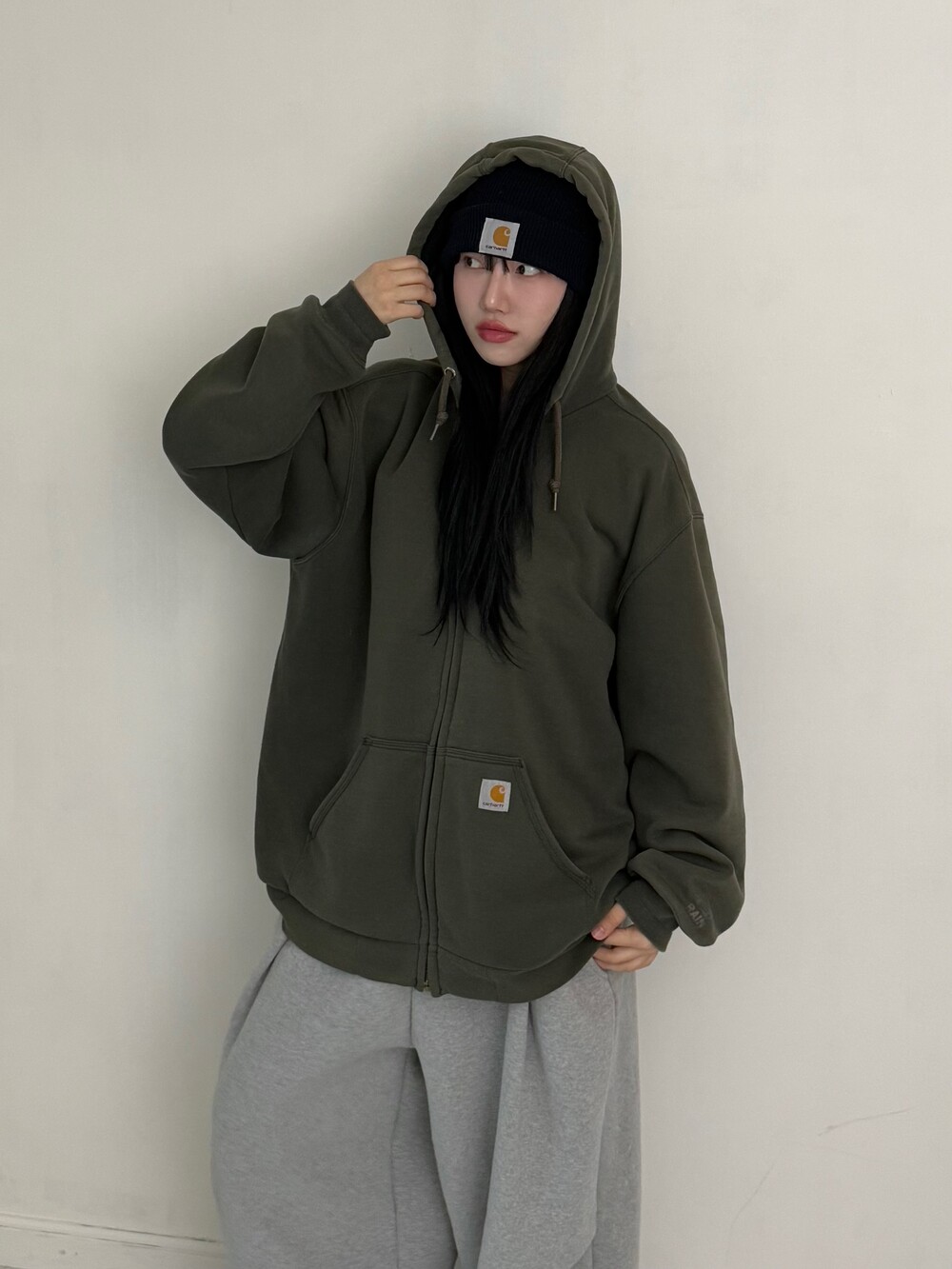 •블랙,브라운,그레이 컬러는 많이 보여드렸지만 카키 칼하트는 처음이죠>,< 입었을때 헤비하게 떨어지는 핏이라 힙하게 입어주시기 좋아요! 안감도 탄탄하게 들어가있고 후드 써도 예쁘죠 히히