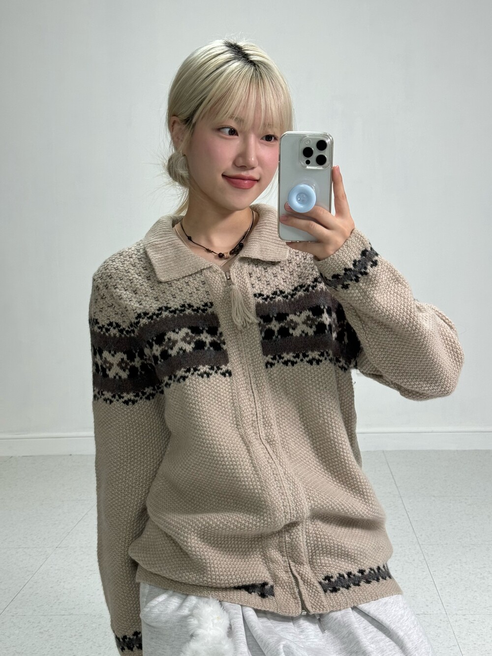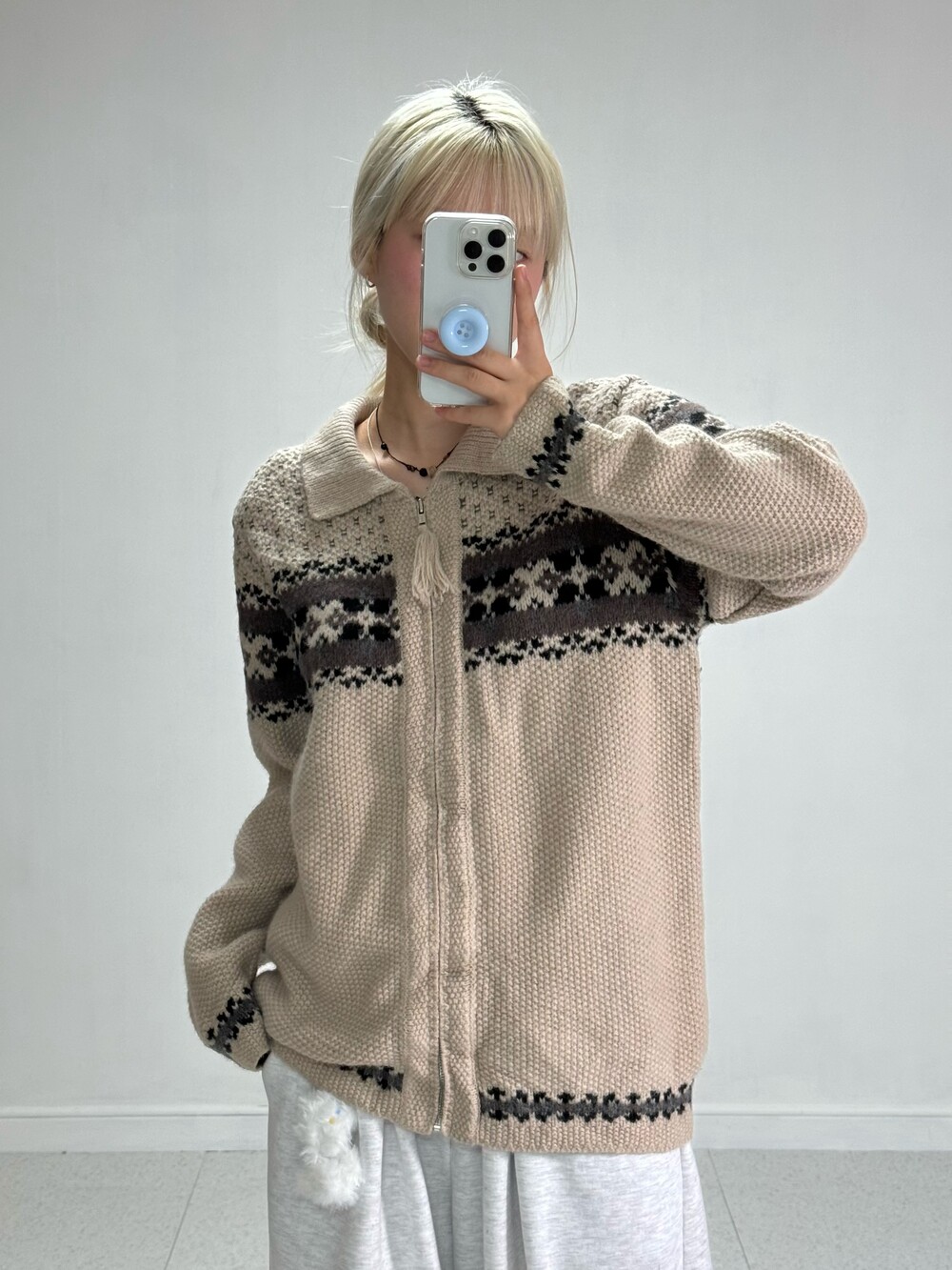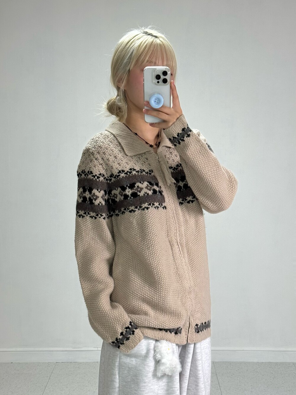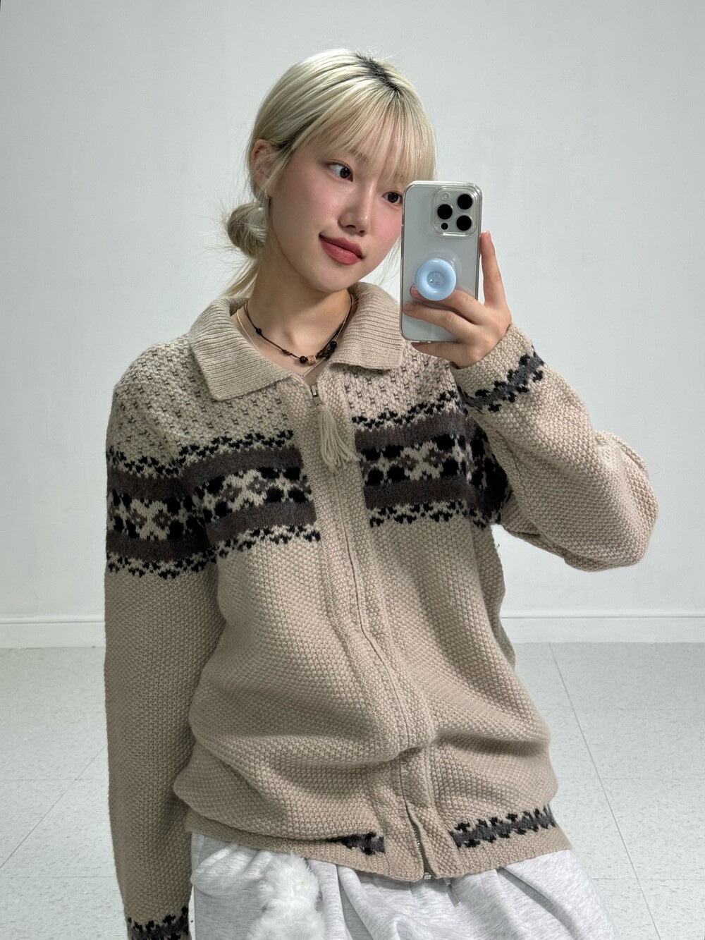 •은은하게 밀크티 향이 날거같은 연한 베이지 느낌의 노르딕 집업! 아방루즈묵직핏이 굉장히 귀엽고 부담스럽지 않은 디자인이라 지금부터 1월까지도 쭉쭉 입어주시기 좋아요! 👍