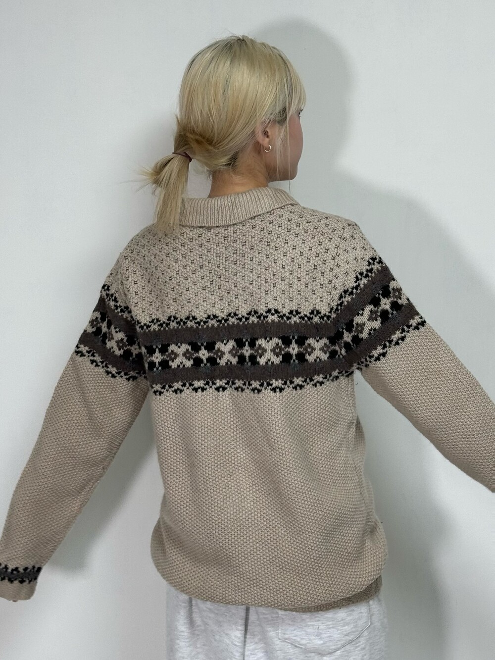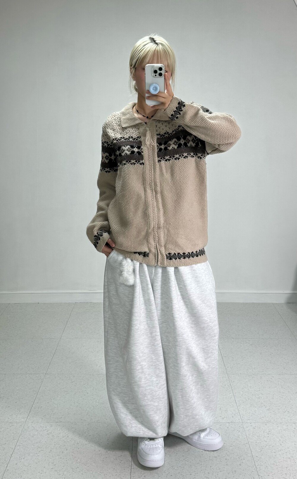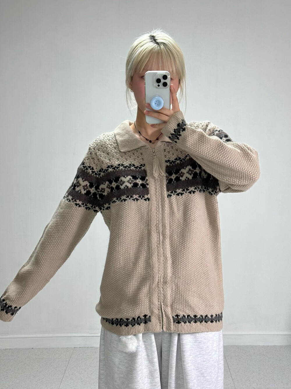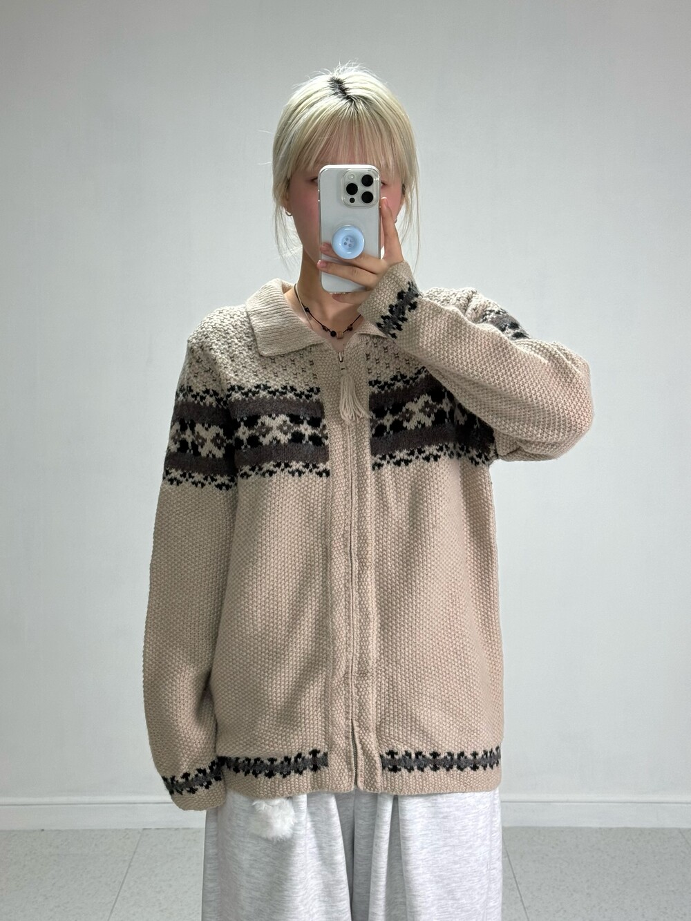 •은은하게 밀크티 향이 날거같은 연한 베이지 느낌의 노르딕 집업! 아방루즈묵직핏이 굉장히 귀엽고 부담스럽지 않은 디자인이라 지금부터 1월까지도 쭉쭉 입어주시기 좋아요! 👍