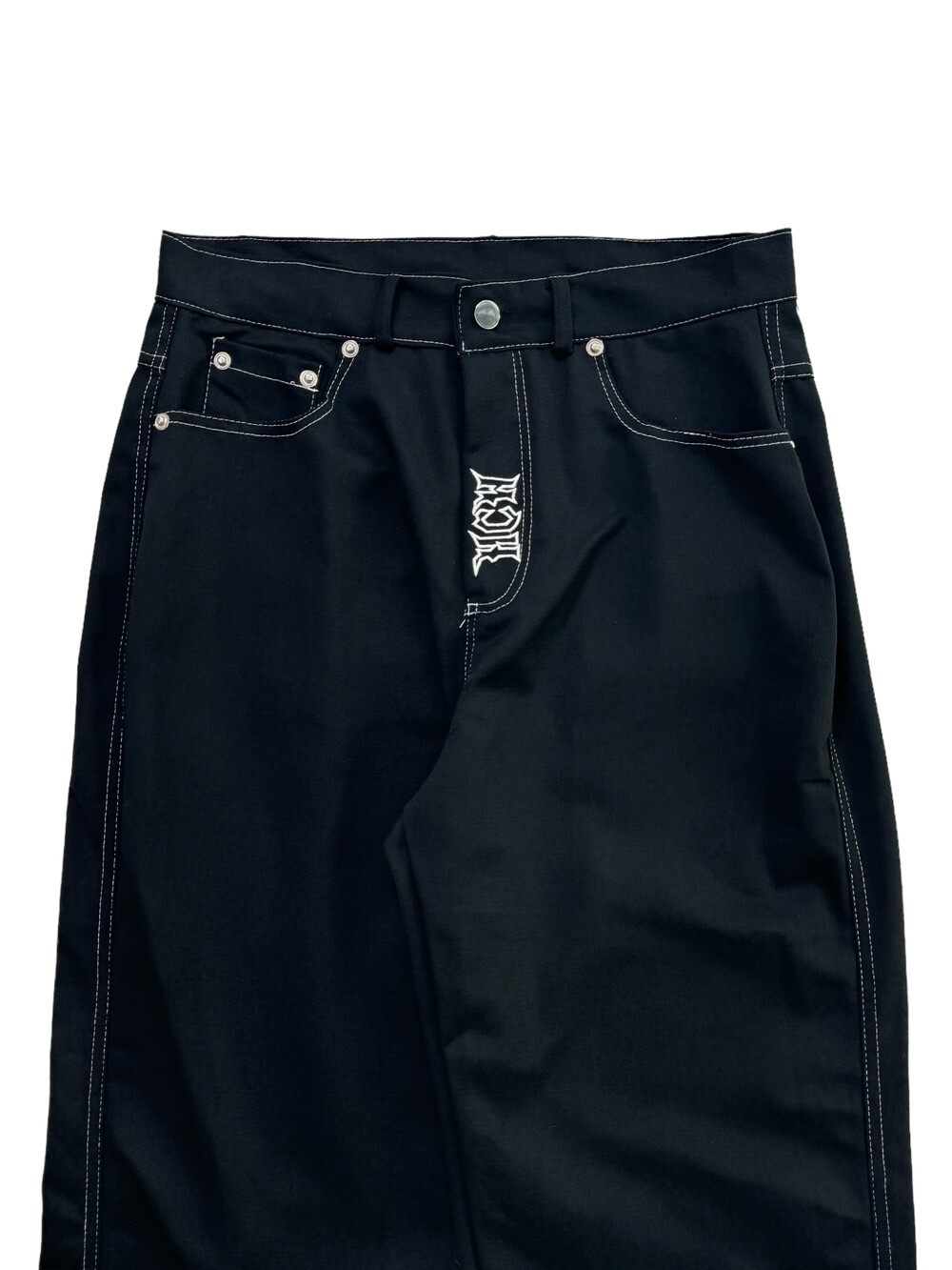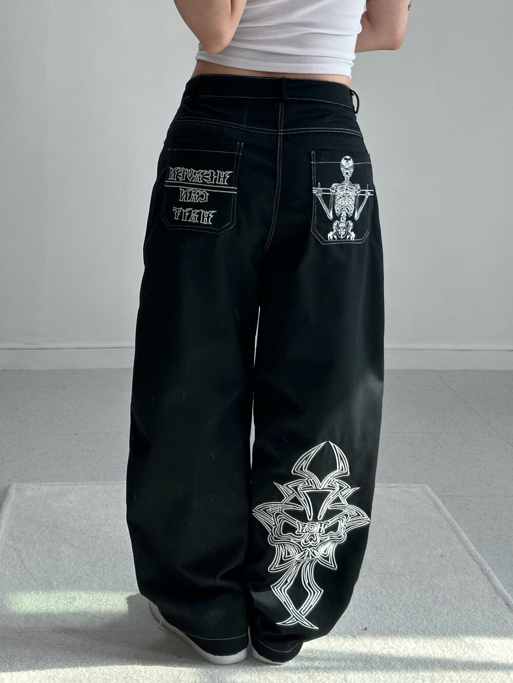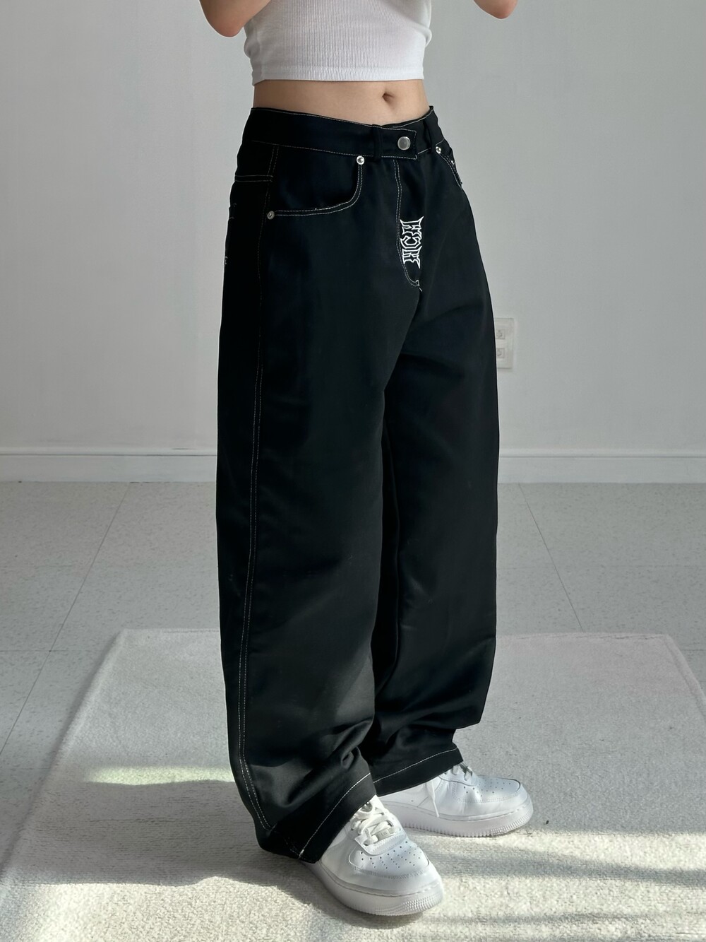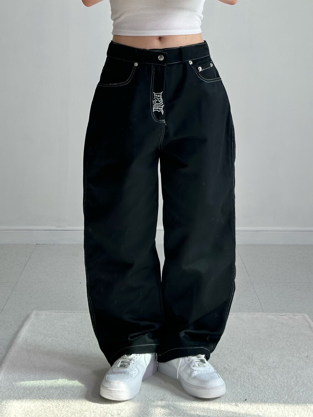 •블랙에 화이트 스티치 자수가 들어가있는 와이드 루즈핏 팬츠 입니다! 밑단쪽에 큼지막한 디자인이 들어가있어 더 독특하고 소장욕구 뿜뿜하게 만드는 팬츠인거같아요>,<