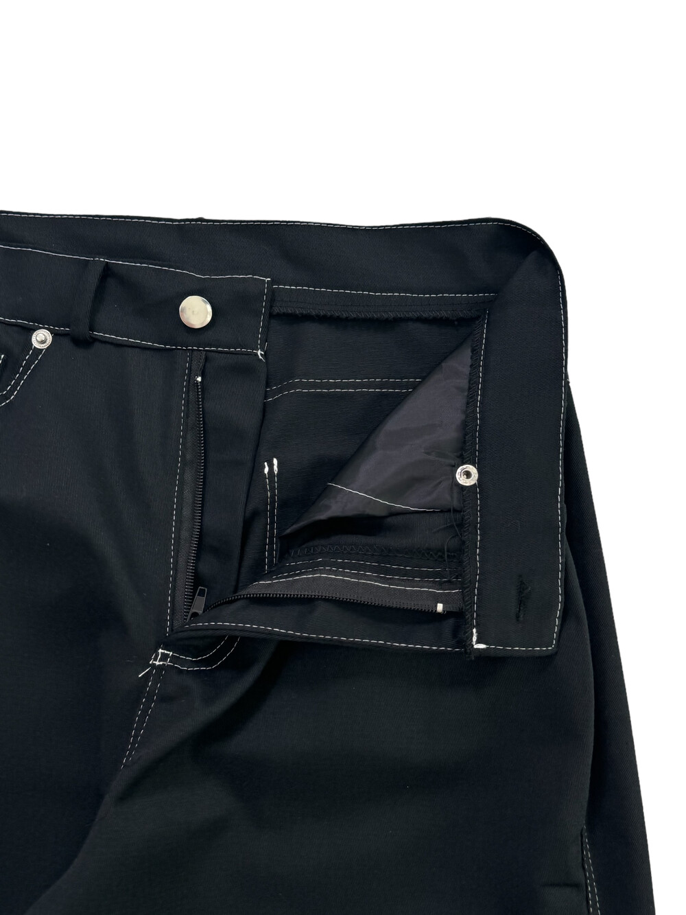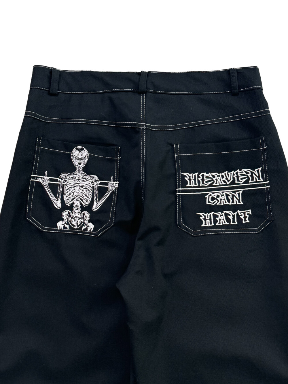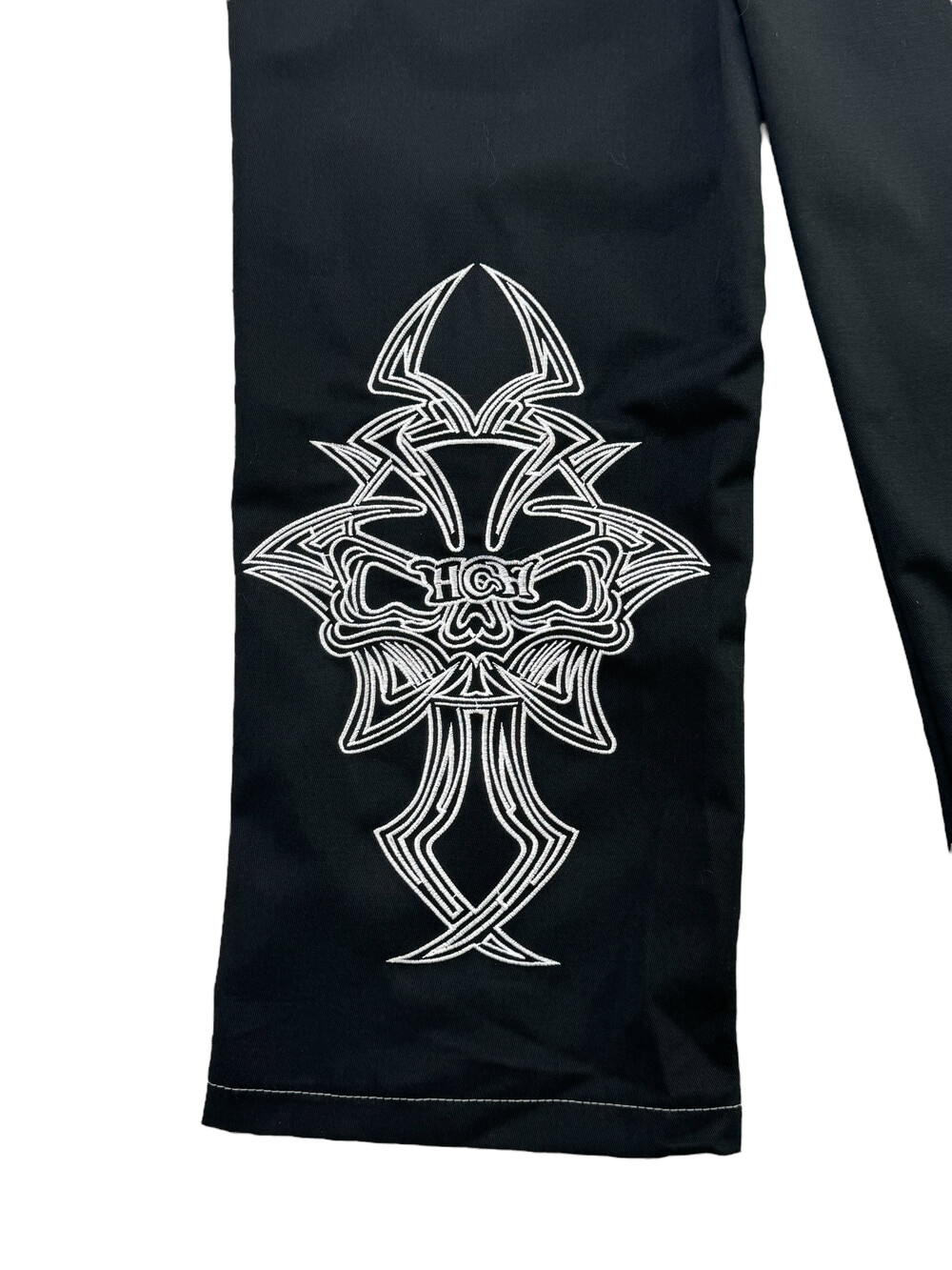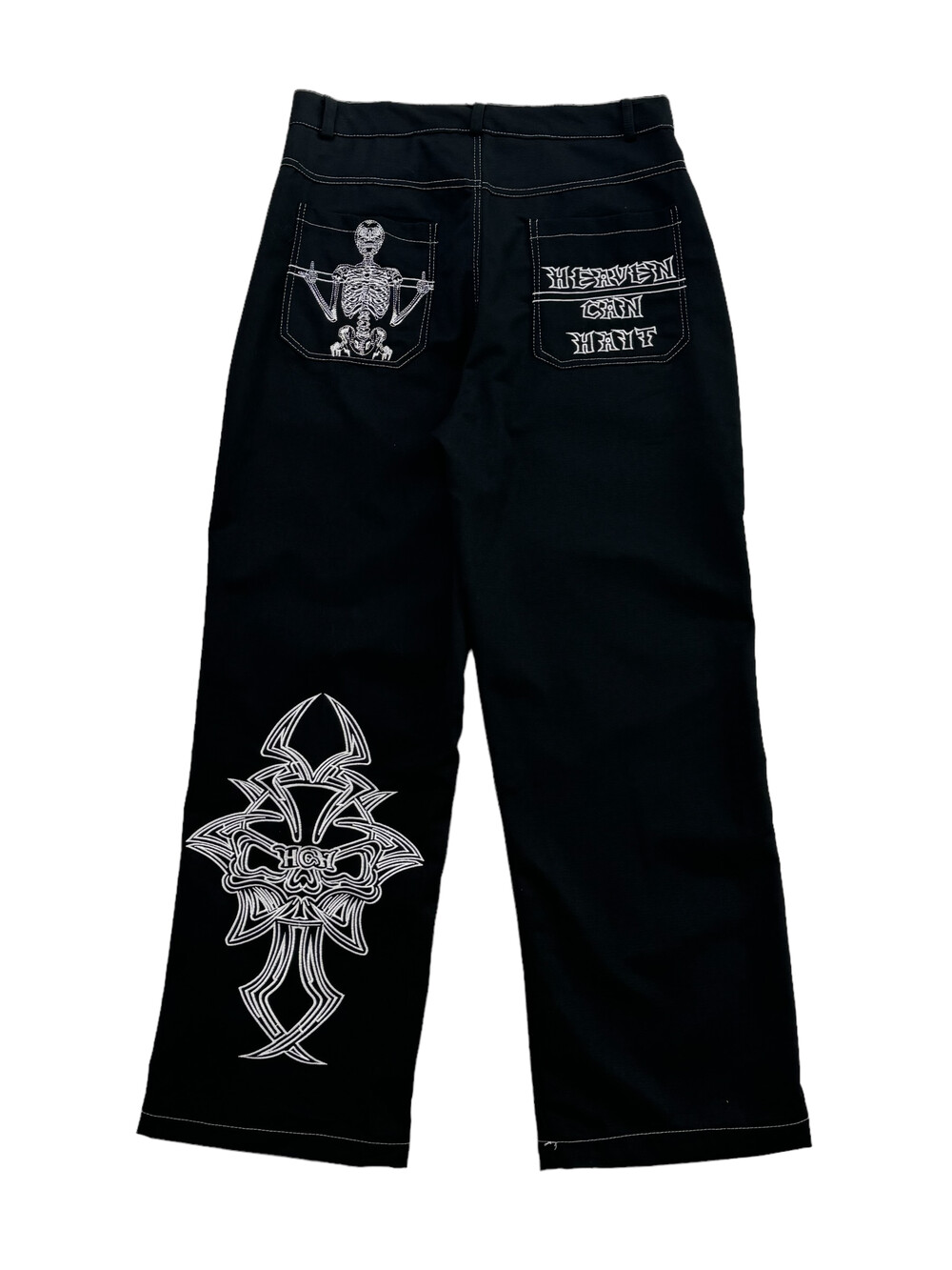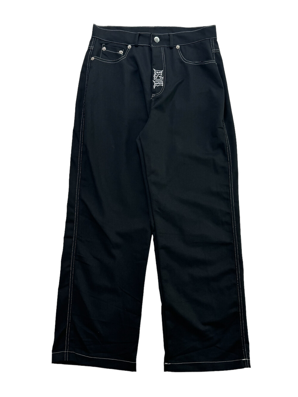 •블랙에 화이트 스티치 자수가 들어가있는 와이드 루즈핏 팬츠 입니다! 밑단쪽에 큼지막한 디자인이 들어가있어 더 독특하고 소장욕구 뿜뿜하게 만드는 팬츠인거같아요>,<