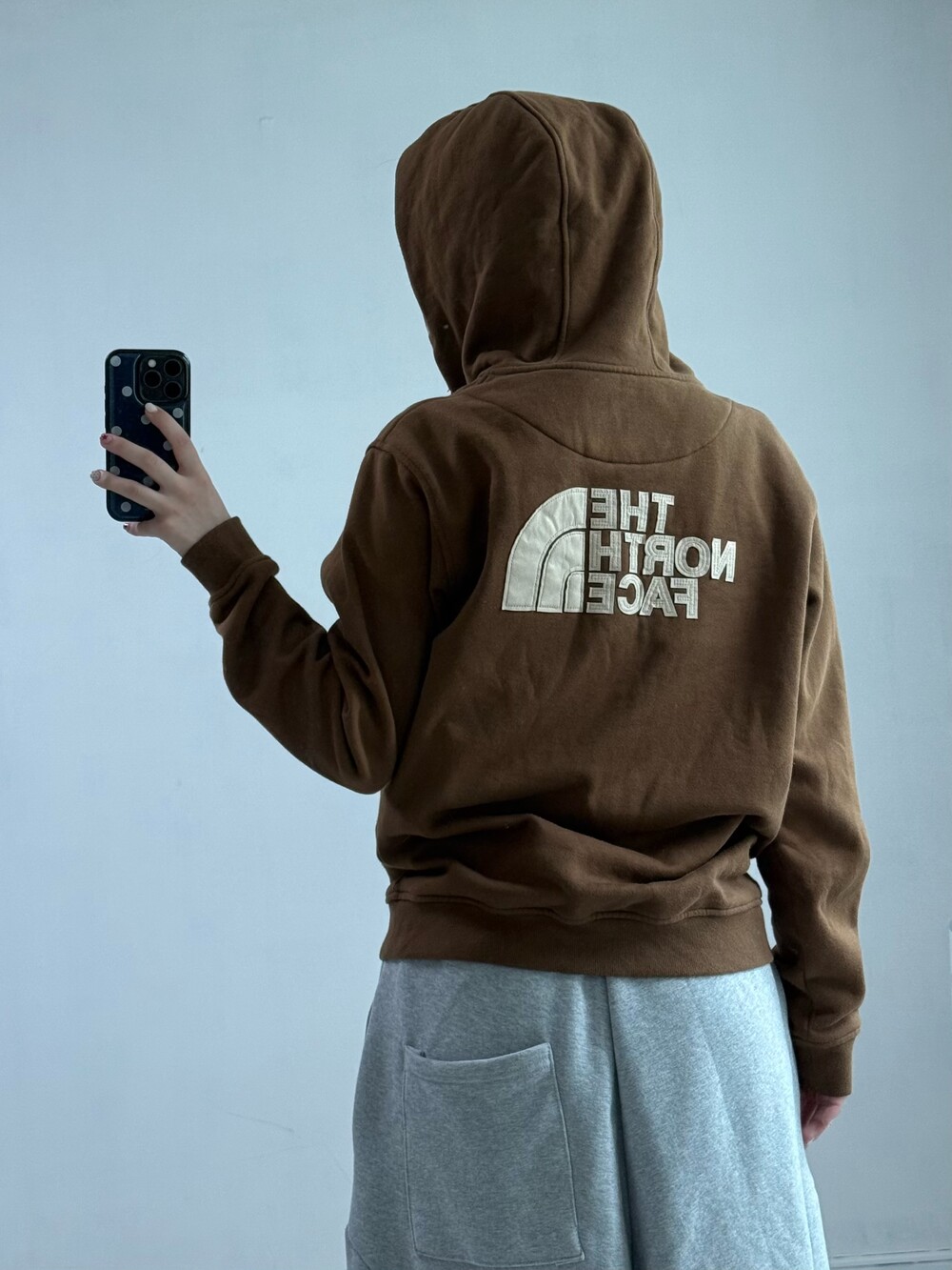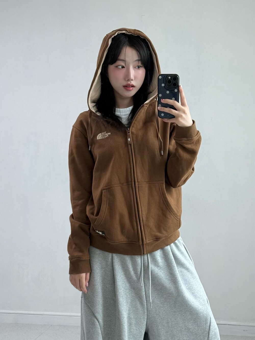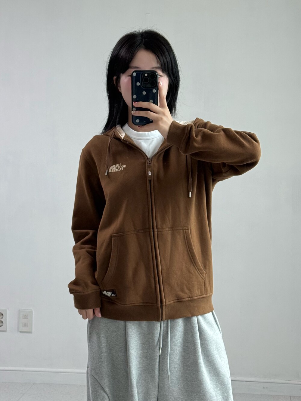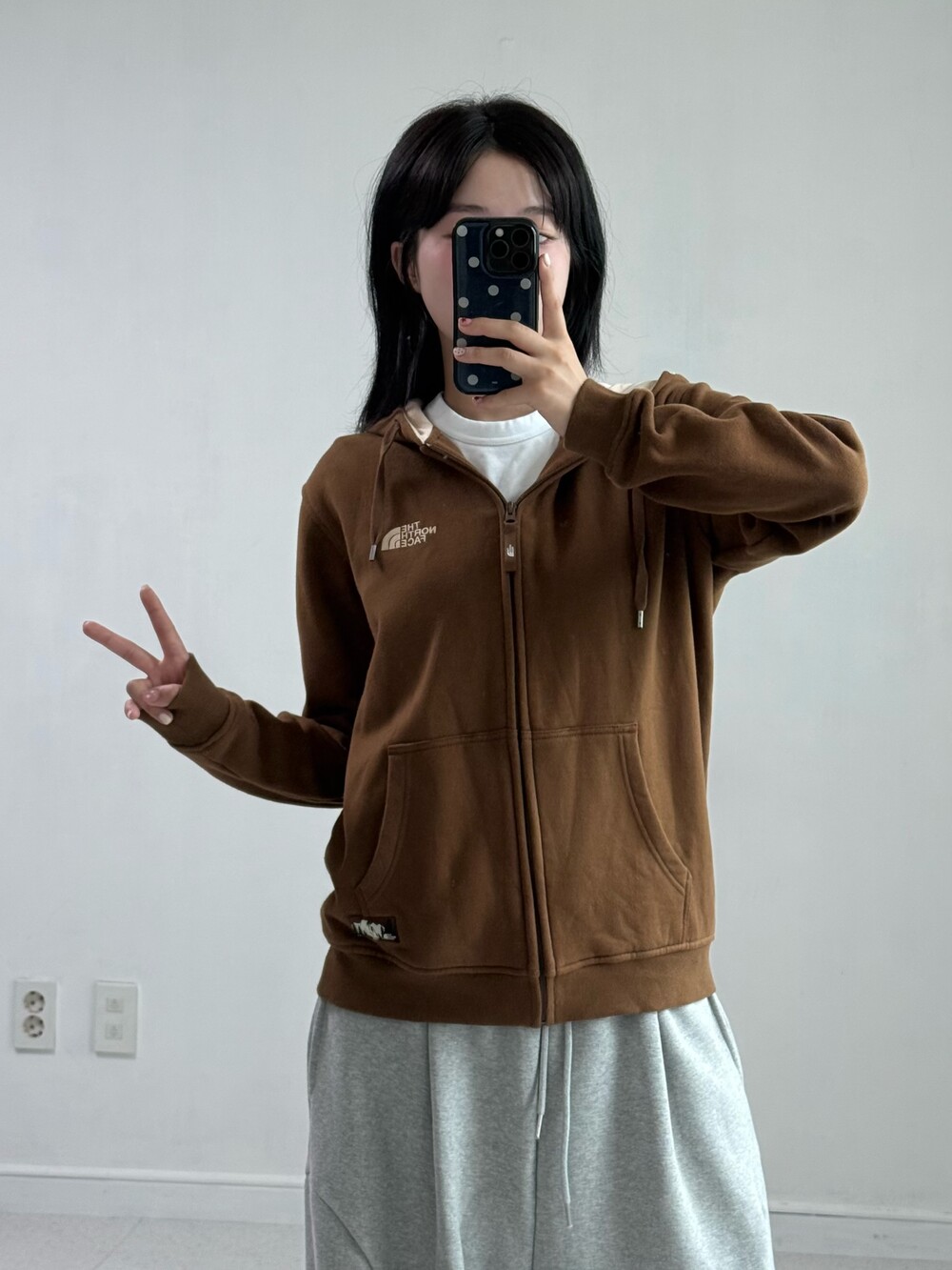 •노스페이스 브라운 후드집업 입니다! 후드사이즈도 널널하고 후드 안감이 크림컬러라 배색조합도 넘 좋아요ㅎㅎ 특히 등에 노페 빅로고 패치 디자인이 넘 예뿌