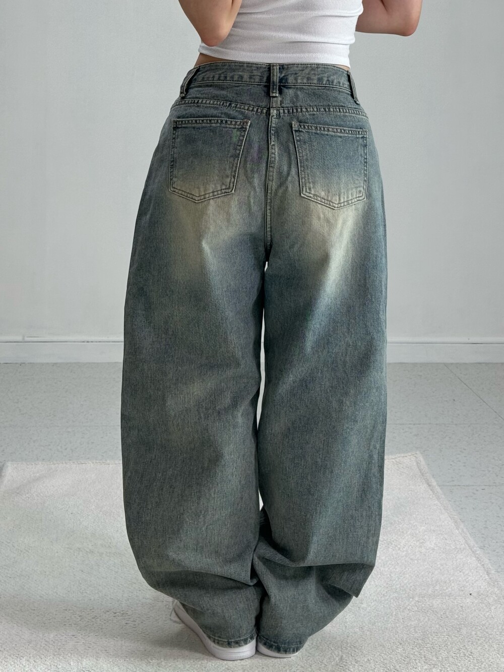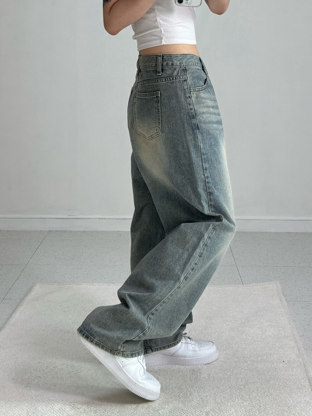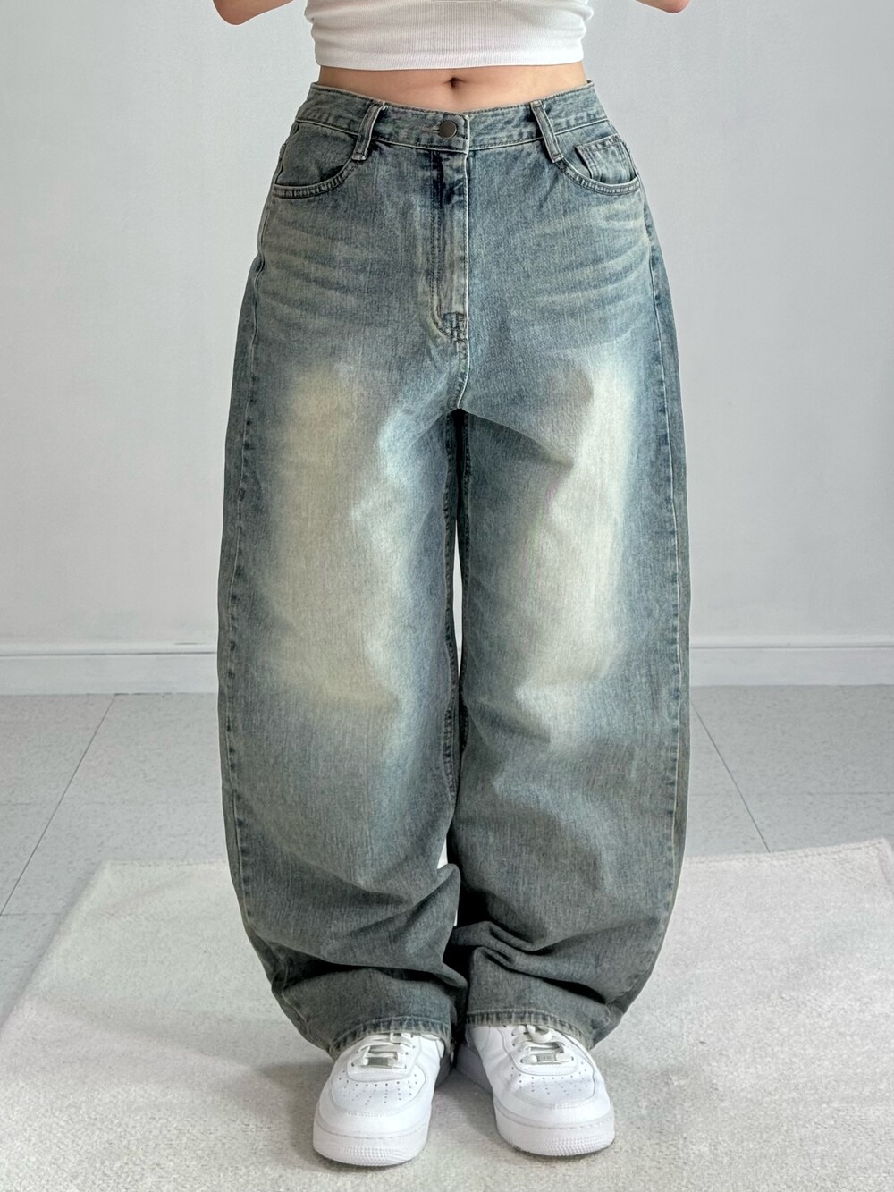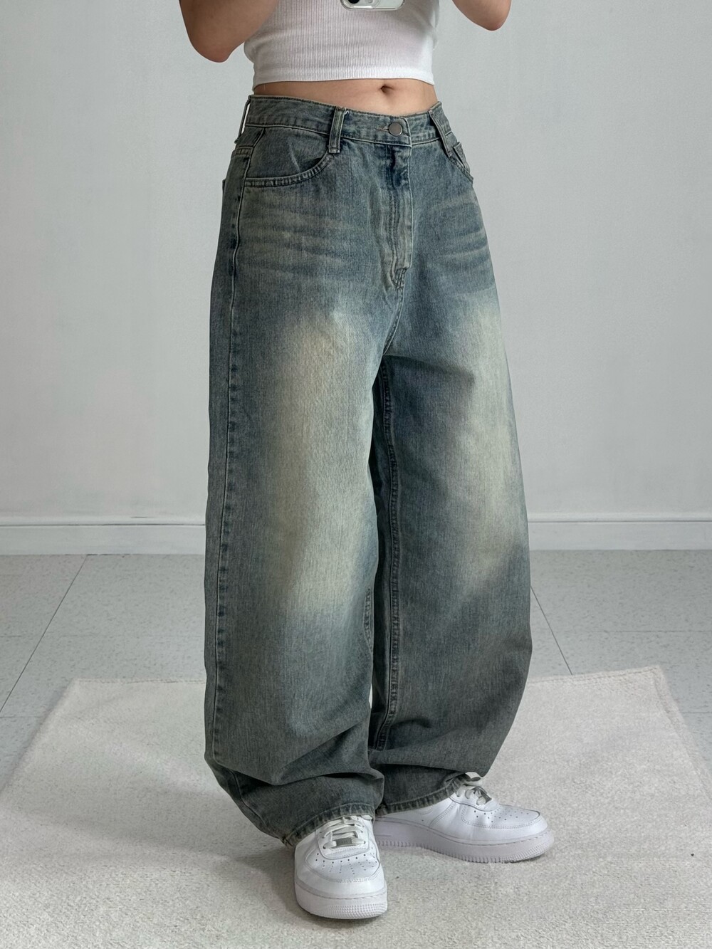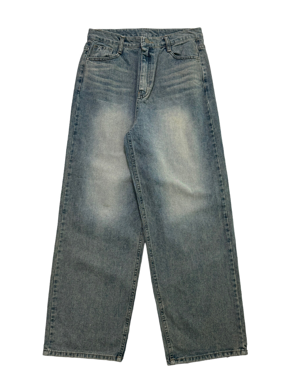 •빈티지하게 워싱이 들어간 데님 와이드 팬츠에요! 각잡힌 실루엣이 굉장히 멋스럽고 데일리로 즐겨입기 좋은 팬츠에요ㅎㅎ