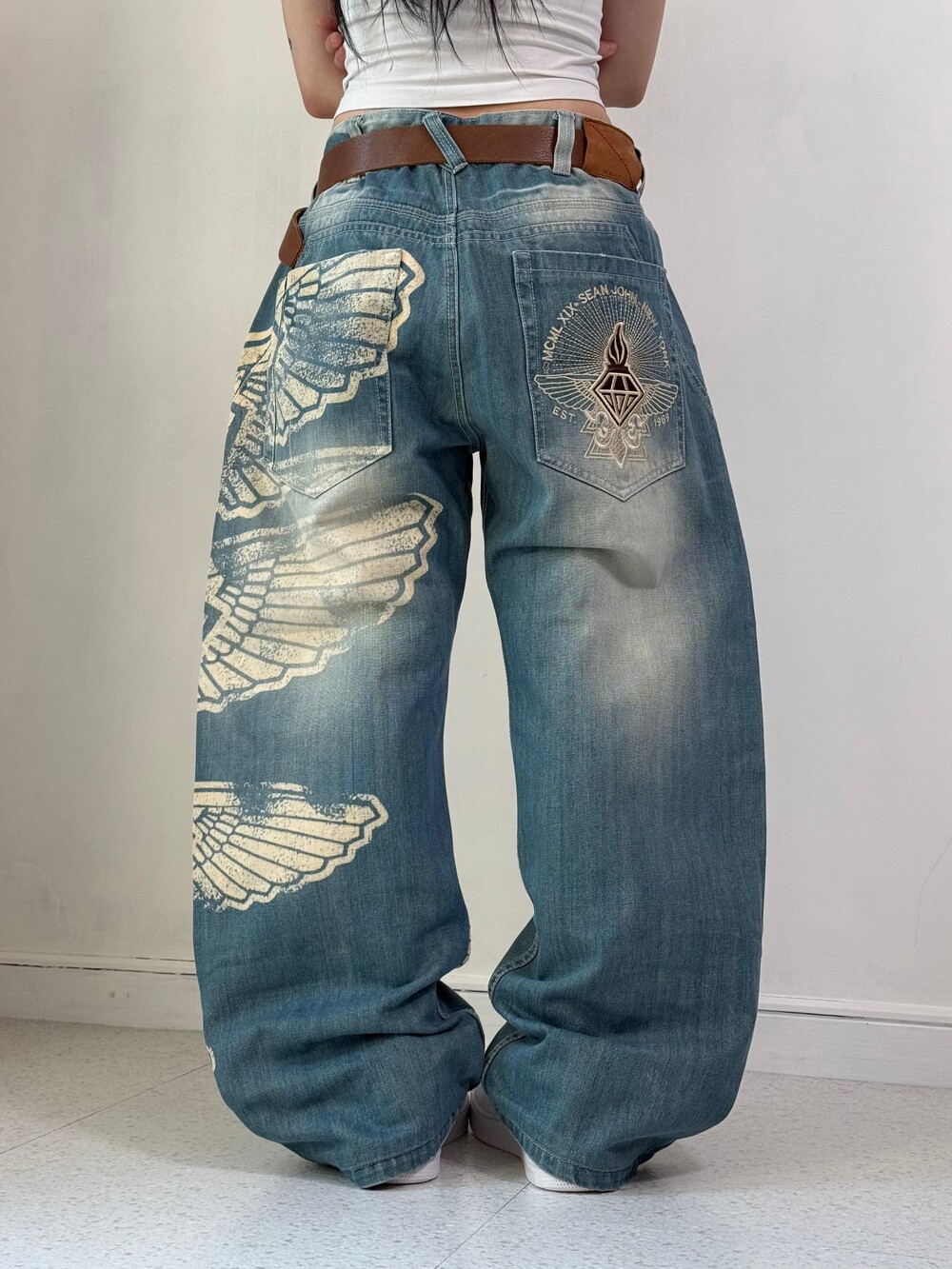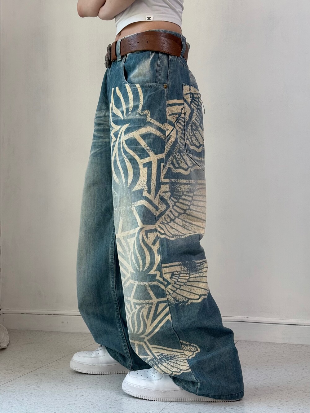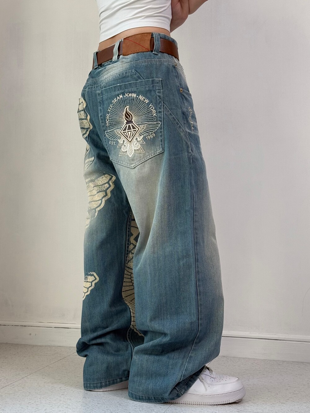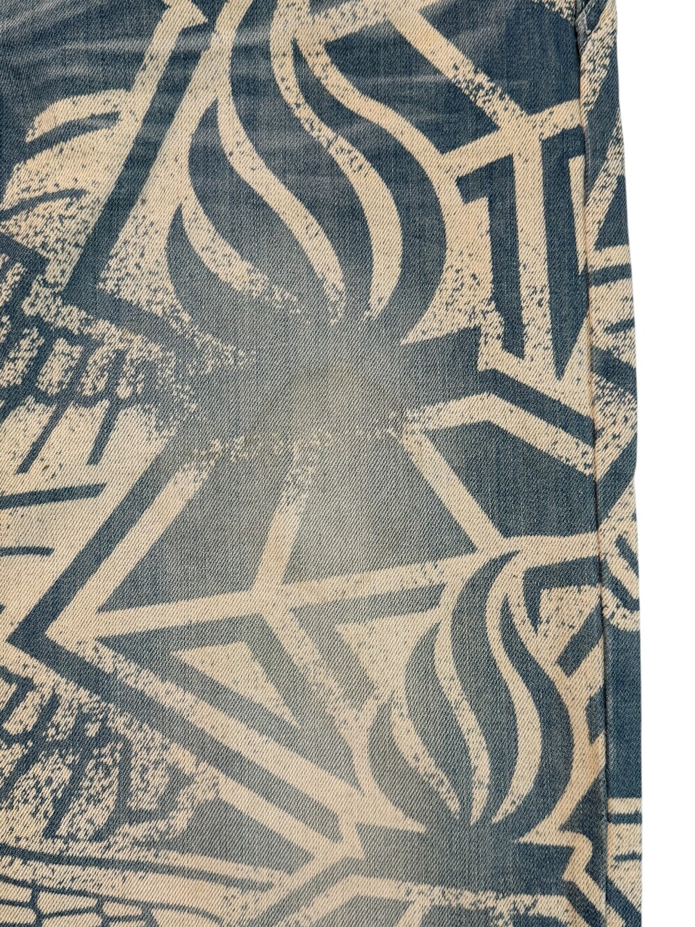•션존의 풀 프린팅 데님팬츠 입니다. 특히 엉덩이에 자수 디테일 로고가 매력적인 빈티지 팬츠에요!
