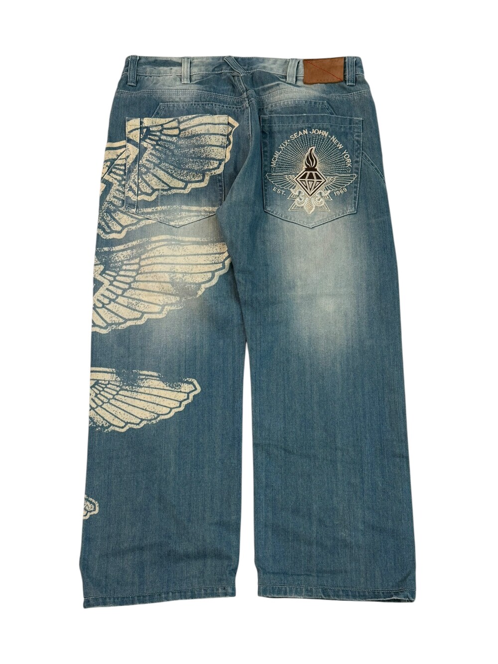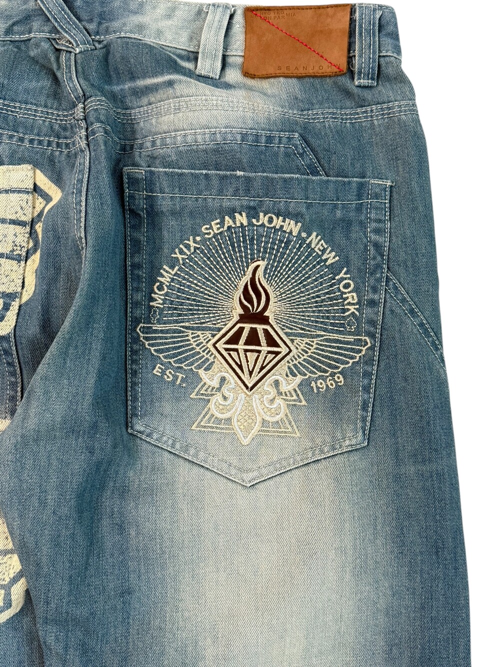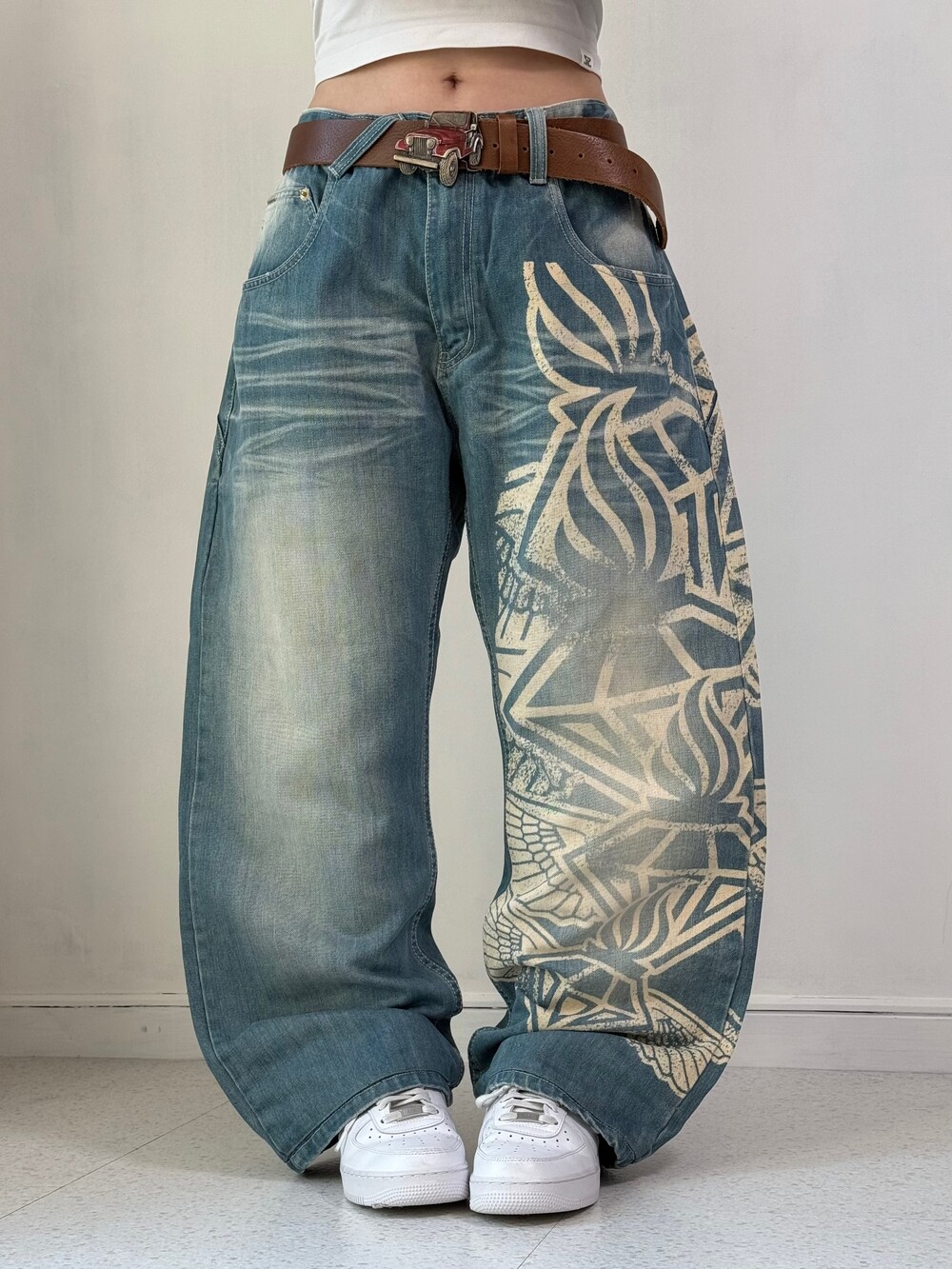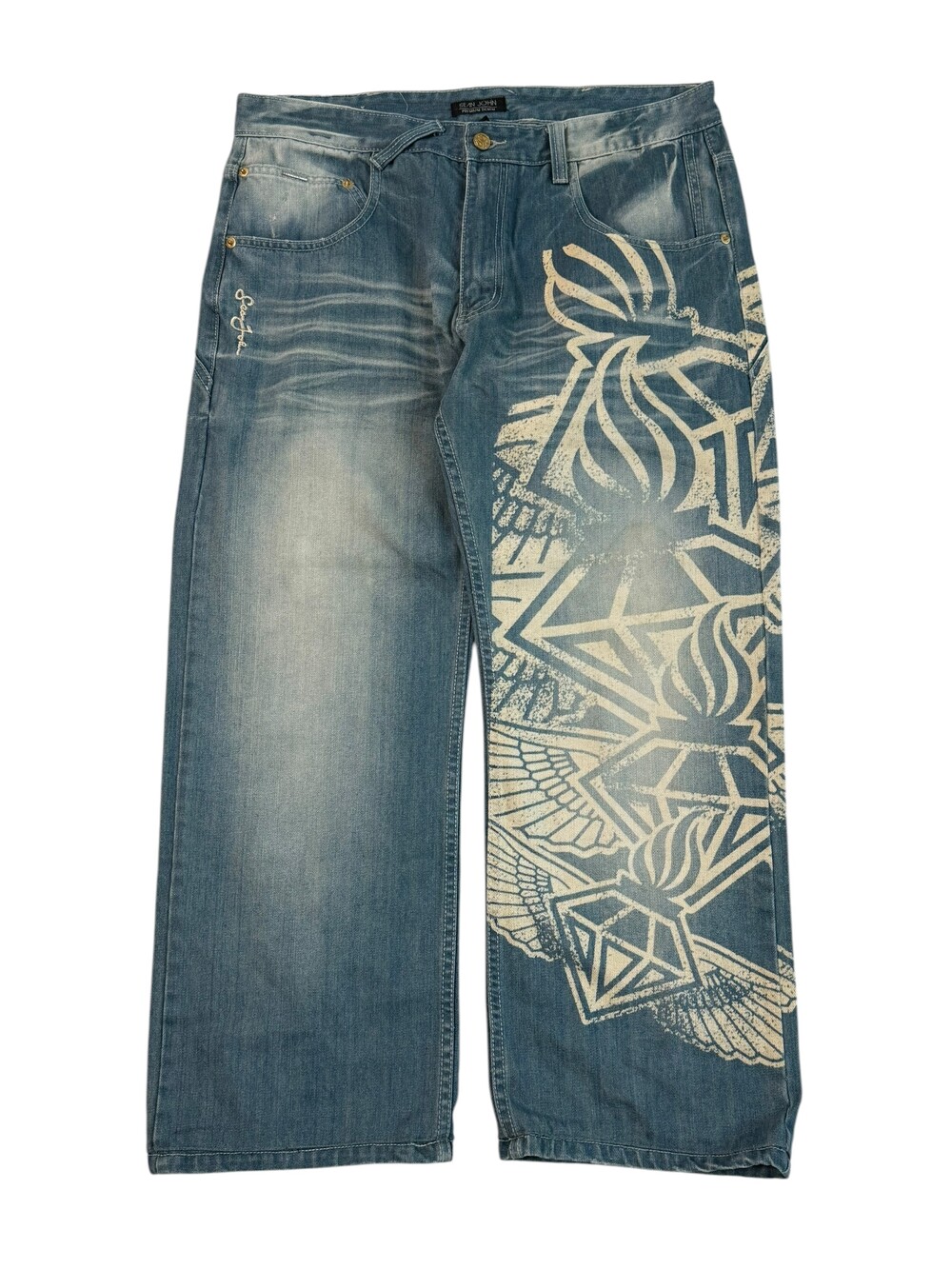 •션존의 풀 프린팅 데님팬츠 입니다. 특히 엉덩이에 자수 디테일 로고가 매력적인 빈티지 팬츠에요!