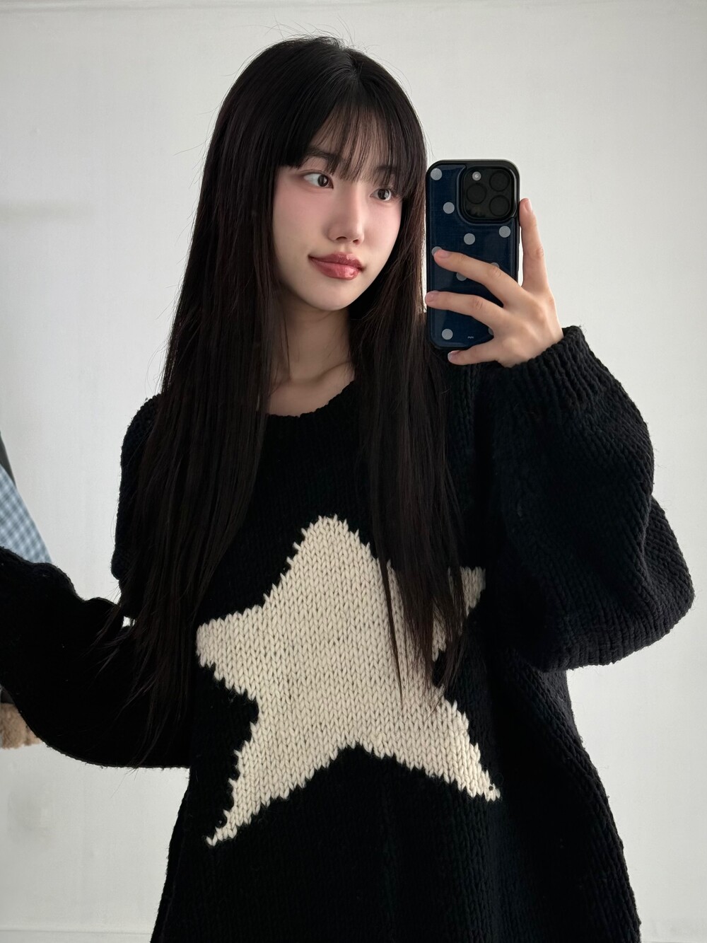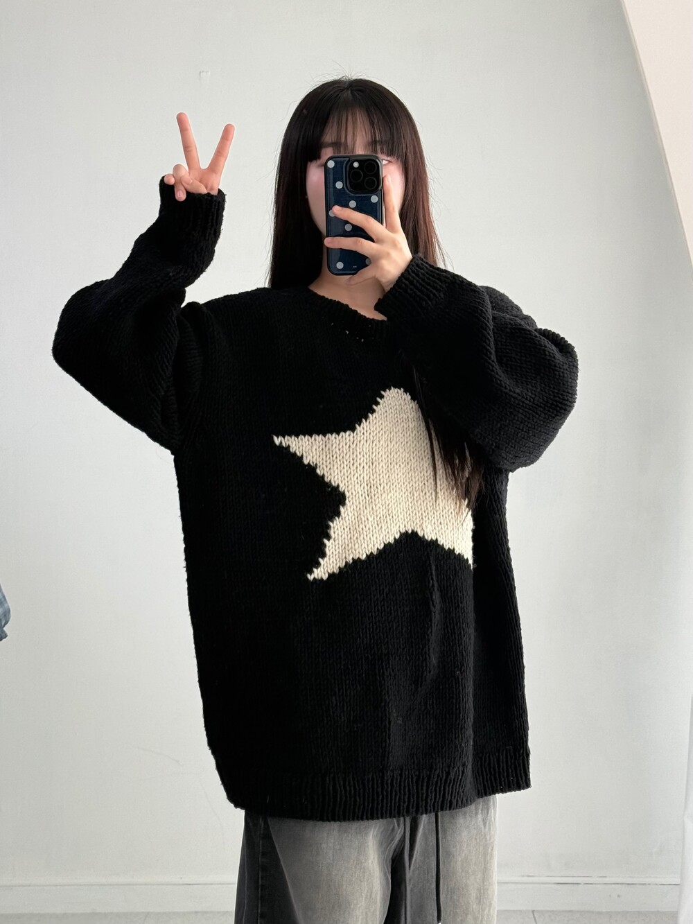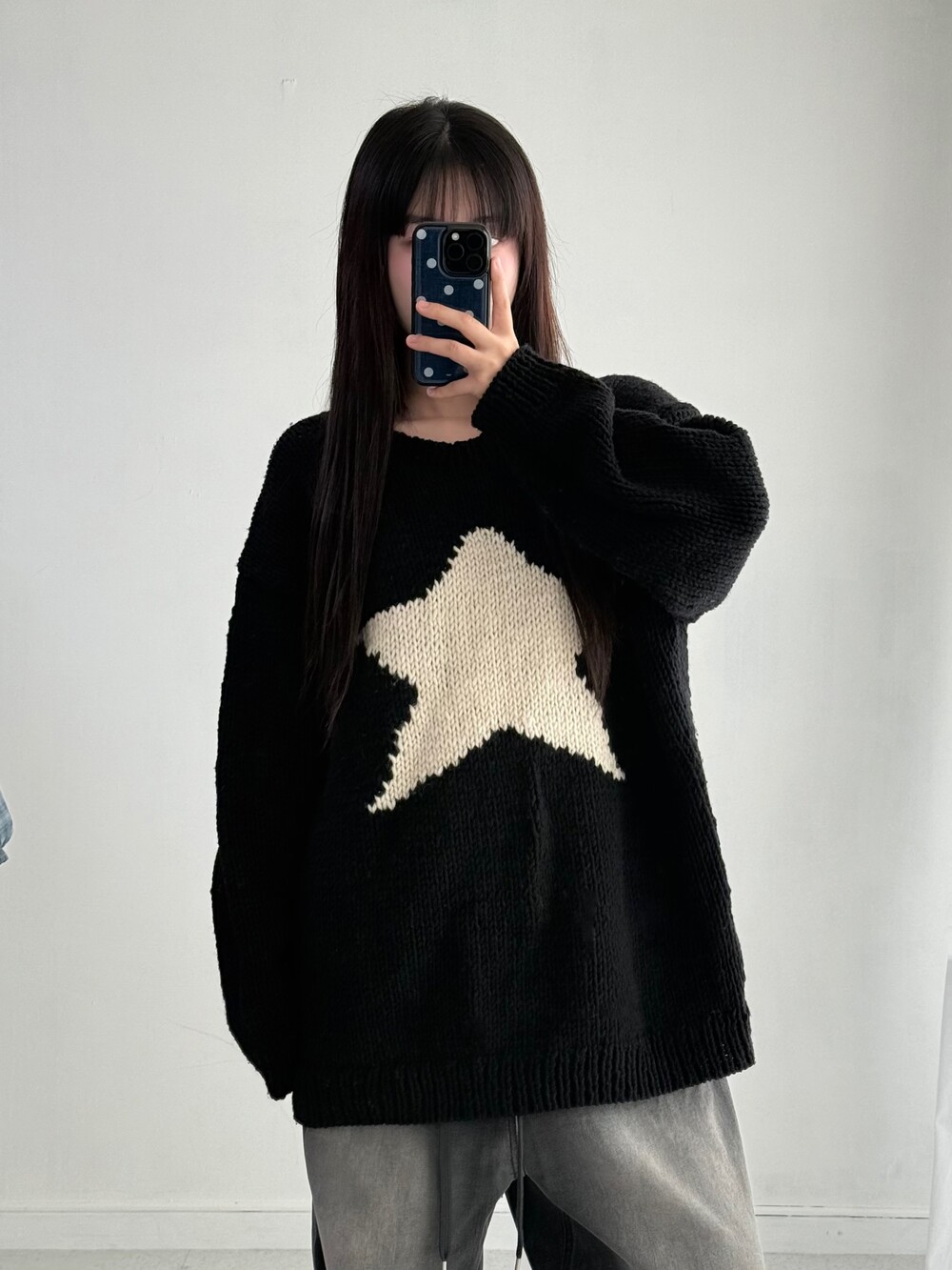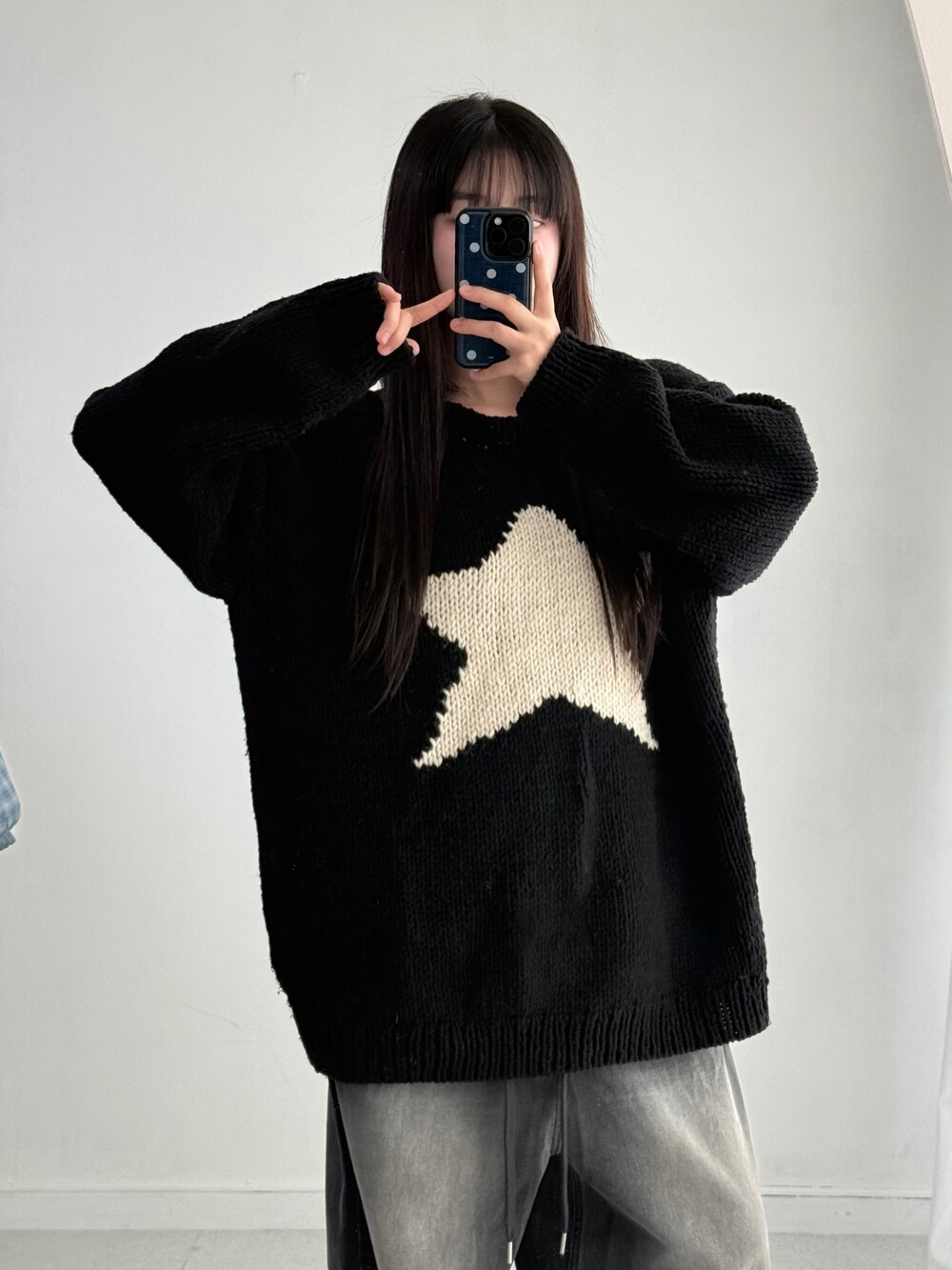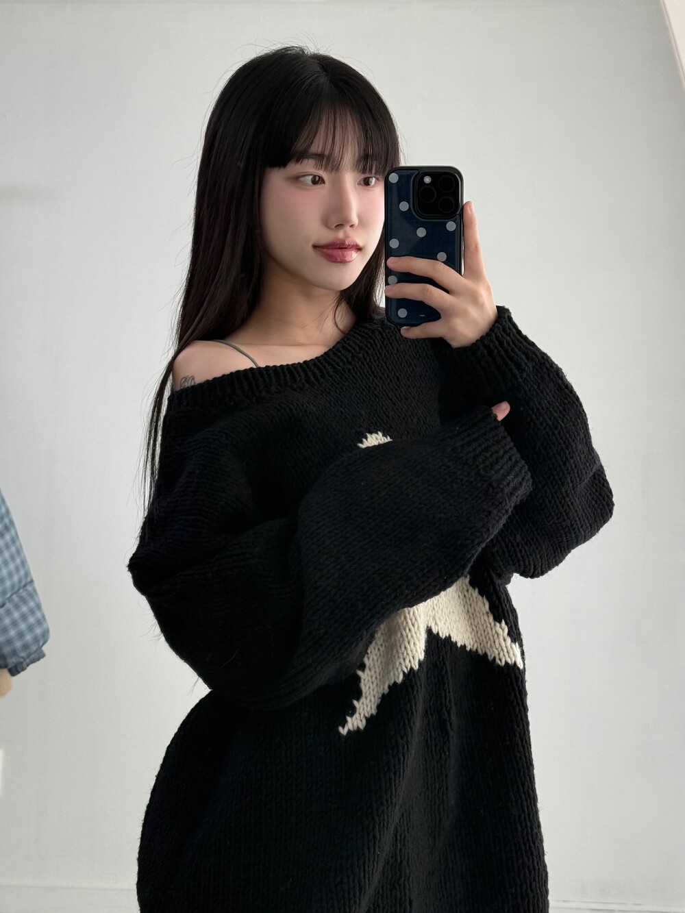 •하.. 보자마자 이거다 싶어서 가지고 온 스타 니트에요! 헤비하게 떨어지는 실루엣이 굉장히 예쁘구 살짝 어깨를 내려서 입어줘도 예쁘답니다>,<