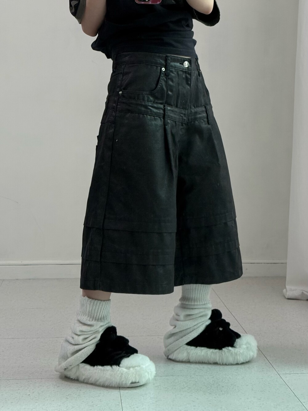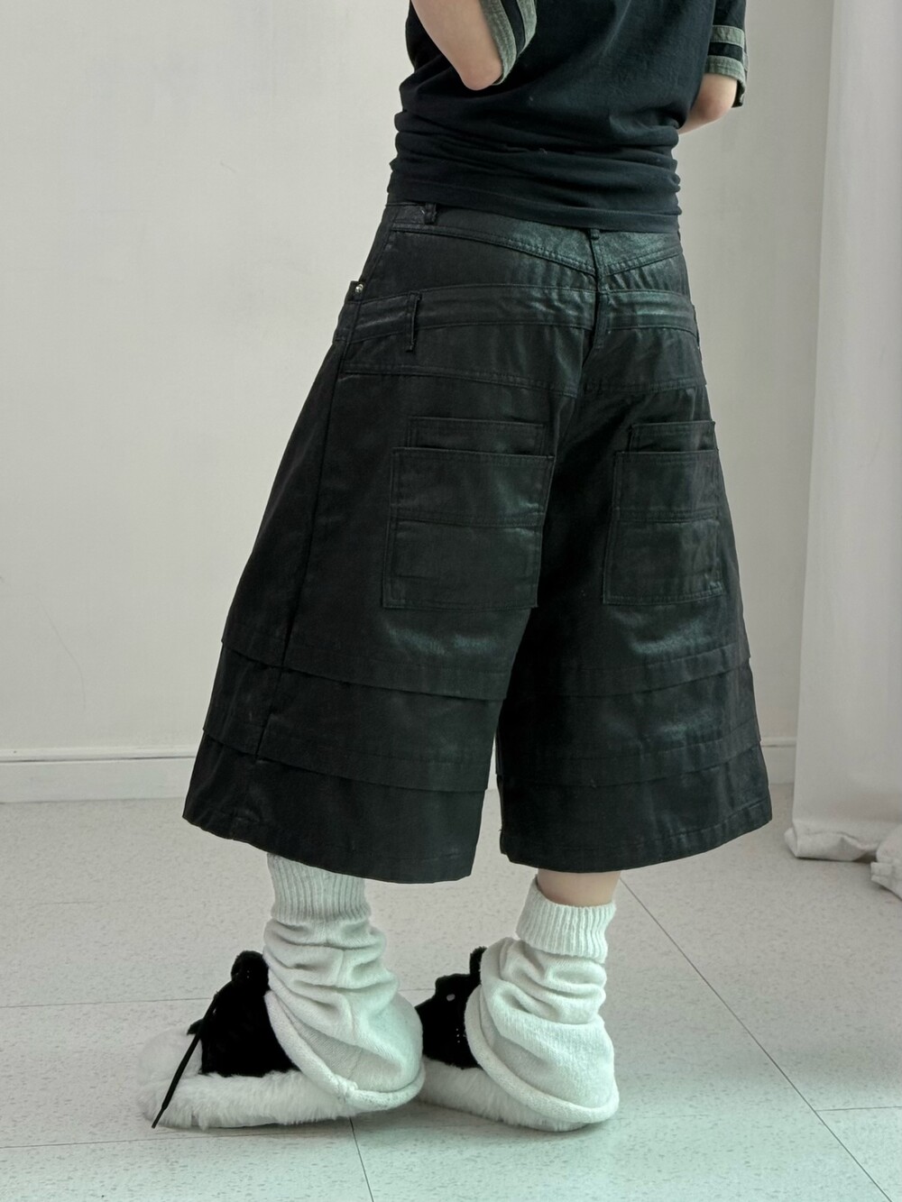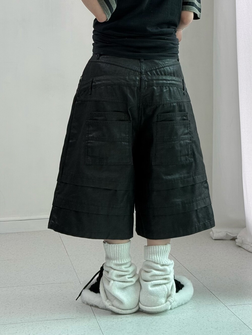 •유강의 세이지 버뮤다 팬츠 입니다. 이중구조의 허리 밴드와 3중구조의 밑단, 두개가 겹쳐져있는 뒷주머니 디테일, 여유로운 핏까지! 퀄리티 정말 좋은 팬츠에요-!