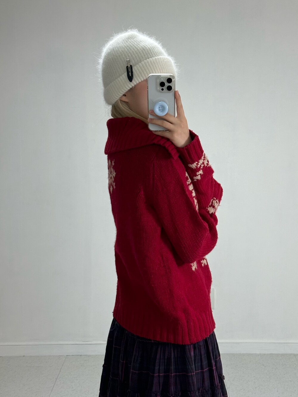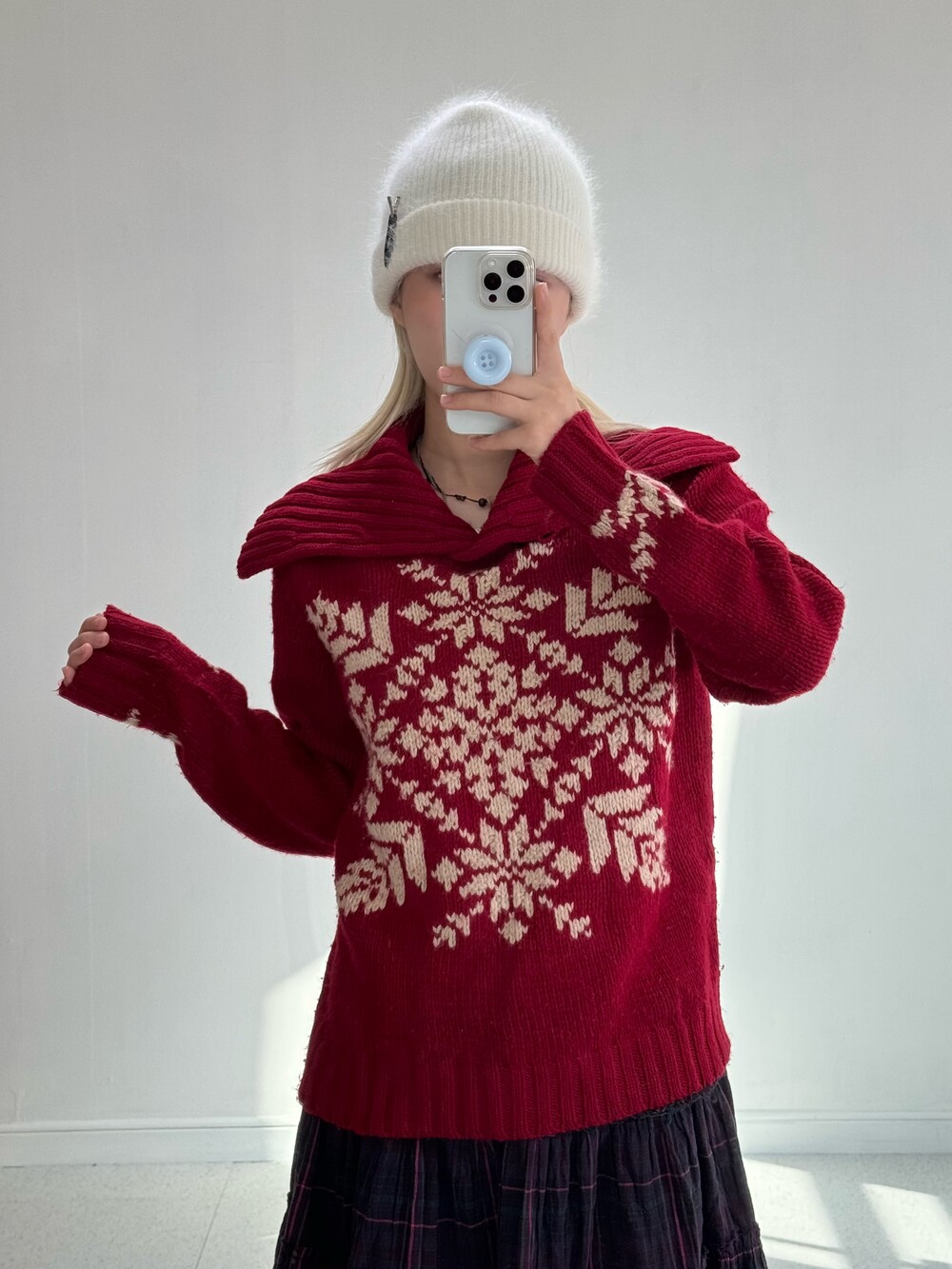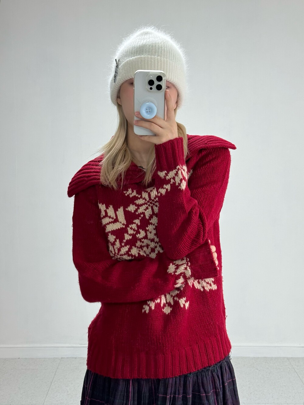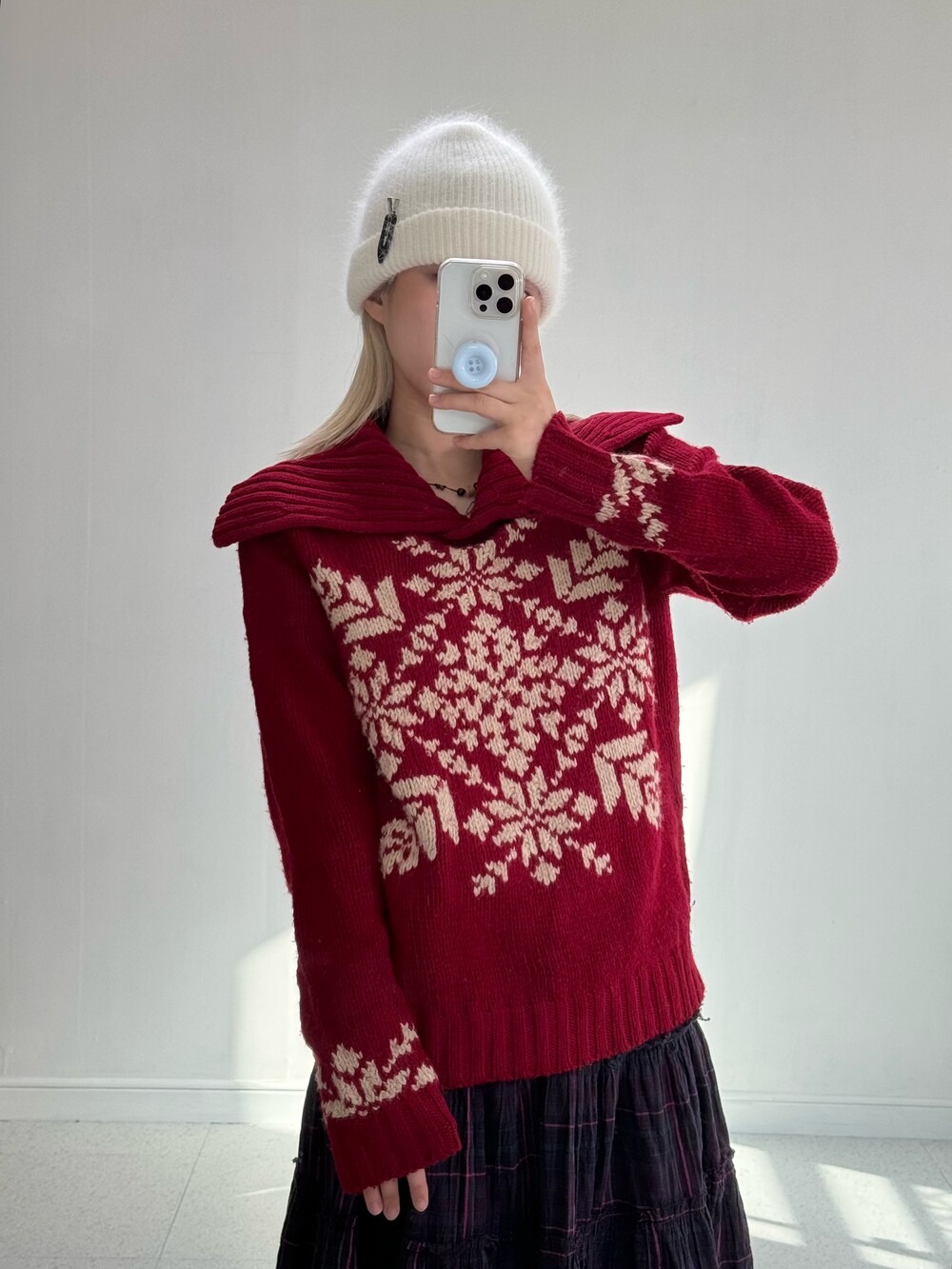 •넥라인이 케이프처럼 귀엽게 떨어지는 아주 매력적인 노르딕 니트에요! 빅눈꽃패턴이 앞에 들어가있고 소매부분도 빽포인트도.. ❤️
