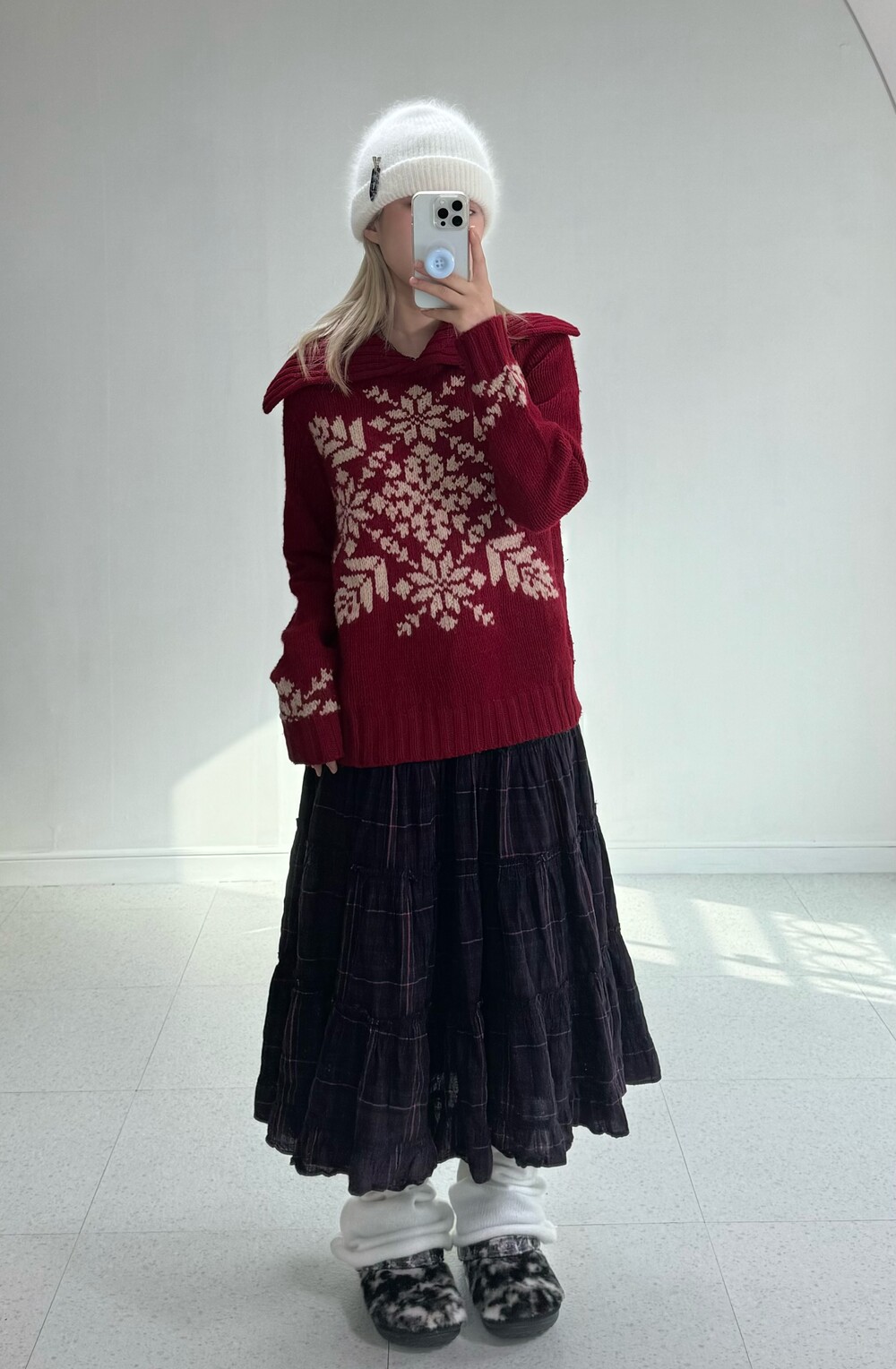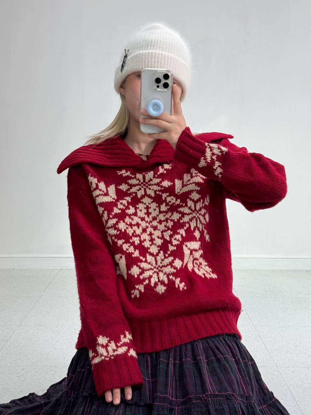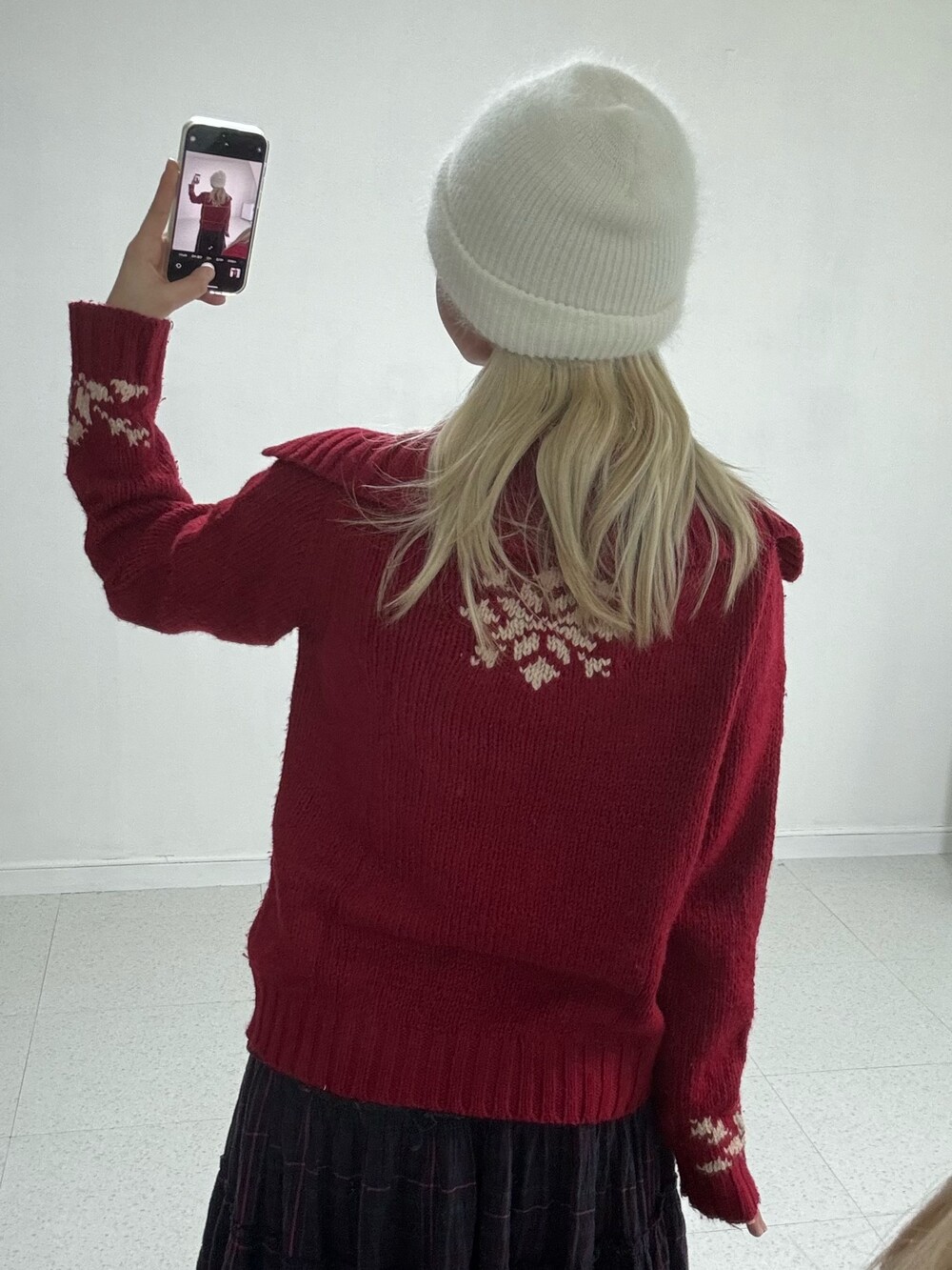 •넥라인이 케이프처럼 귀엽게 떨어지는 아주 매력적인 노르딕 니트에요! 빅눈꽃패턴이 앞에 들어가있고 소매부분도 빽포인트도.. ❤️