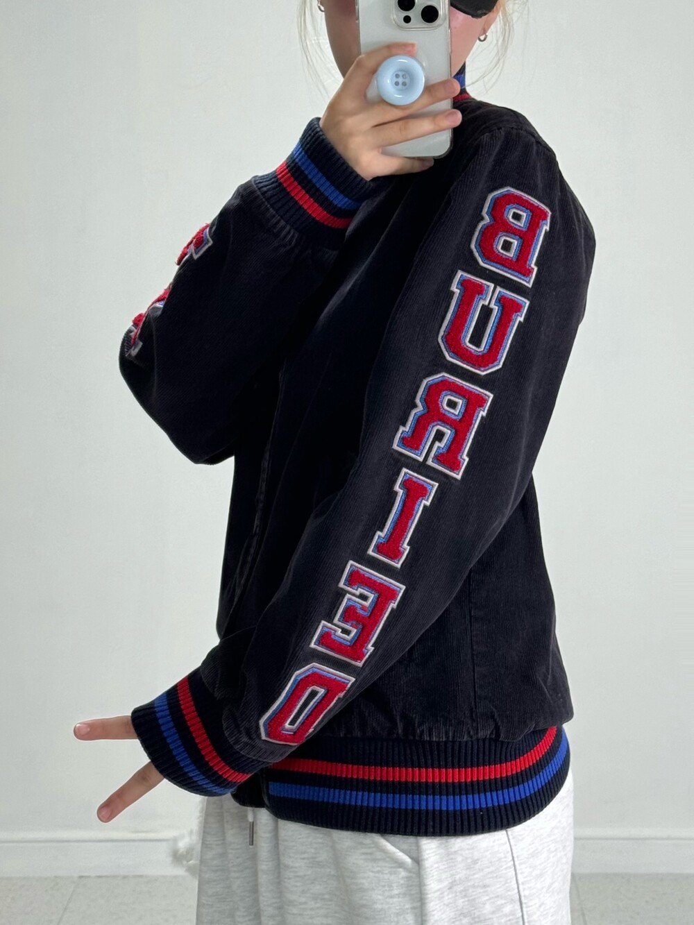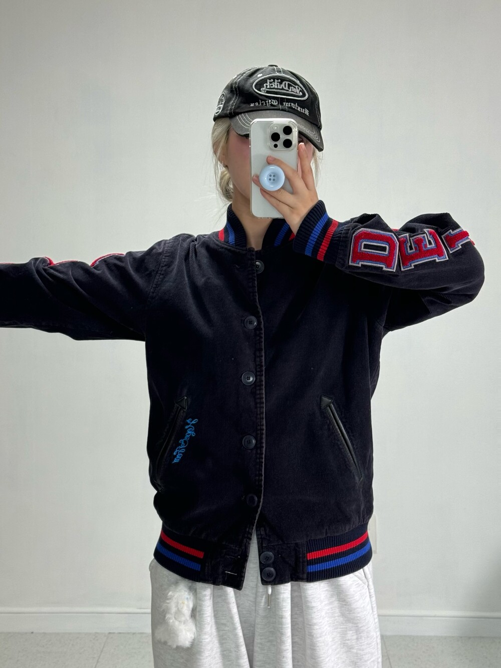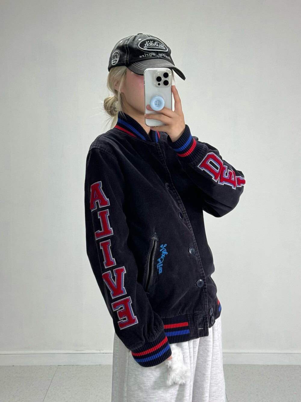 •키치한 스타일의 블랙 코듀로이 자켓 입니다! 정핏으로 착용해주시기 좋은 제품이며 와이드한 팬츠와 함께 착용해주시면 아주 굿 입니다
