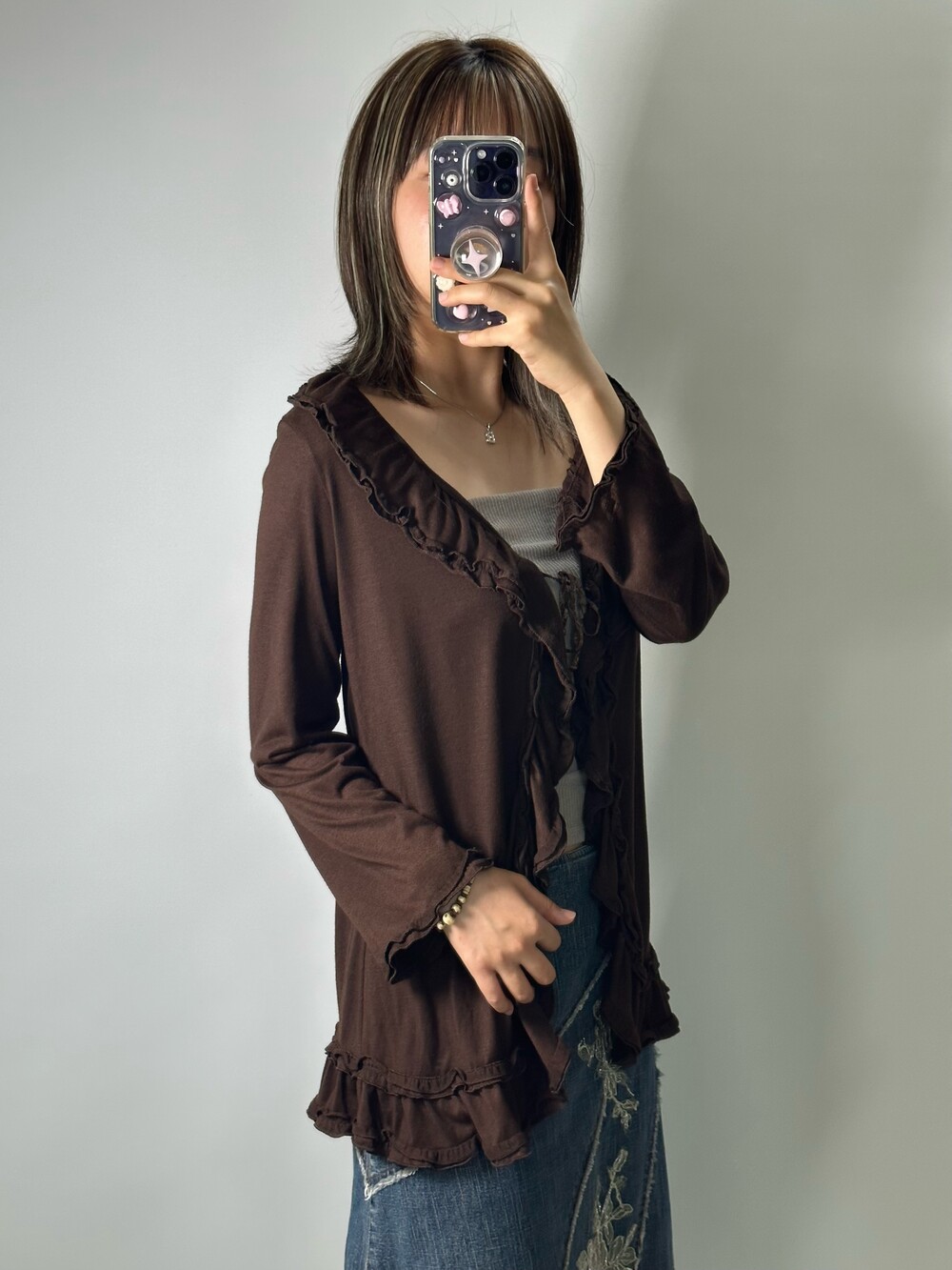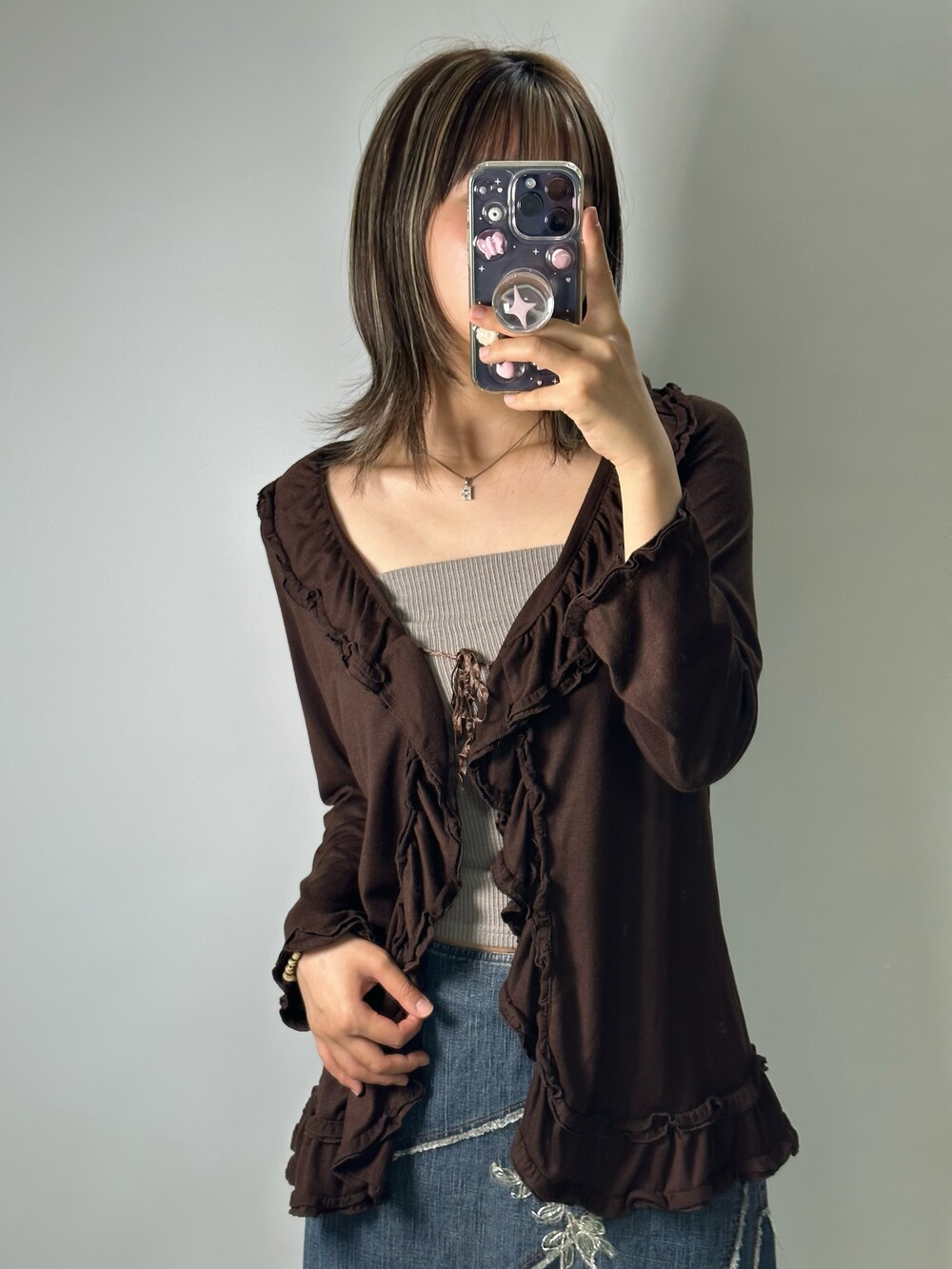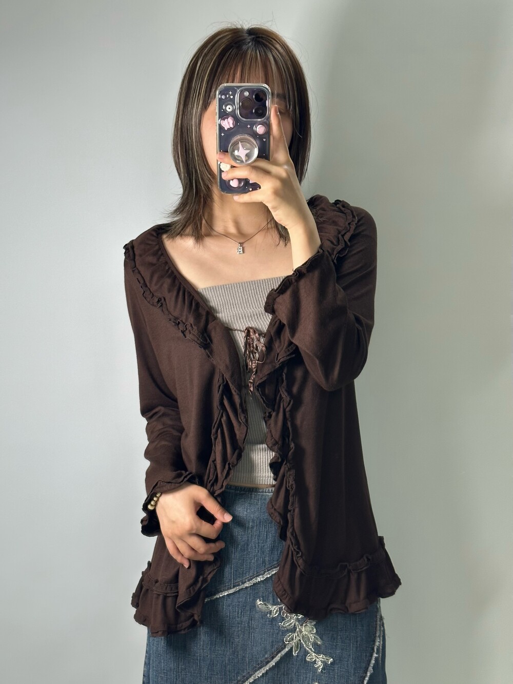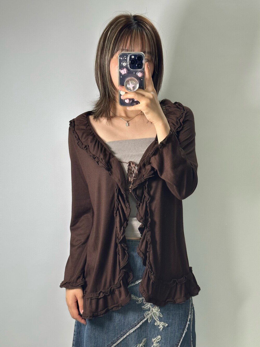 •프릴 디테일이 들어가 페어리하고 빈티지 무드가 가득한 가디건이에요! 리본을 묶어 착용하는 제품이라 더 독특한 제품이랍니다:) 원단이 부드러워서 하루종일 착용하기 부담없고 팔뚝도 얇아보이는게 정말 치트키임!