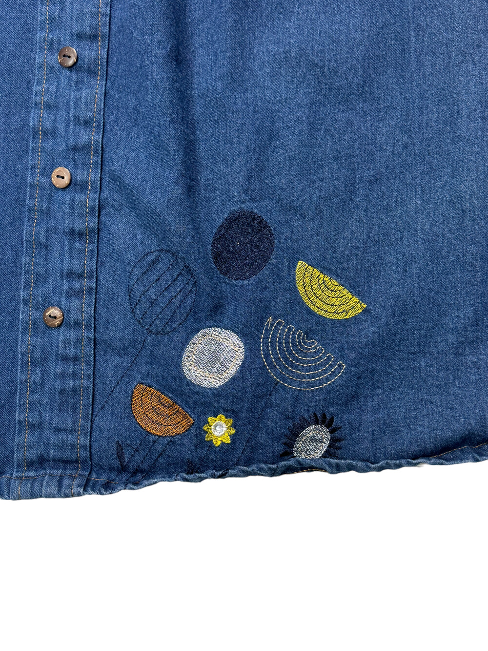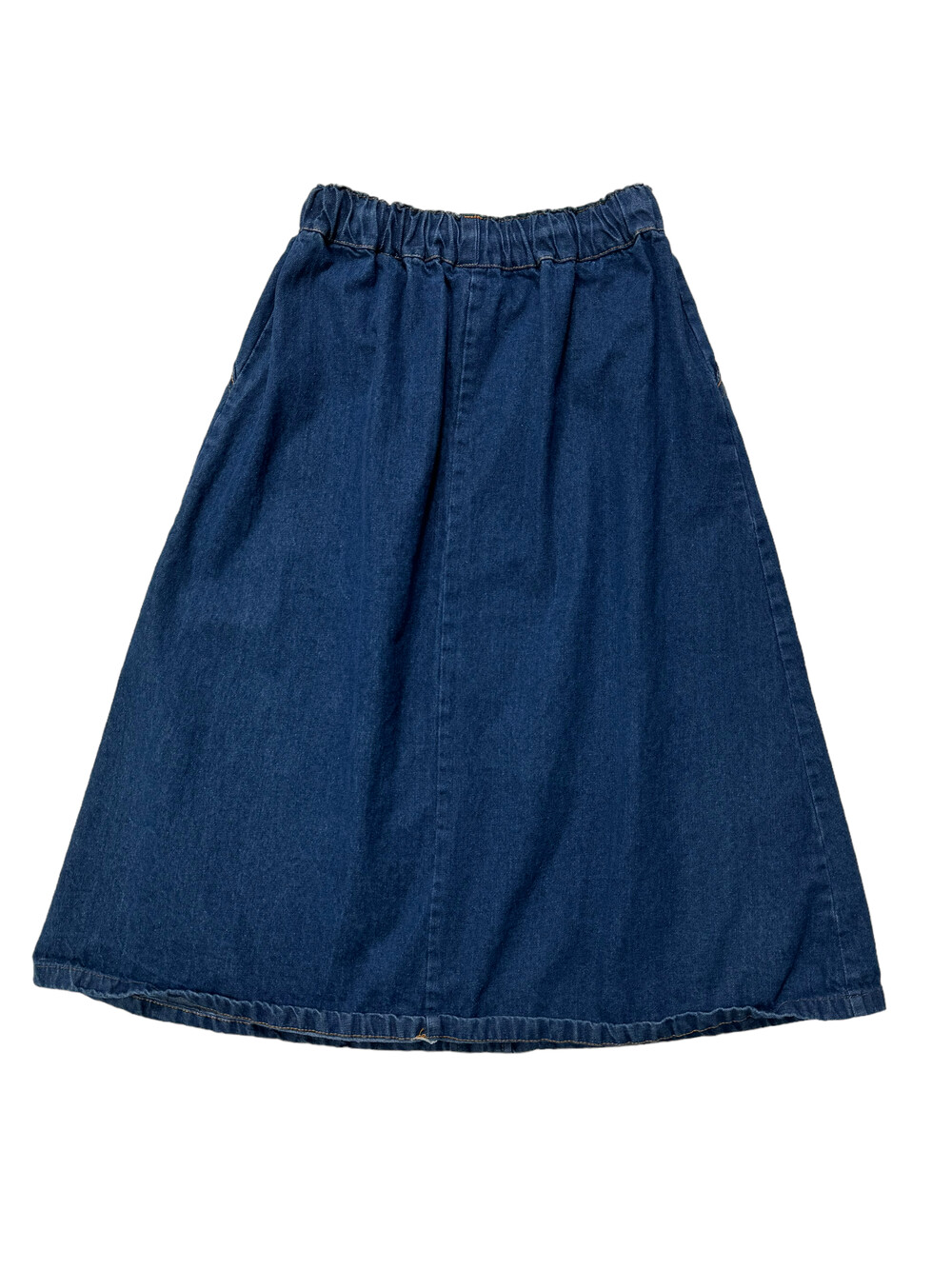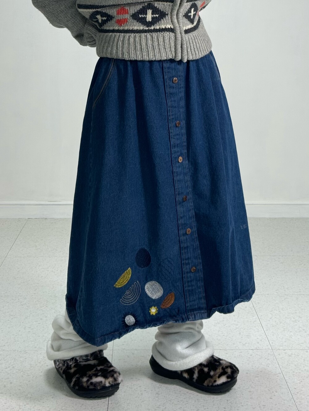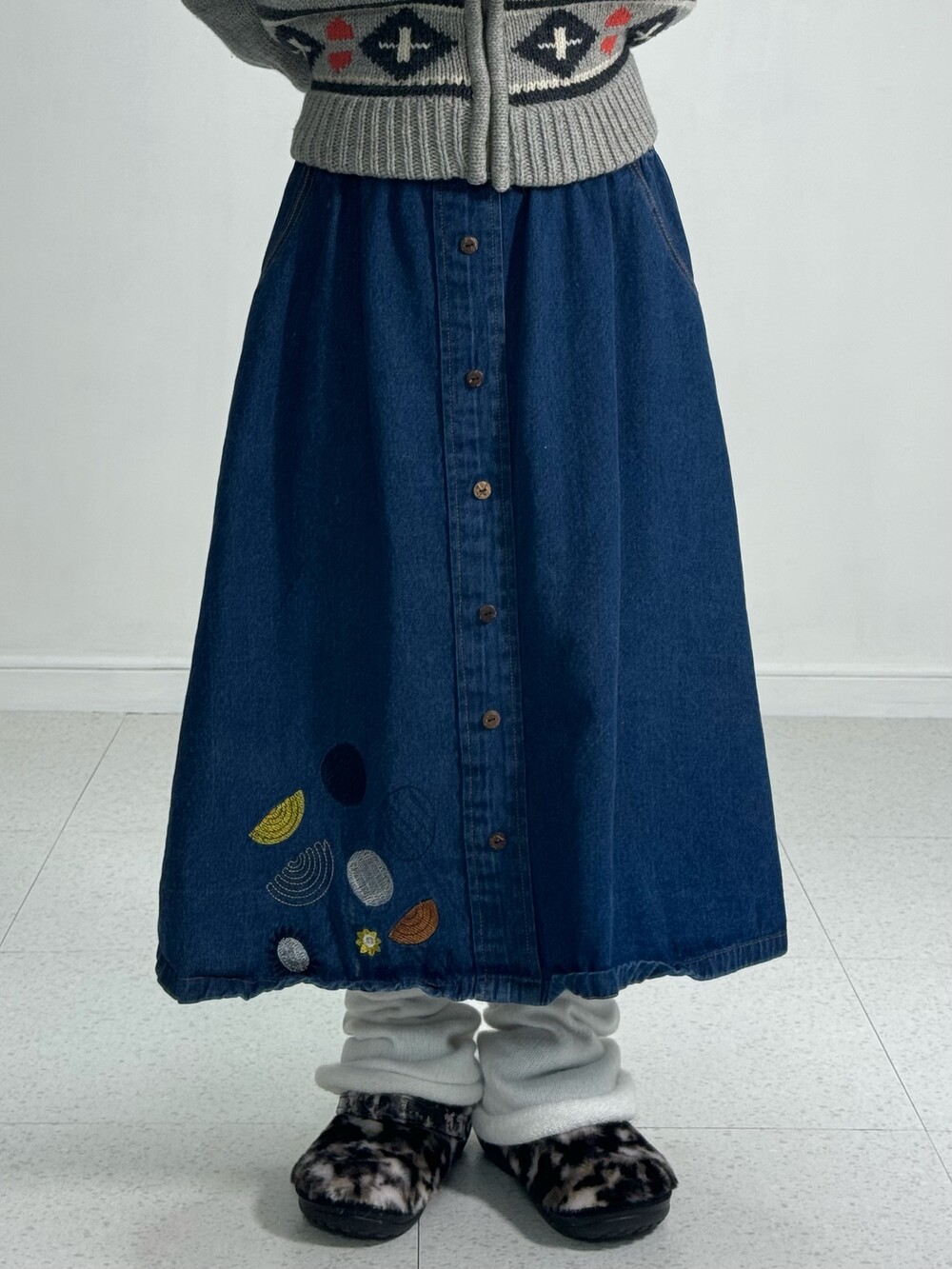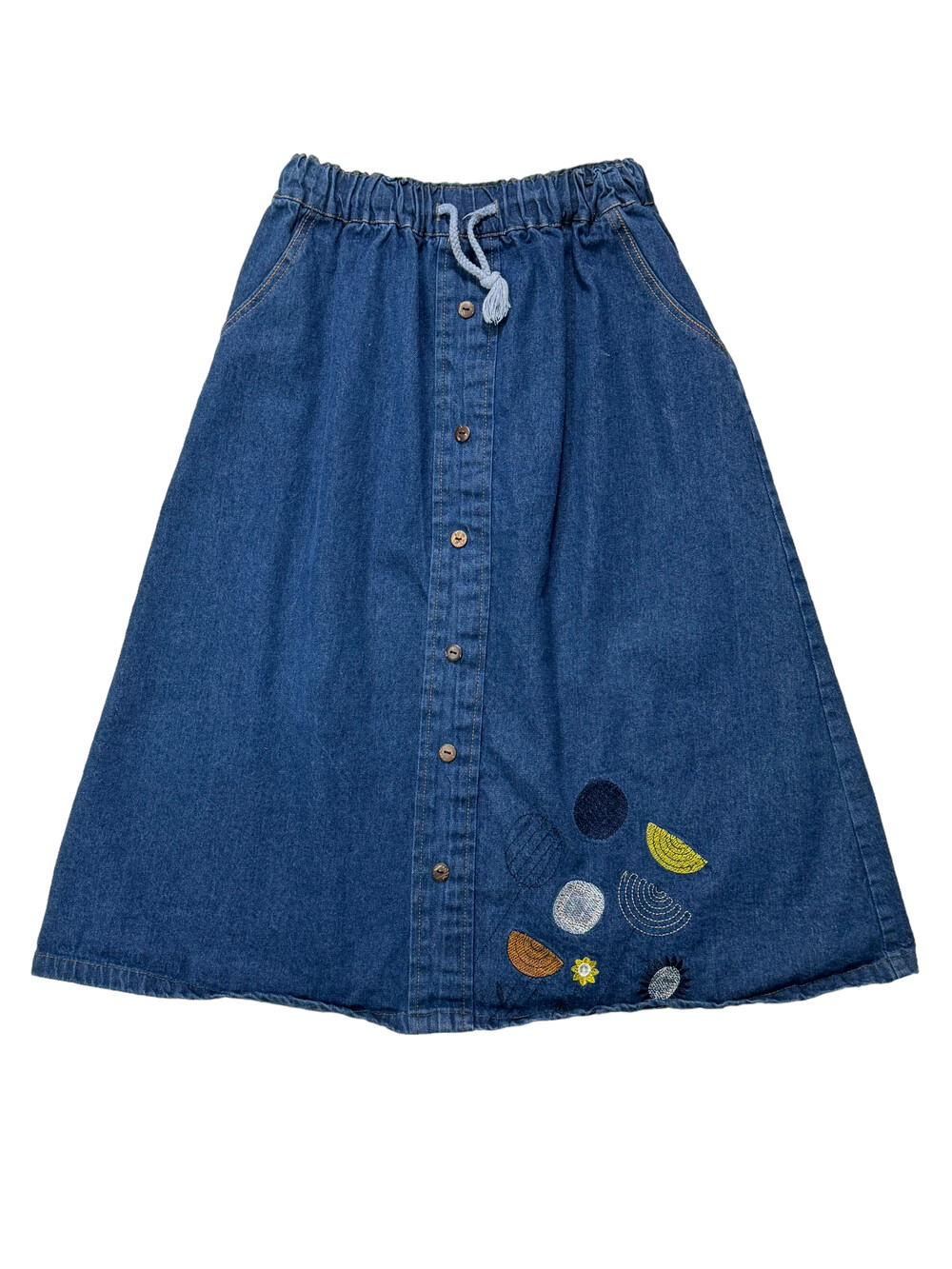 •귀여운 아방 모리걸 스타일의 데님 스커트에요! 앞쪽에는 페이크 버튼이 들어가있고 밑단에는 귀여운 자수가 들어가있답니다 !>,<