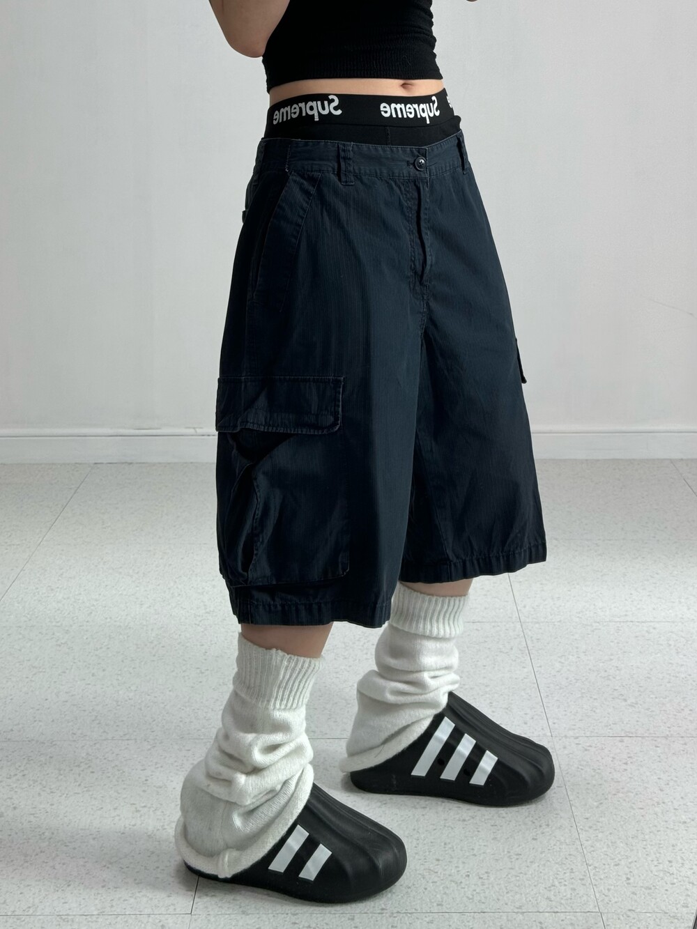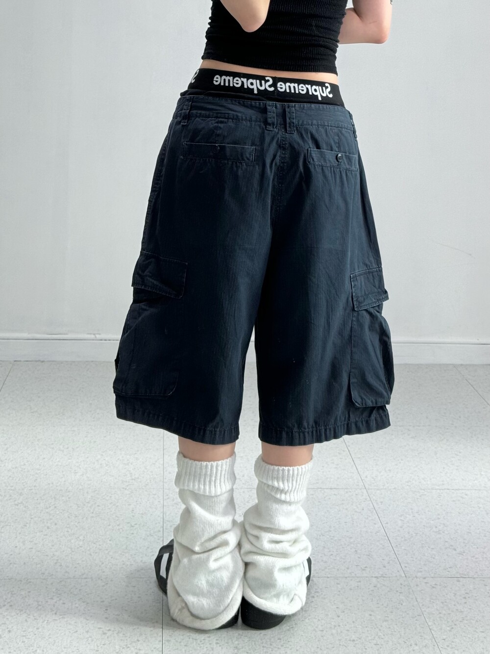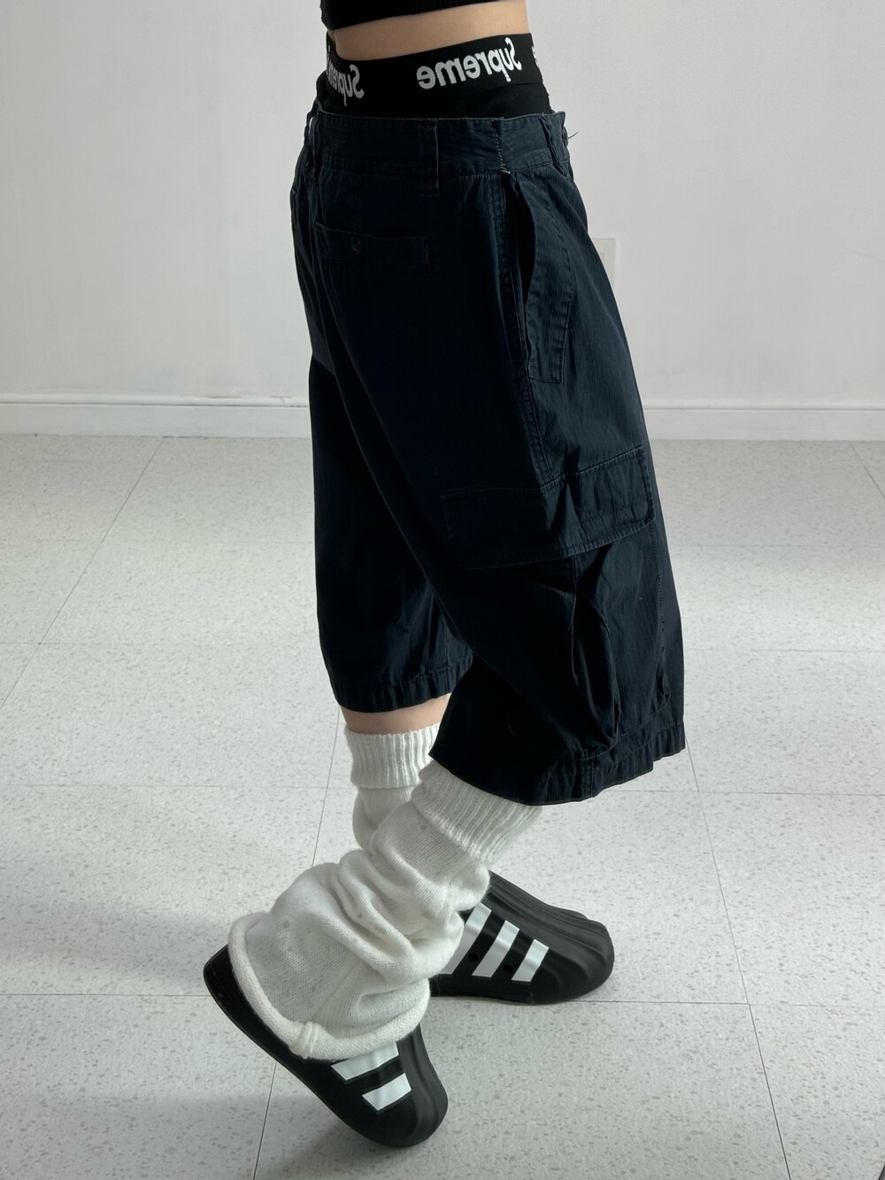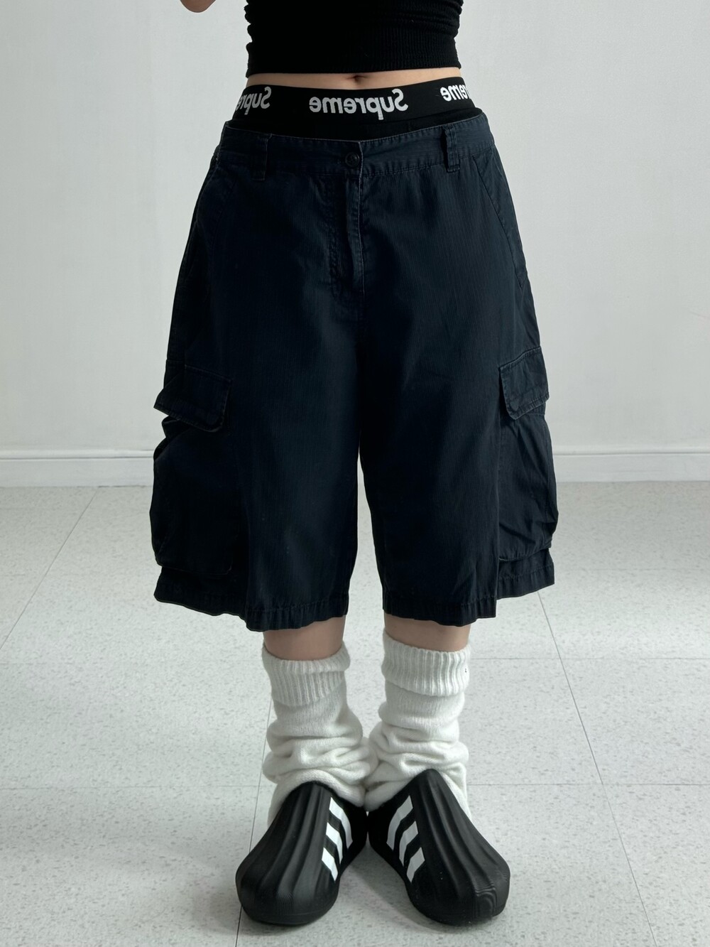 •완전 와방루즈 네이비 하프카고팬츠! 무릎도 낭낭하게 덮어줘서 넘 마음에 드는거있죠.. 컬러도 데일리 컬러라 여러 상의와도 매치가 좋아요:)